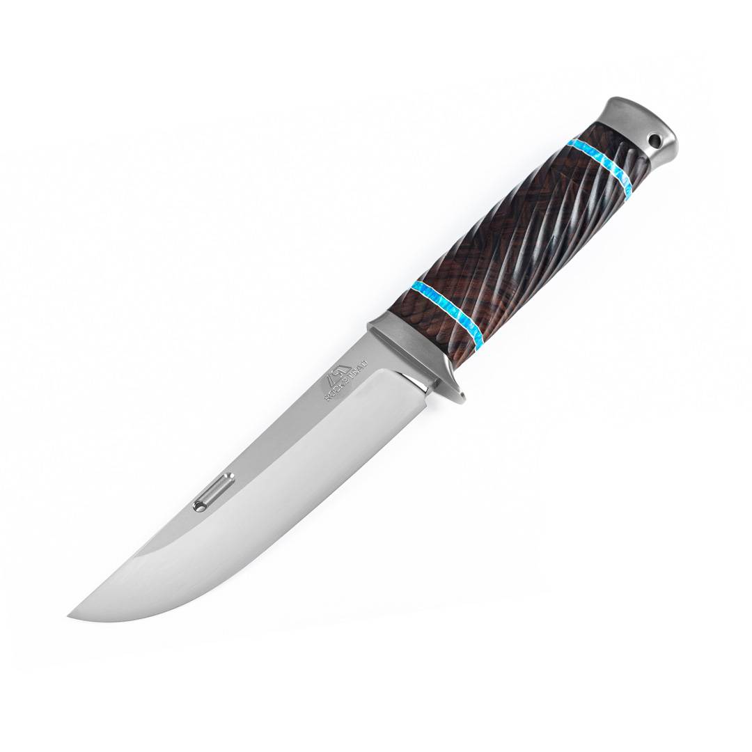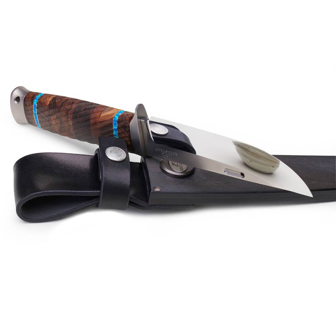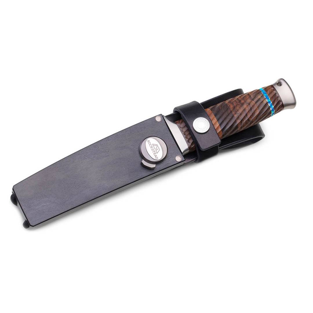 配套的鞘套采用木质马卡塔材质,并配有皮革。鞘套规格为238 x 48 x 24毫米,带有锁定系统,方便携带。