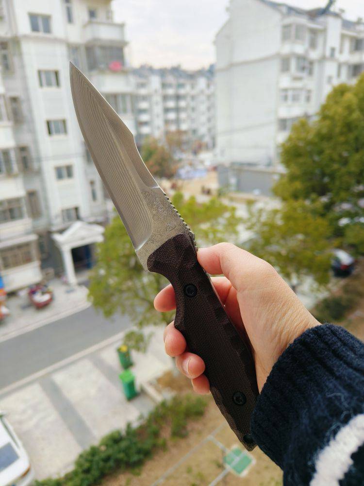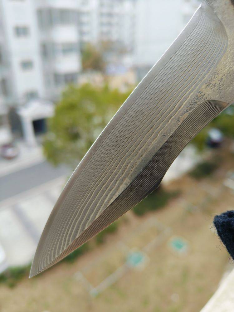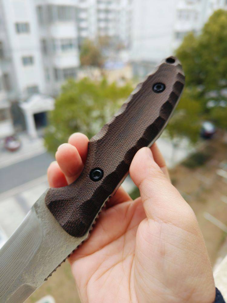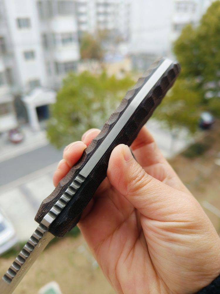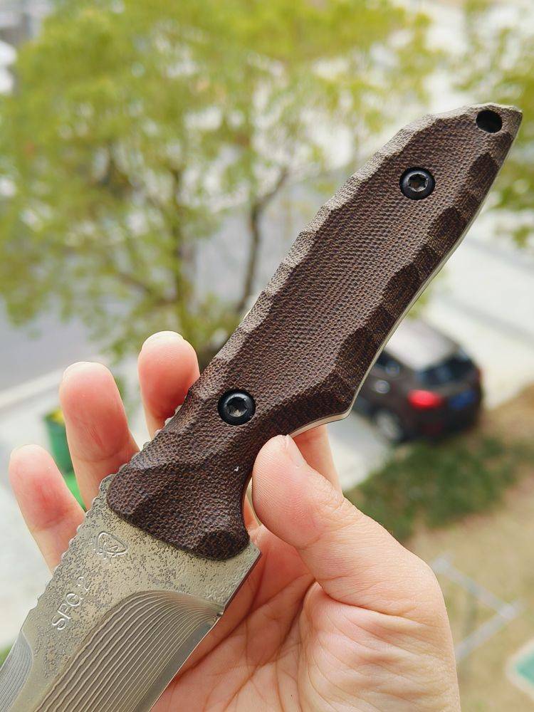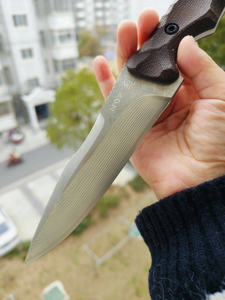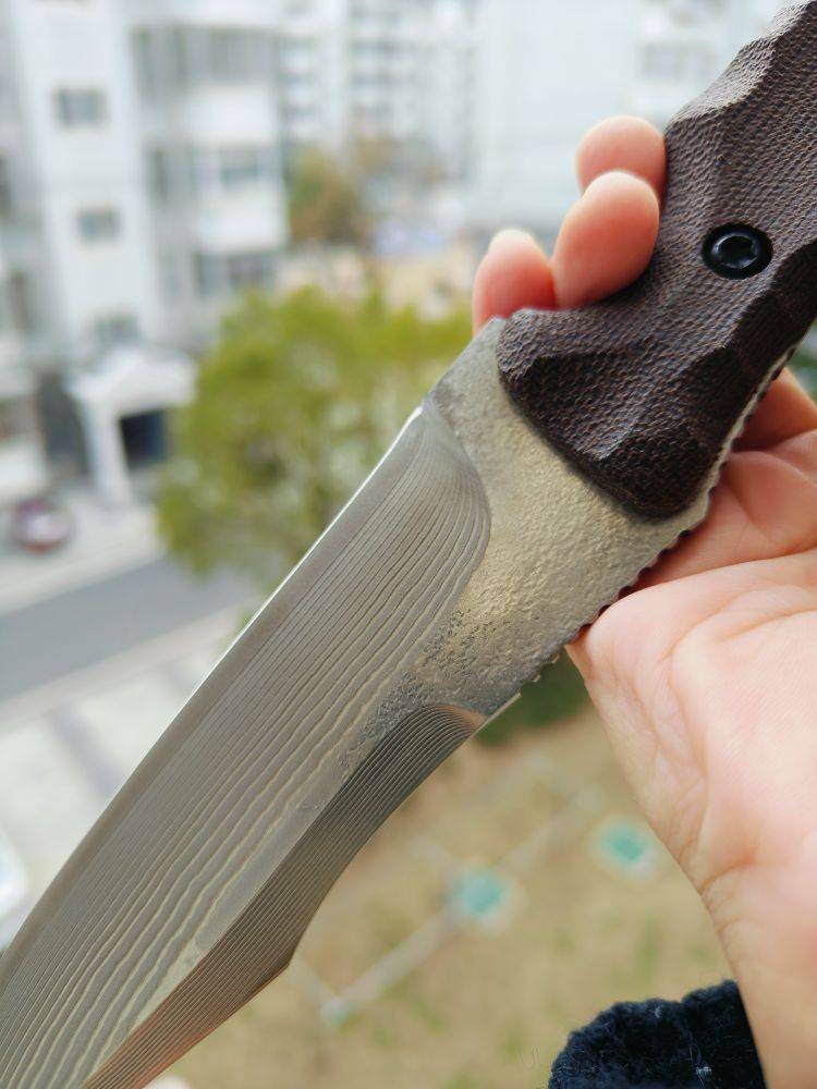 这款秋风是菊男最新推出的轻量级战术直刃作品。刃身使用日本武生特殊钢公司研制开发的改良型粉末高速不锈钢工具钢——SPG2锻造,钢材的出色性能和菊男出色的打磨相映成辉。这款直刃采用层锻式手法锻造,刃身呈现均匀的层叠纹路。刃身采用平磨手法处理,锋利度和切削手感上佳。刃头部分呈现针尖样式,再配上刃背前端可帮助分开肌肉的狭长假刃,让刃具的穿刺能力也同样出色。这款作品刃身表面并没有采用菊男惯用的蚀刻花纹处理,而是进行表面微蚀刻使其呈现海浪纹路。刃背除了假刃设计外,还在中后部位拥有减压设计,可以在执行穿刺任务时减轻刃头压力。刃根后部拥有两段式滚花凹槽,方便不同使用习惯的用户进行操纵。刃身一侧刻有“菊”字Logo和钢材标号。