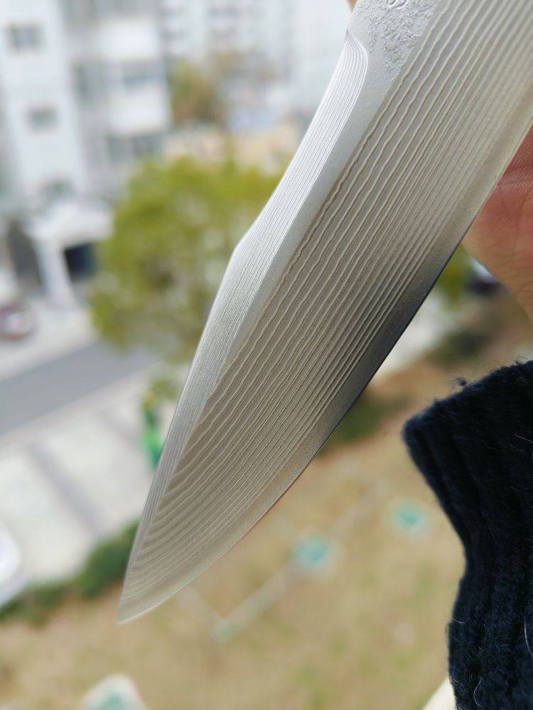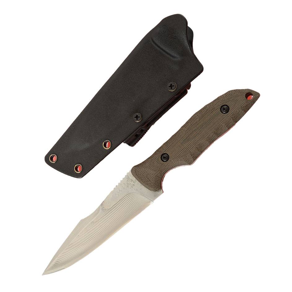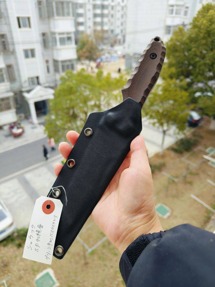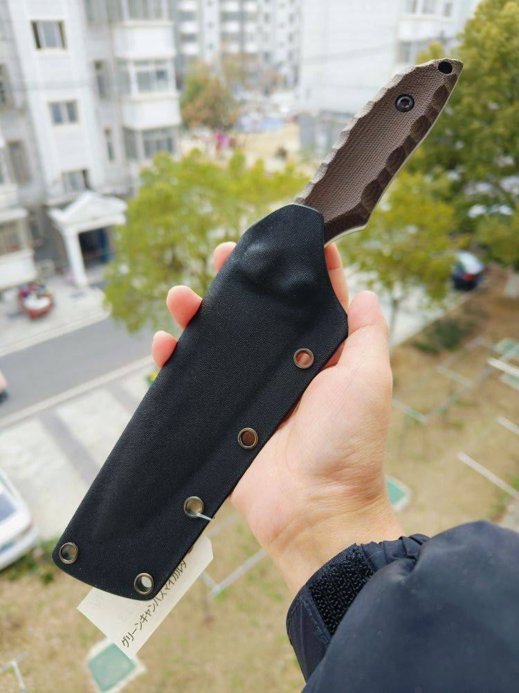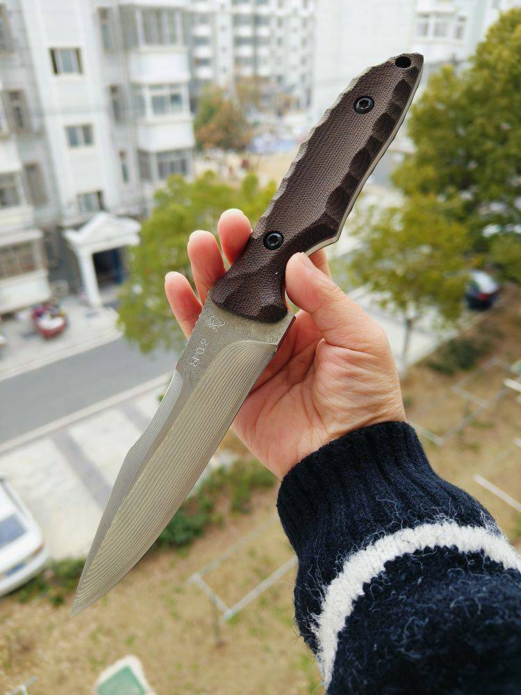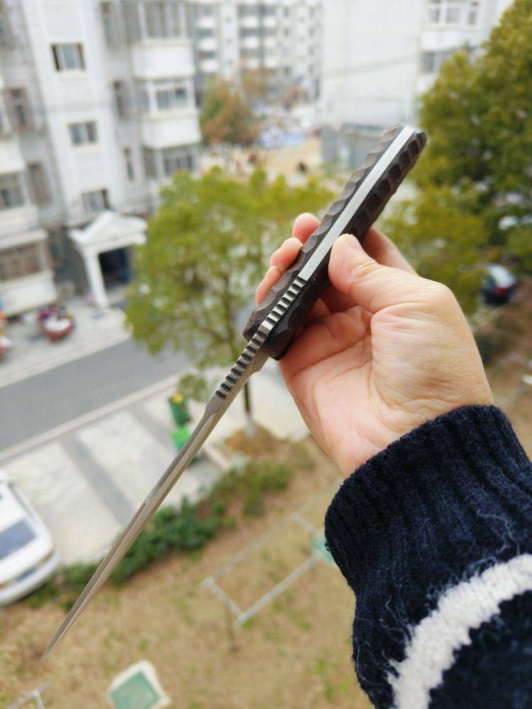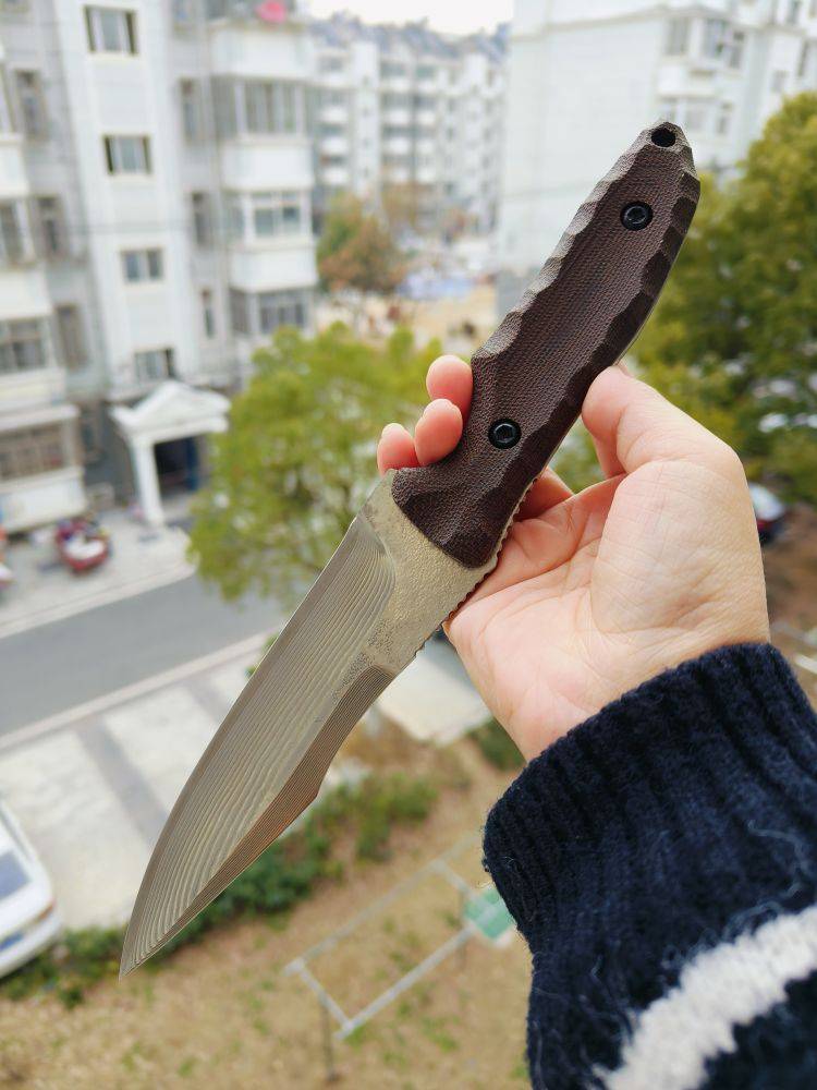 这款秋风是菊男最新推出的轻量级战术直刃作品。刃身使用日本武生特殊钢公司研制开发的改良型粉末高速不锈钢工具钢——SPG2锻造,钢材的出色性能和菊男出色的打磨相映成辉。这款直刃采用层锻式手法锻造,刃身呈现均匀的层叠纹路。刃身采用平磨手法处理,锋利度和切削手感上佳。刃头部分呈现针尖样式,再配上刃背前端可帮助分开肌肉的狭长假刃,让刃具的穿刺能力也同样出色。这款作品刃身表面并没有采用菊男惯用的蚀刻花纹处理,而是进行表面微蚀刻使其呈现海浪纹路。刃背除了假刃设计外,还在中后部位拥有减压设计,可以在执行穿刺任务时减轻刃头压力。刃根后部拥有两段式滚花凹槽,方便不同使用习惯的用户进行操纵。刃身一侧刻有“菊”字Logo和钢材标号。