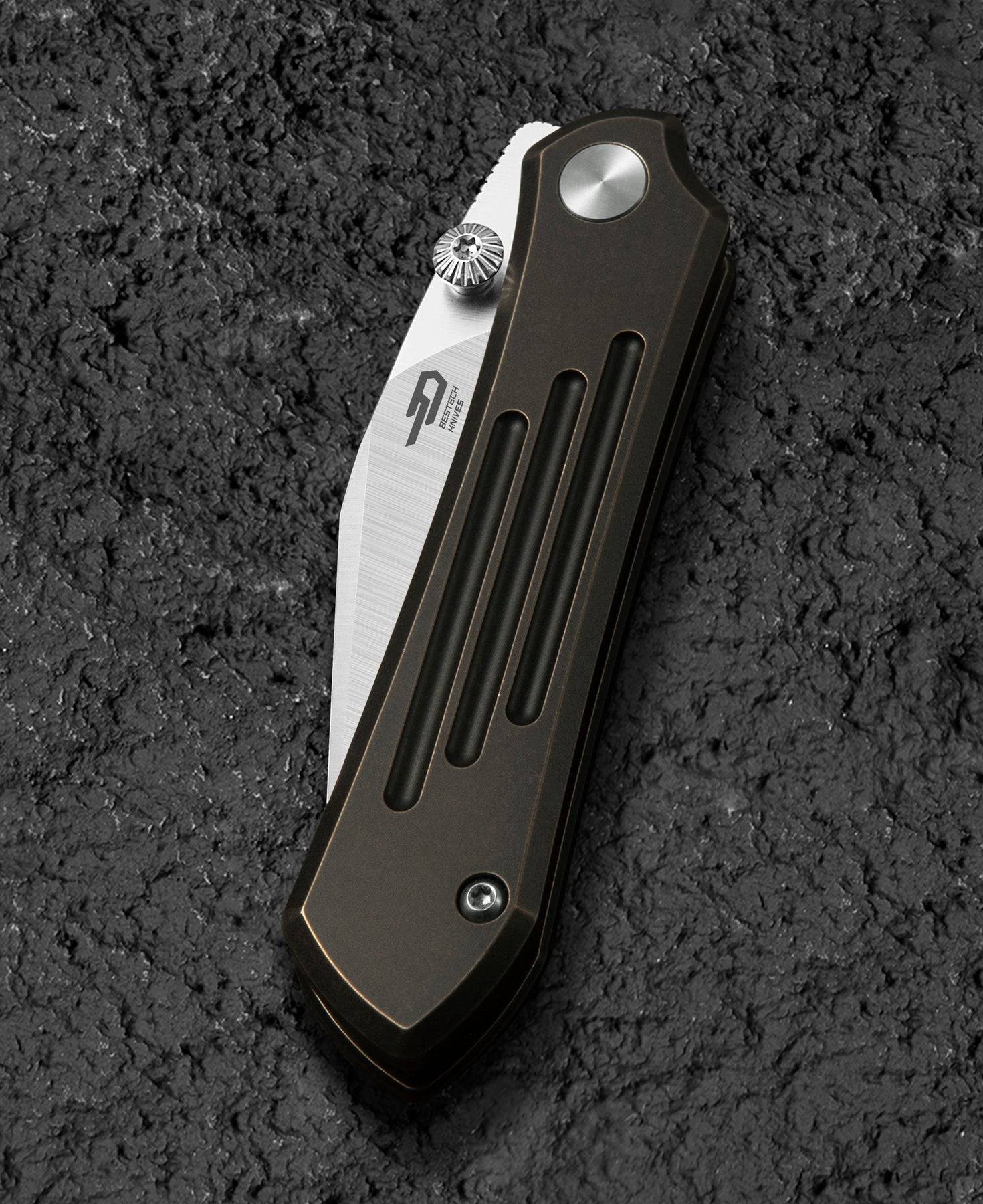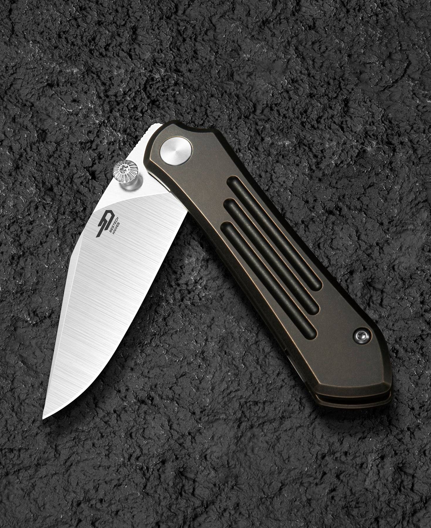 BESTECH ICARUS BT2302A 配备了钛制拇指螺旋和黑色+青铜色钛制夹子,方便单手快速打开和安全收纳。刀片采用陶瓷滚珠轴承系统,确保顺畅的开合操作。刀片硬度为59-61HRC,具有出色的切割能力。