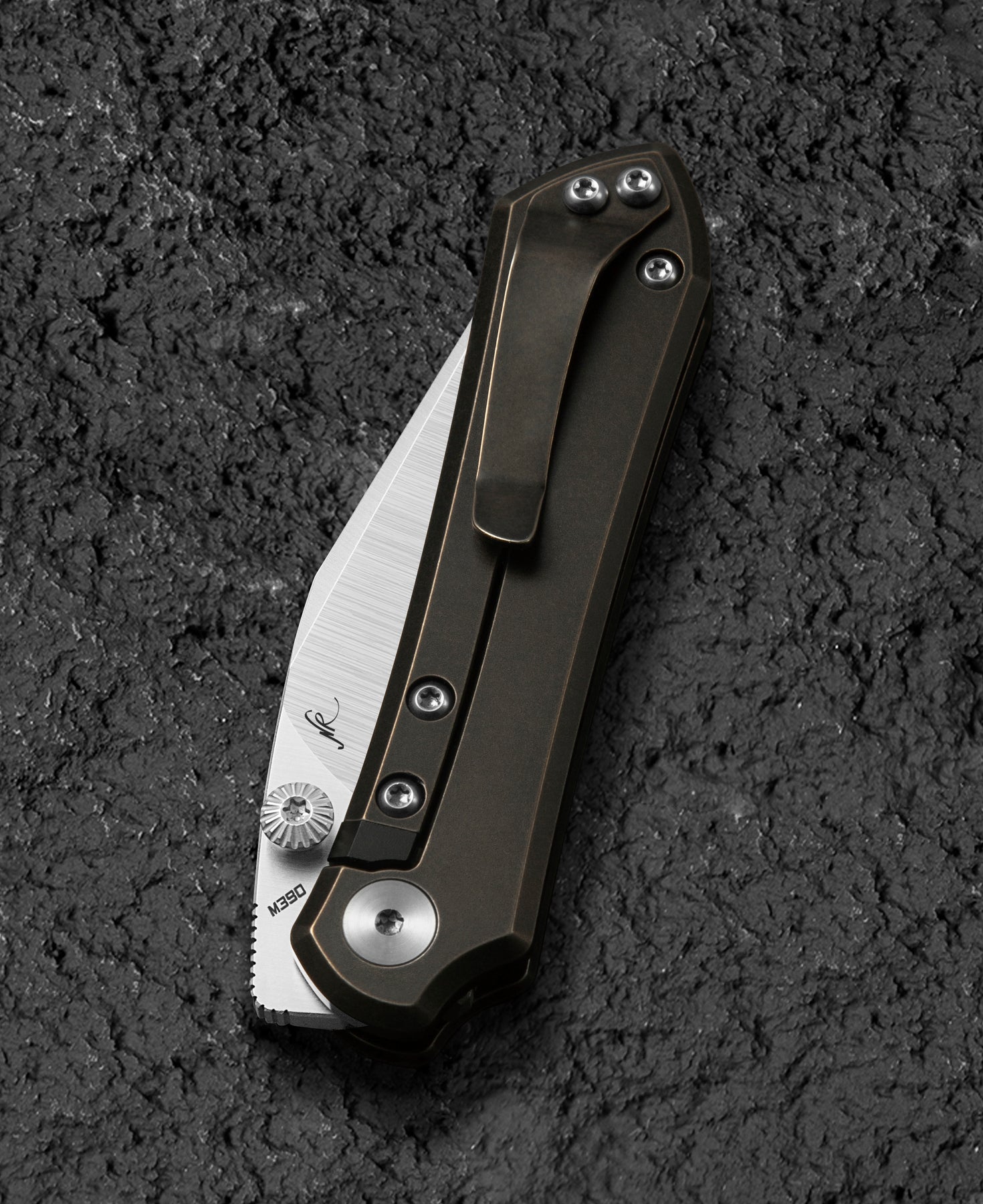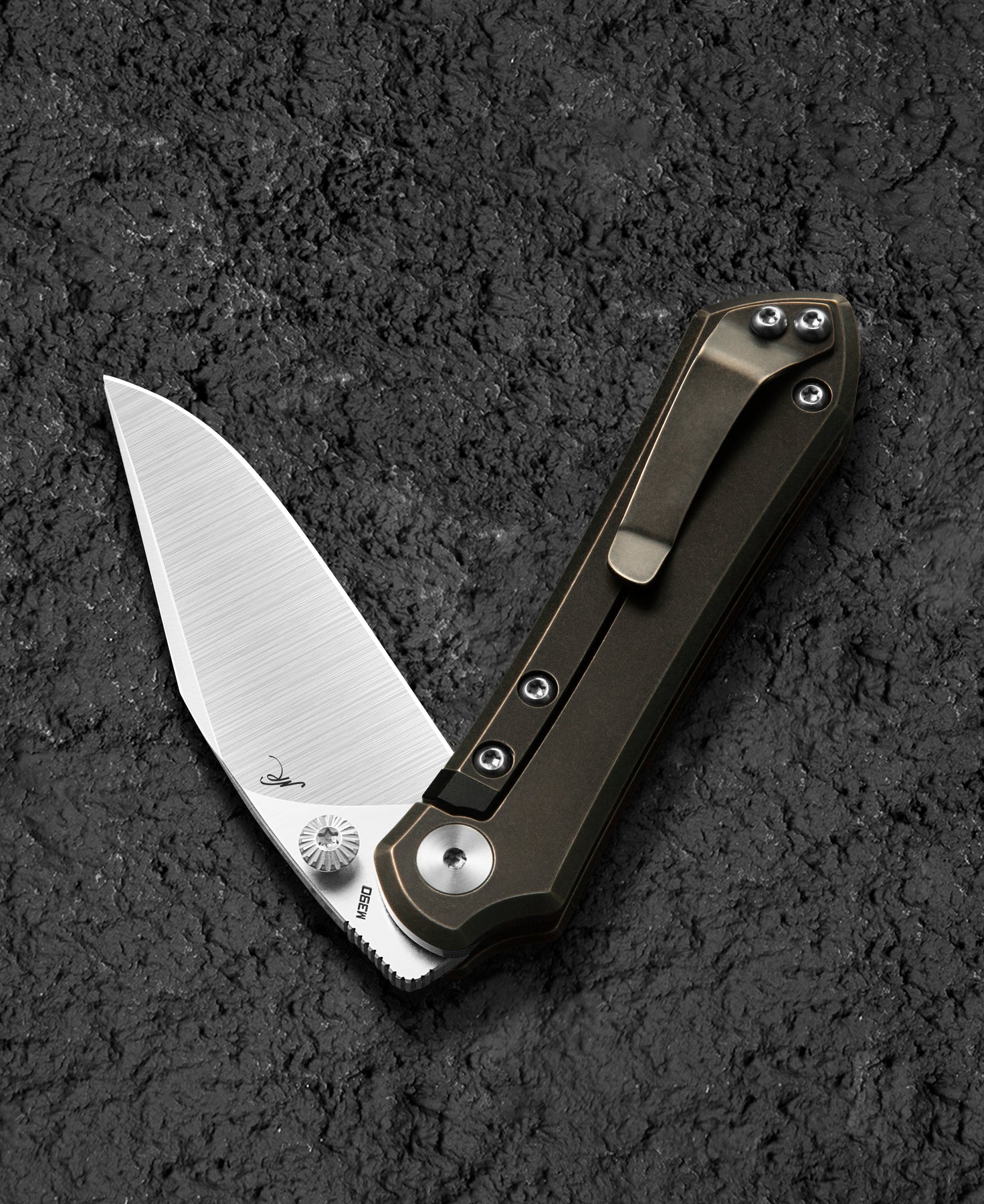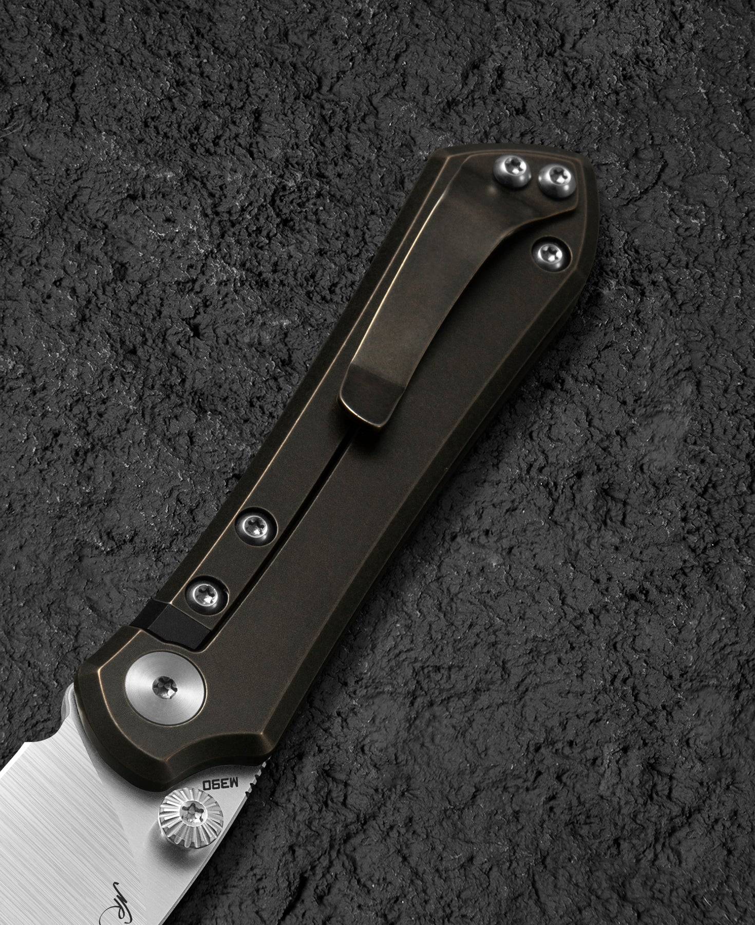该折叠刀的刀柄采用钛制材料,结合黑色和青铜色石洗处理,呈现出时尚而独特的外观。整体长度为6.21英寸(157.8毫米),方便携带。刀柄设计符合人体工学原理,提供舒适的握持感。