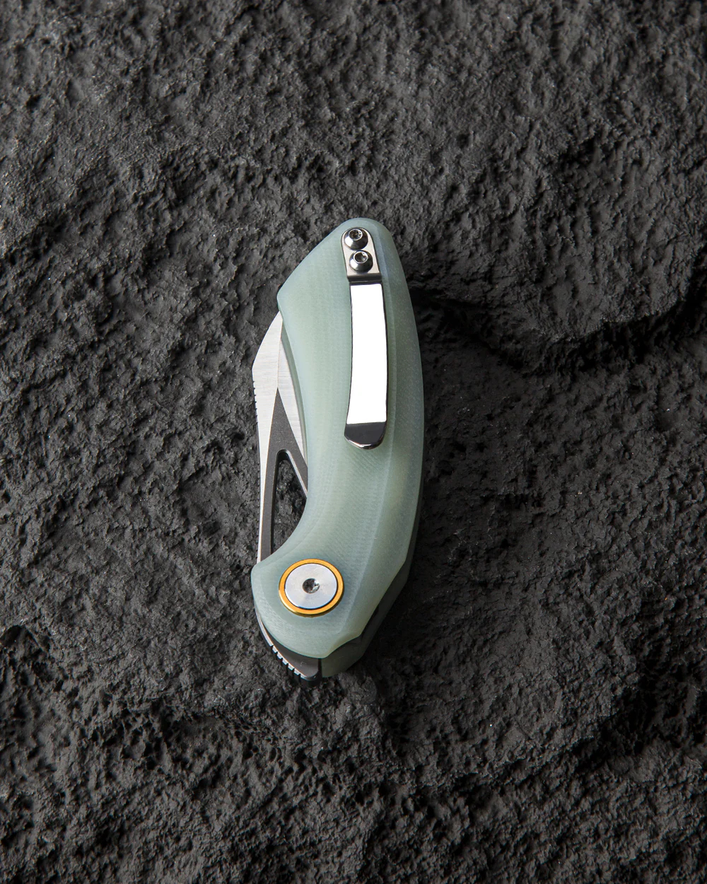 规格 刀片材质:14C28N 刀刃表面处理:灰色石洗+缎面 握把材质:G10 夹具材质:钢制 描述:衬套锁 手柄颜色: 翡翠色 滚珠轴承:陶瓷 全长:5.24英寸(133毫米) 闭合长度:3.09英寸...