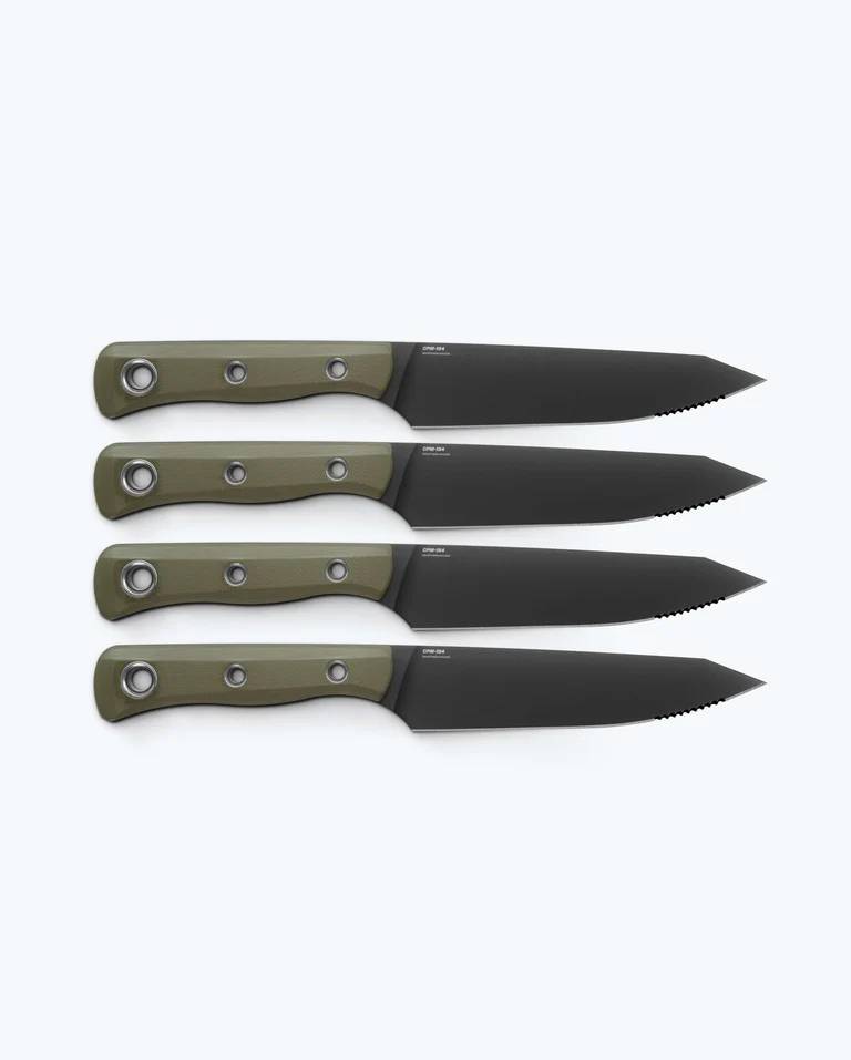 用无与伦比的表现摆好你的餐桌。桌刀在餐桌上为刀刃保持力、韧性和锋利度树立了高标准,远胜你以往用过的任何牛排刀。4001BK-01桌刀套装为我们最受欢迎的配置之一,采用CPM-154不锈钢黑色DLC,外覆OD Green G10手柄刻度。前锯齿为切硬或纤维状食物提供强劲咬合力,现在正是将Benchmade的力量带入节日盛宴的最佳时机。