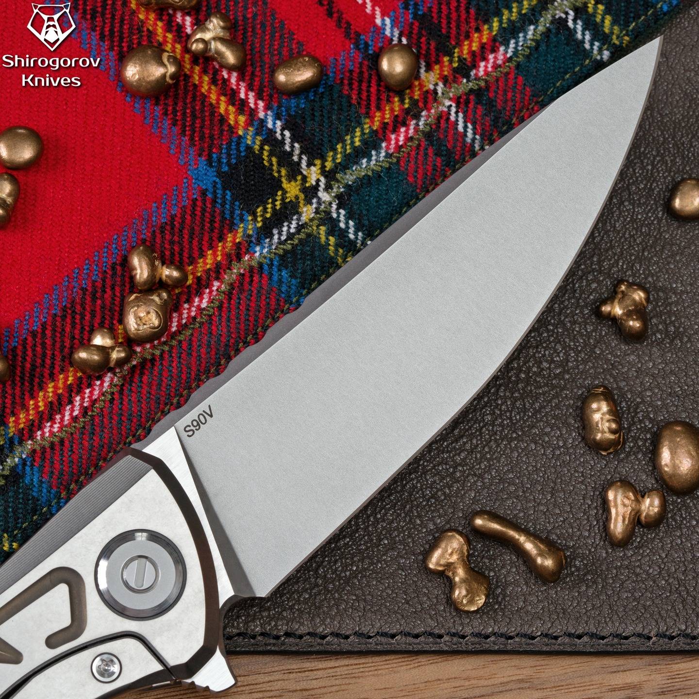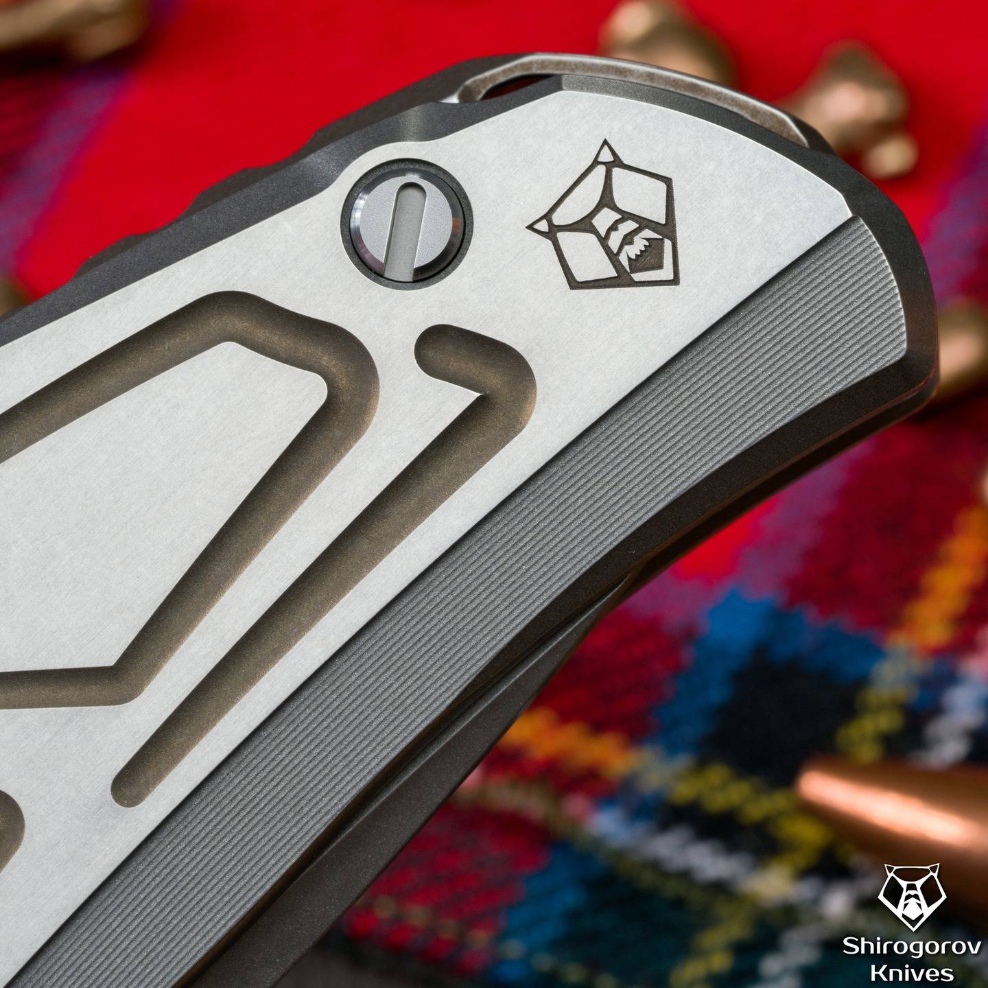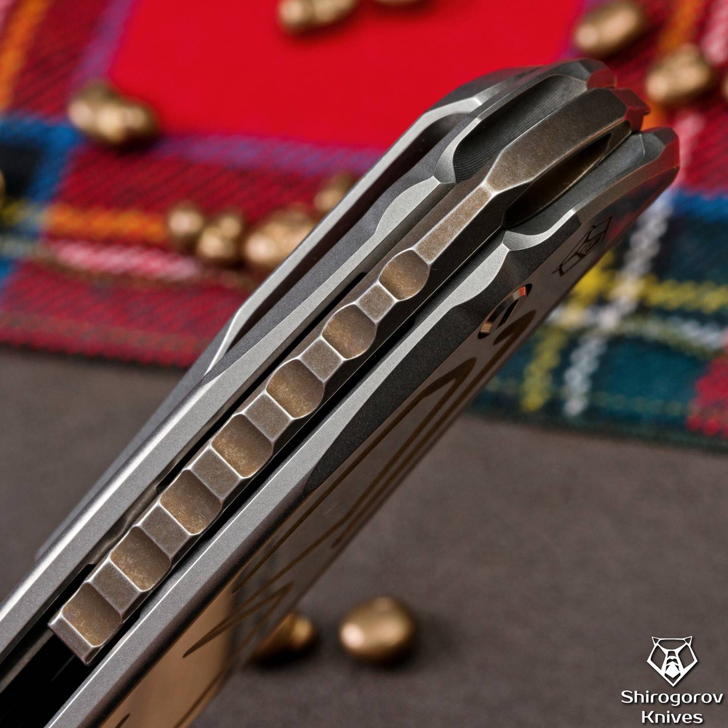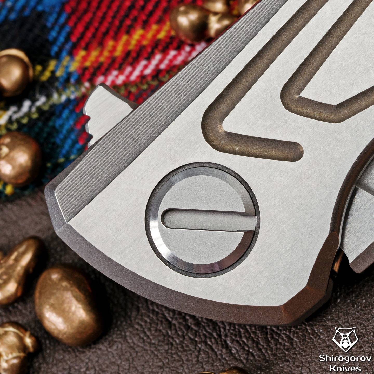S90V 钢材刀片厚度为 4 毫米(0.16 英寸),拥有明显的假刃和缎面平面。这款折刀采用青铜垫片,并配备框架锁定结构。手柄内部经过深度减重处理,枢轴和主体螺丝的倒角也采用缎面处理。浮动式背垫片采用阳极氧化青铜材质,并经过齿轮铣削工艺处理,与刀脊上的凹槽完美契合。