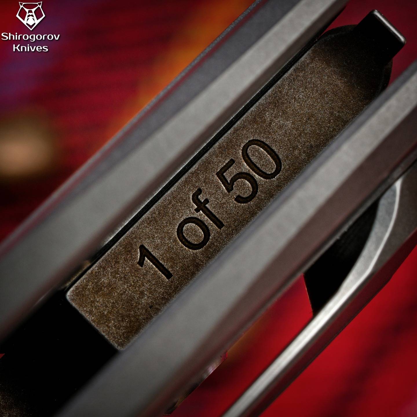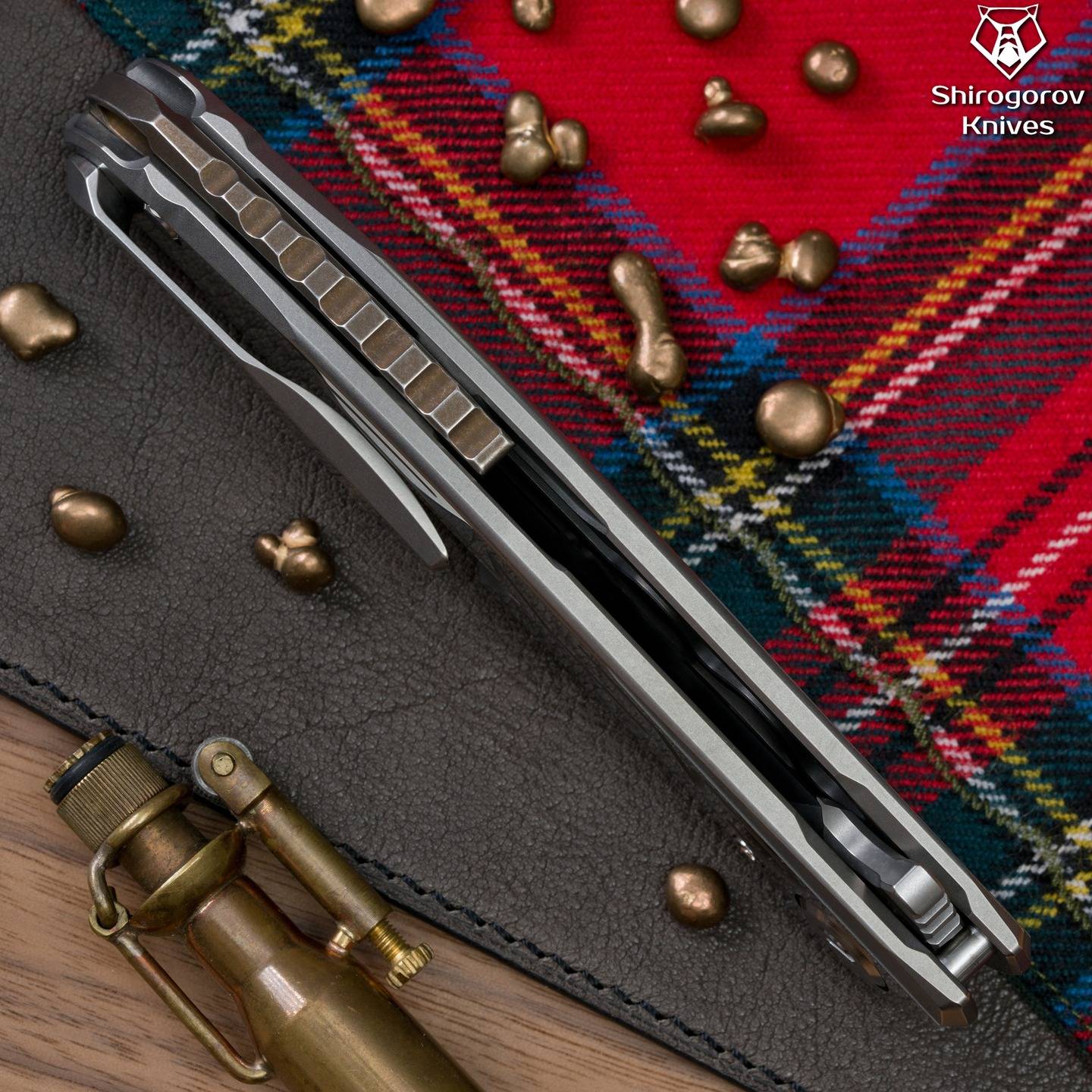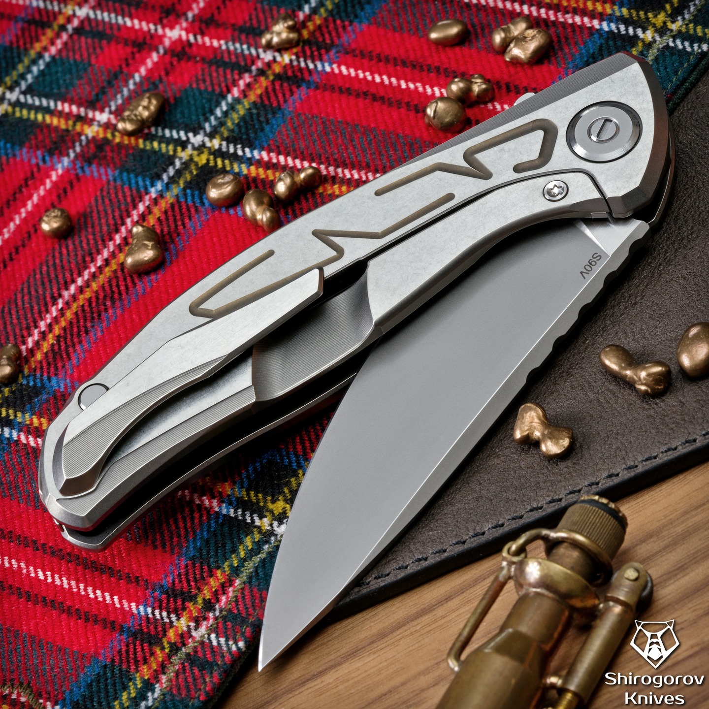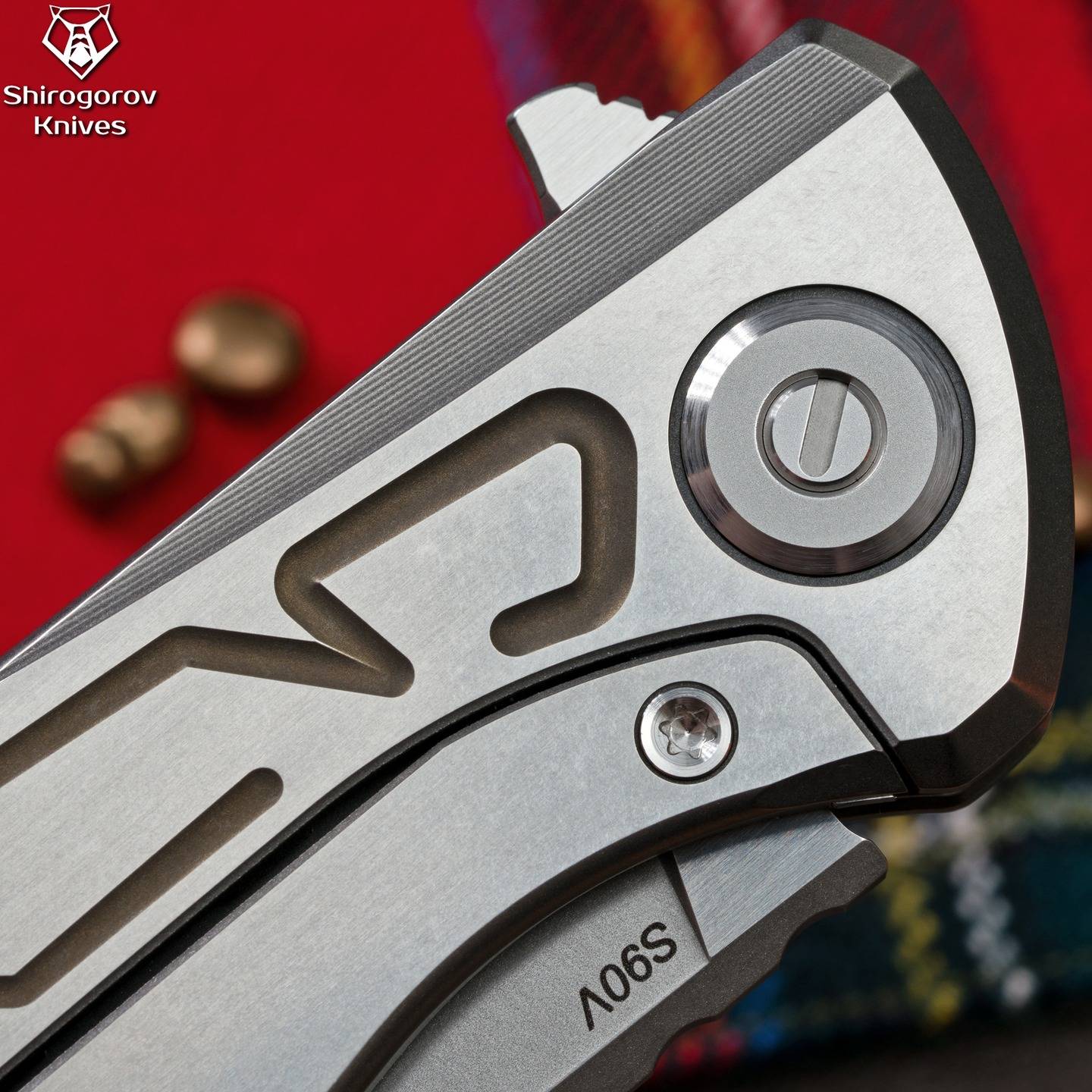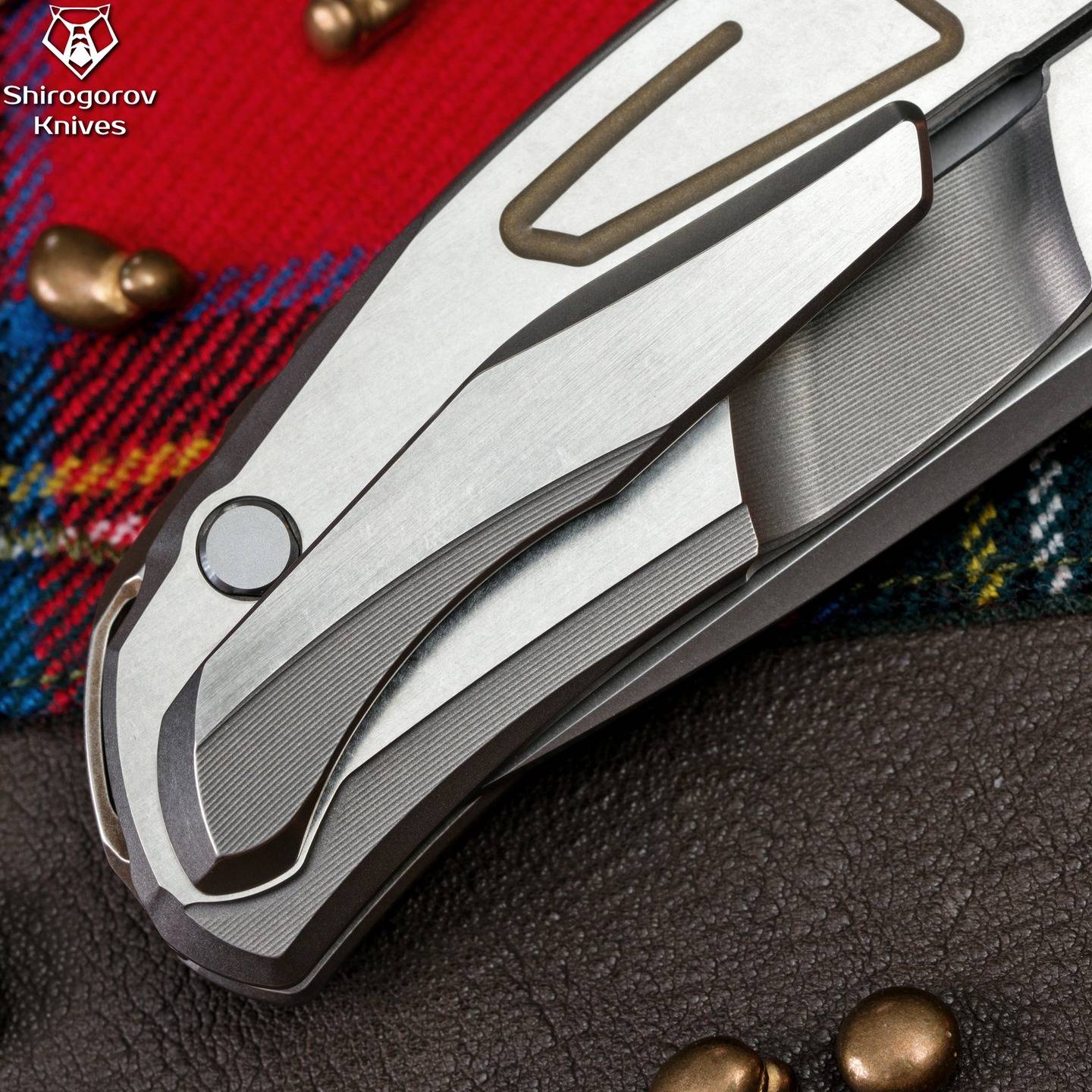 S90V 钢材刀片厚度为 4 毫米(0.16 英寸),拥有明显的假刃和缎面平面。这款折刀采用青铜垫片,并配备框架锁定结构。手柄内部经过深度减重处理,枢轴和主体螺丝的倒角也采用缎面处理。浮动式背垫片采用阳极氧化青铜材质,并经过齿轮铣削工艺处理,与刀脊上的凹槽完美契合。