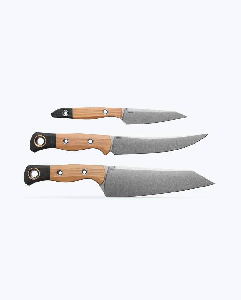 你需要的一切都在。比你想象的还要多。Benchmade最出色的三重烹饪组合汇聚于我们重新设计的三件套装中,精准切片、准备、修剪和上菜。配备全新Wildcoast™多用途工具刀、全新True Paring刀和经过验证的Meatcrafter®混合肉类加工刀,每把刀均采用CPM-154不锈钢黑色DLC涂层,刀刃性能由SelectEdge®增强。耐用的OD Green G10手柄秤配黑色G10握力,在任何场合都能带来自信的握持。配合防护刀片套,掌控台面,使用全新的三件套装。