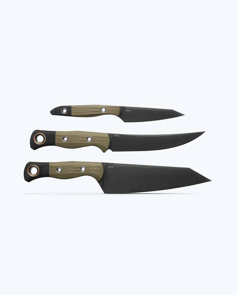 你需要的一切都在。比你想象的还要多。Benchmade最出色的三重烹饪组合汇聚于我们重新设计的三件套装中,精准切片、准备、修剪和上菜。配备全新Wildcoast™多用途工具刀、全新True Paring刀和经过验证的Meatcrafter®混合肉类加工刀,每把刀均采用CPM-154不锈钢黑色DLC涂层,刀刃性能由SelectEdge®增强。耐用的OD Green G10手柄秤配黑色G10握力,在任何场合都能带来自信的握持。配合防护刀片套,掌控台面,使用全新的三件套装。