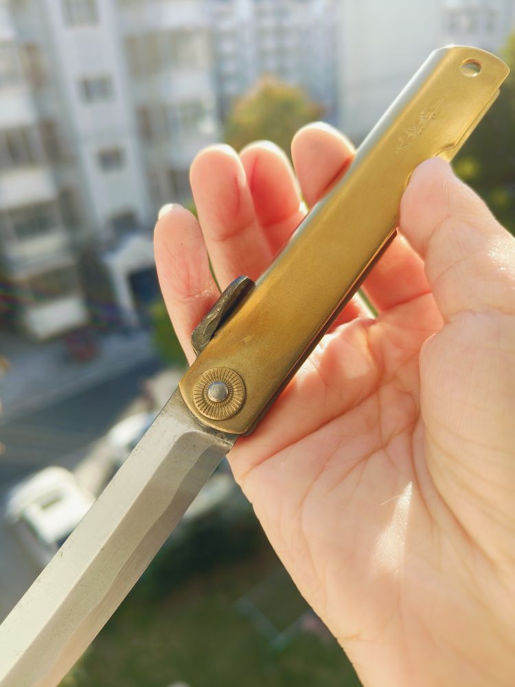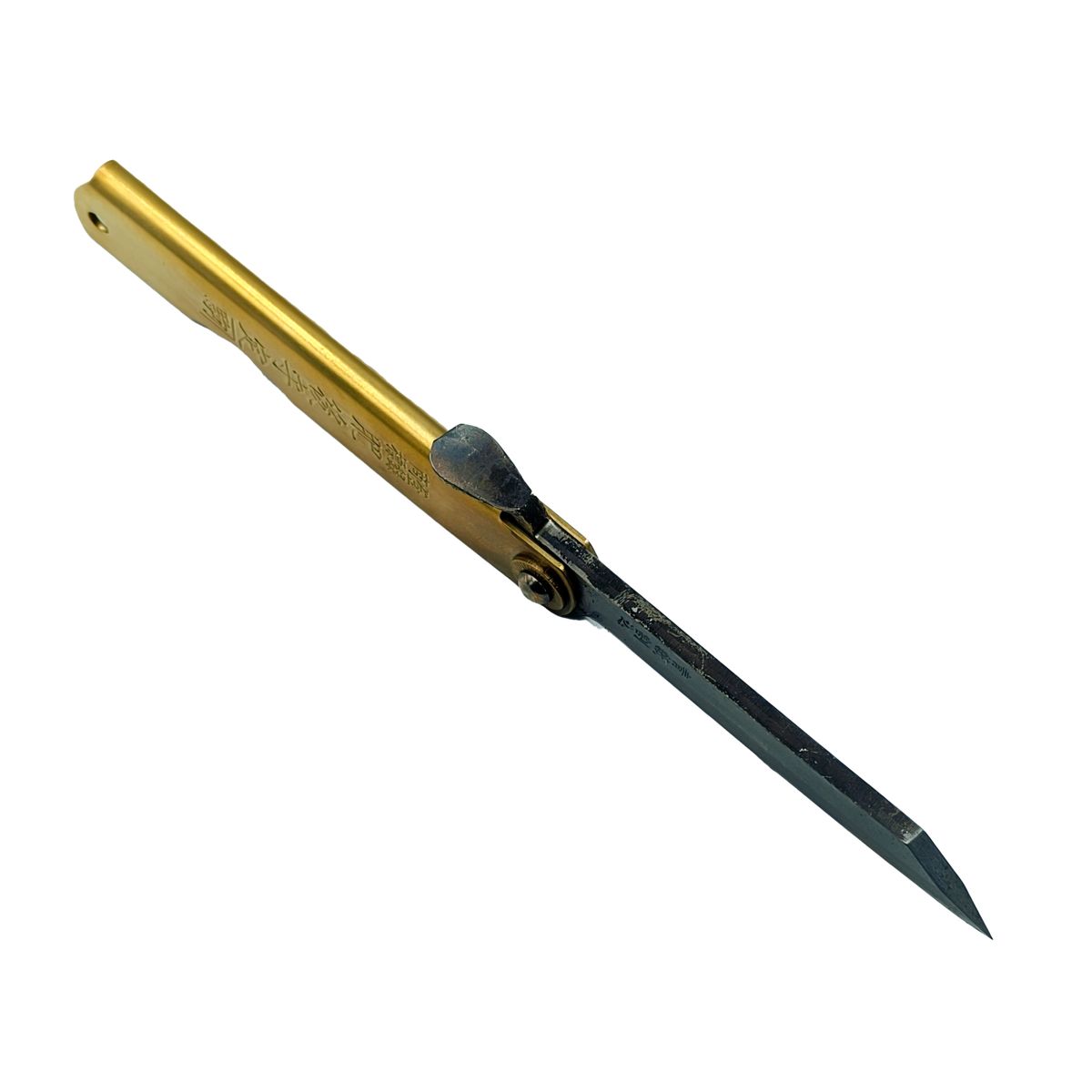 全长:17.5MM 柄长:100mm 材质:青钢手锻“Warikomi” 刃厚:约3.8mm 柄(刀鞘):黄铜 备注:请注意,肥后守定驹的产品均为纯手工制作,尺寸会存在轻微的误差。
