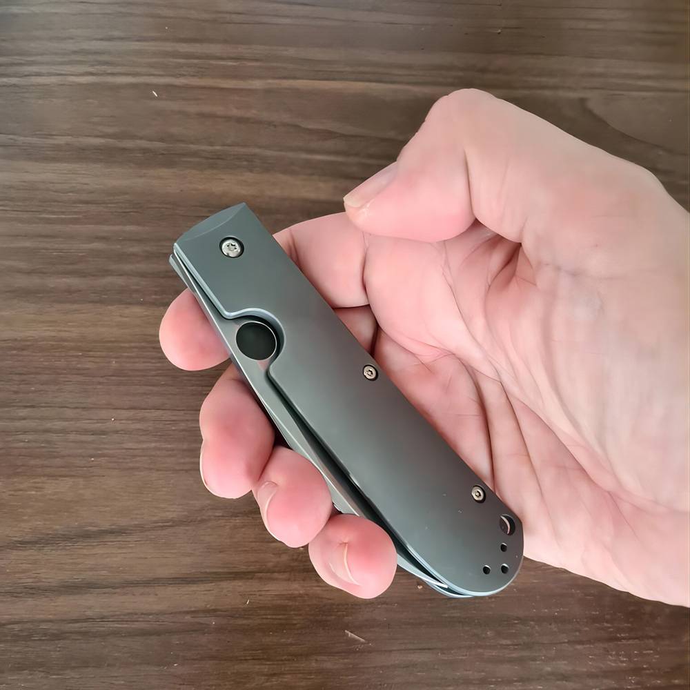 刀柄:Swayback折刀的刀柄采用轻巧且坚固的钛合金材质,经过精细加工,呈现出光滑且均匀的表面。刀柄设计独特,具有优雅的弯曲形状,提供舒适的握持感和出色的手感。刀柄上方配备了可靠的扁平刀柄,方便单手快速开启。