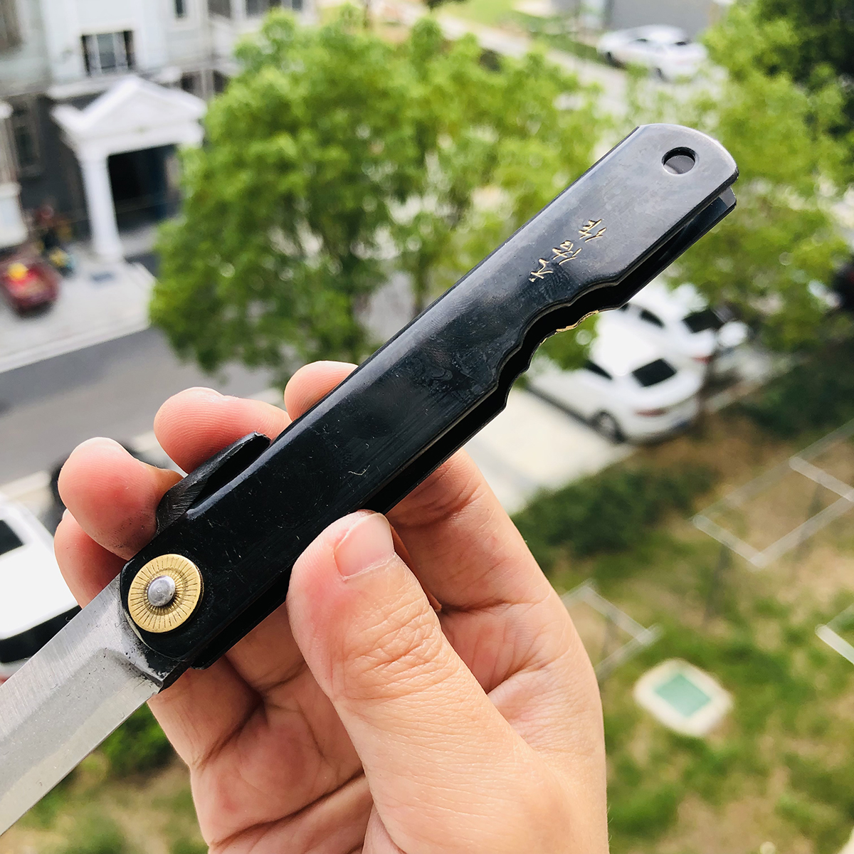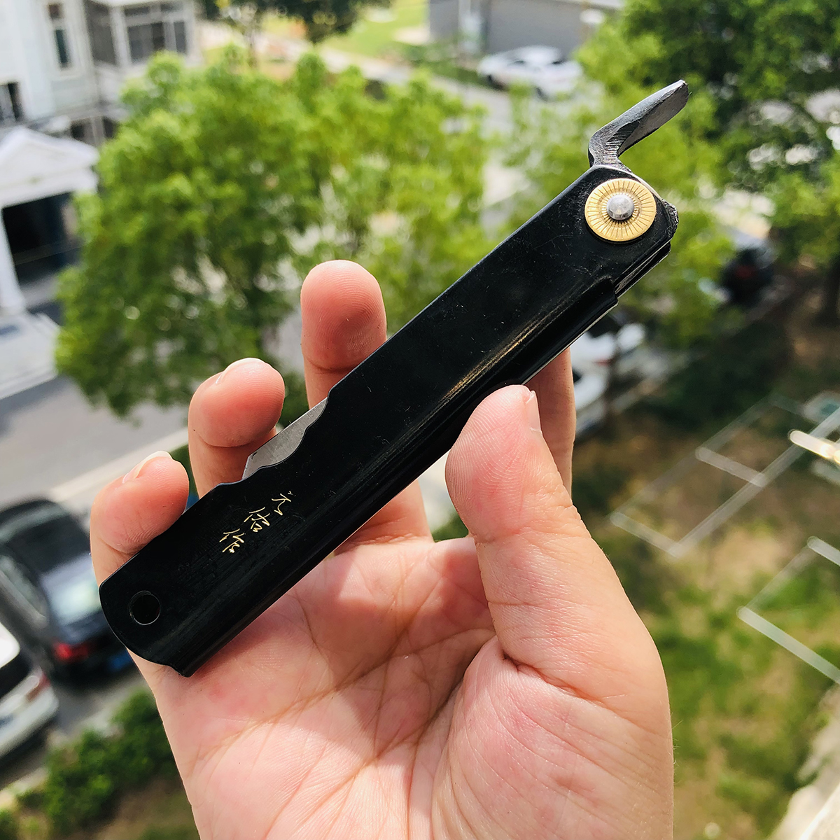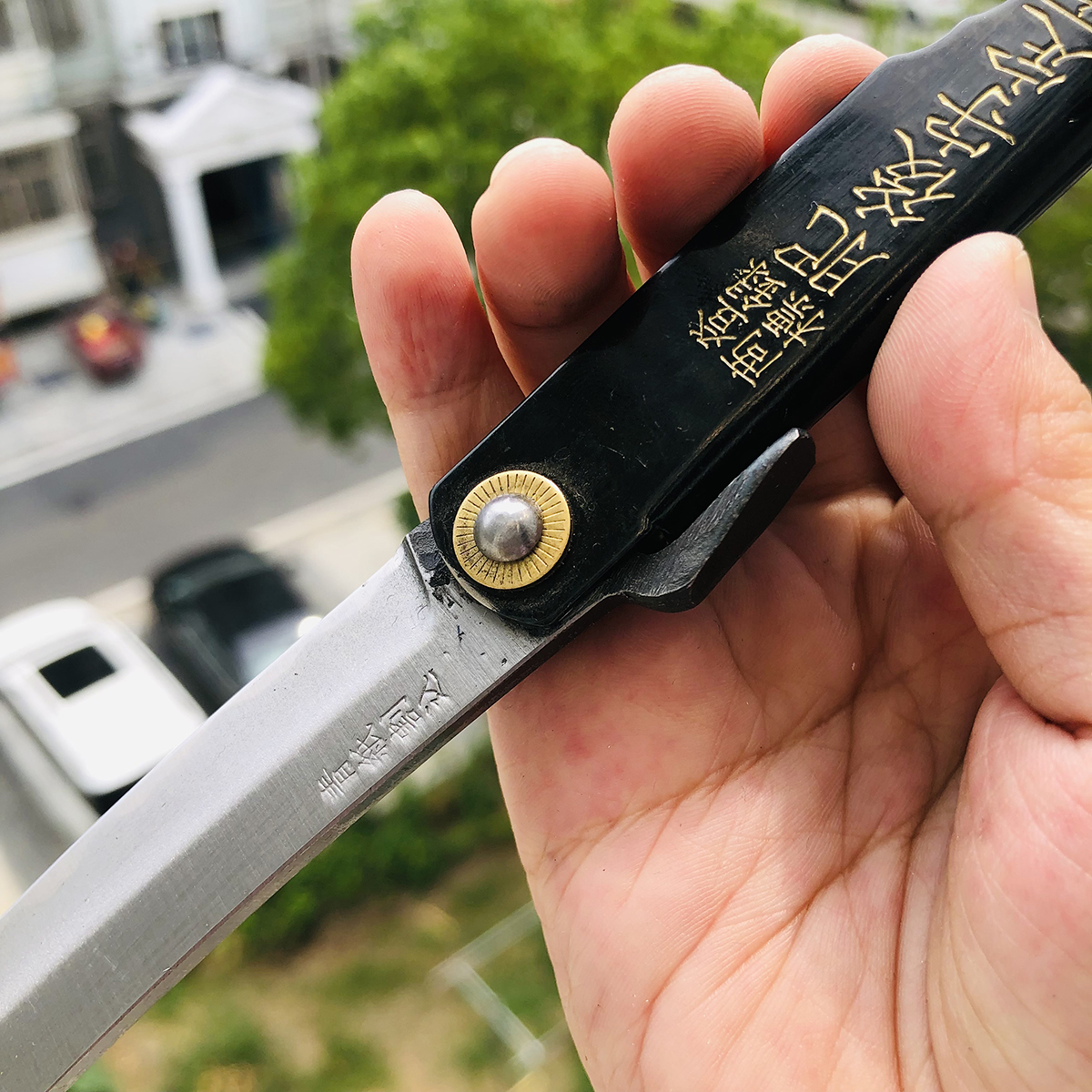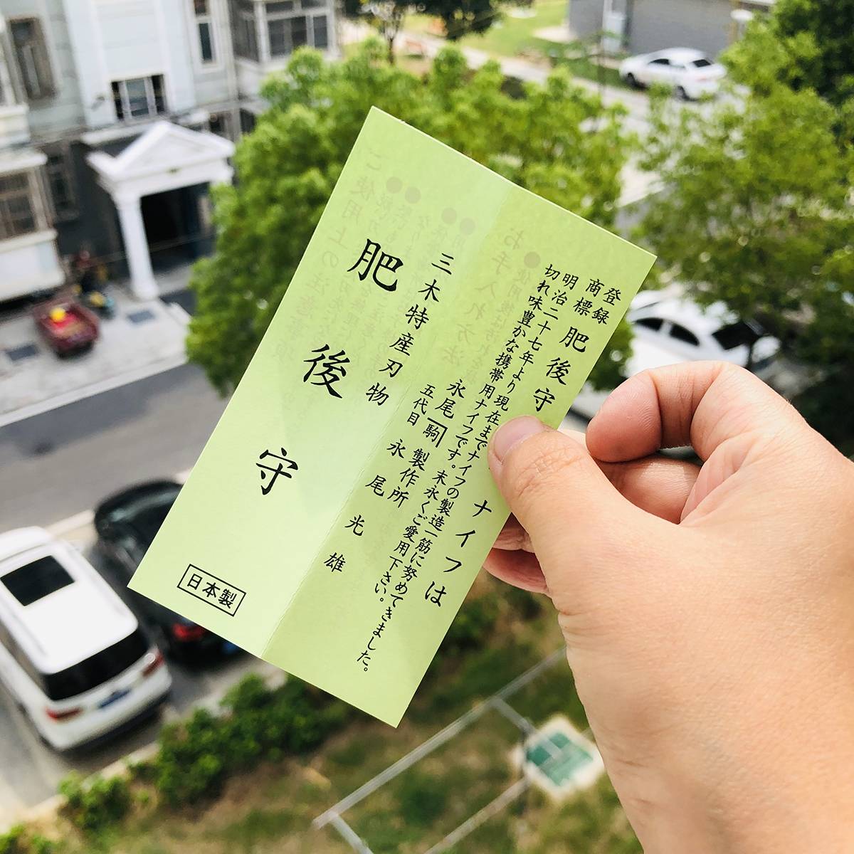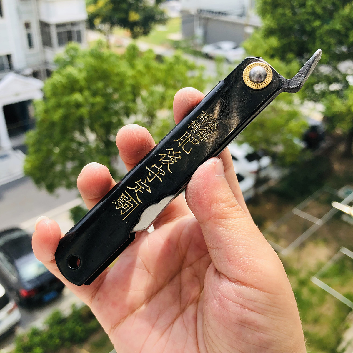 大尺寸青纸夹层肥后守:折合时长度约10公分(不含突出部分),展开时约17公分,刀刃约7.5公分。