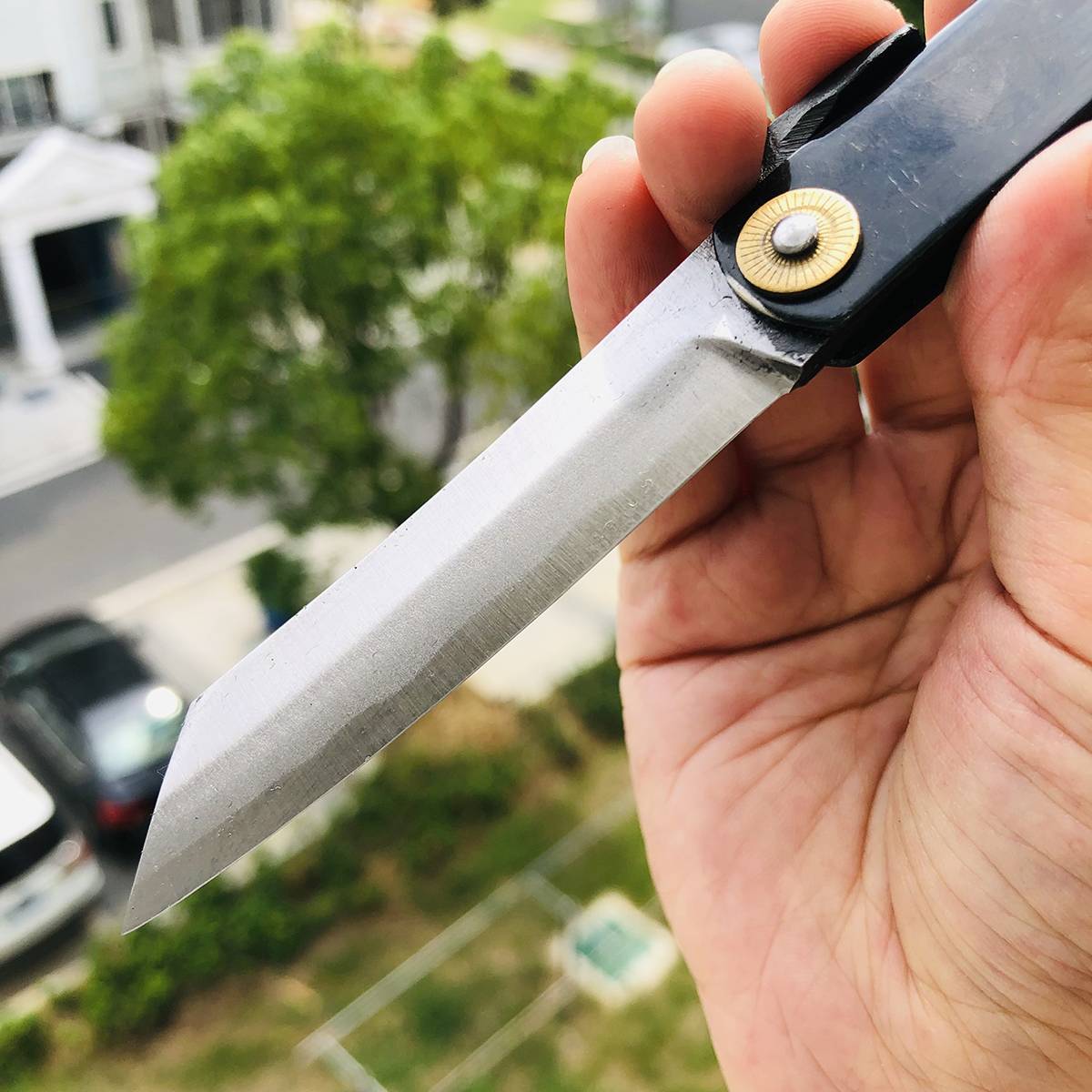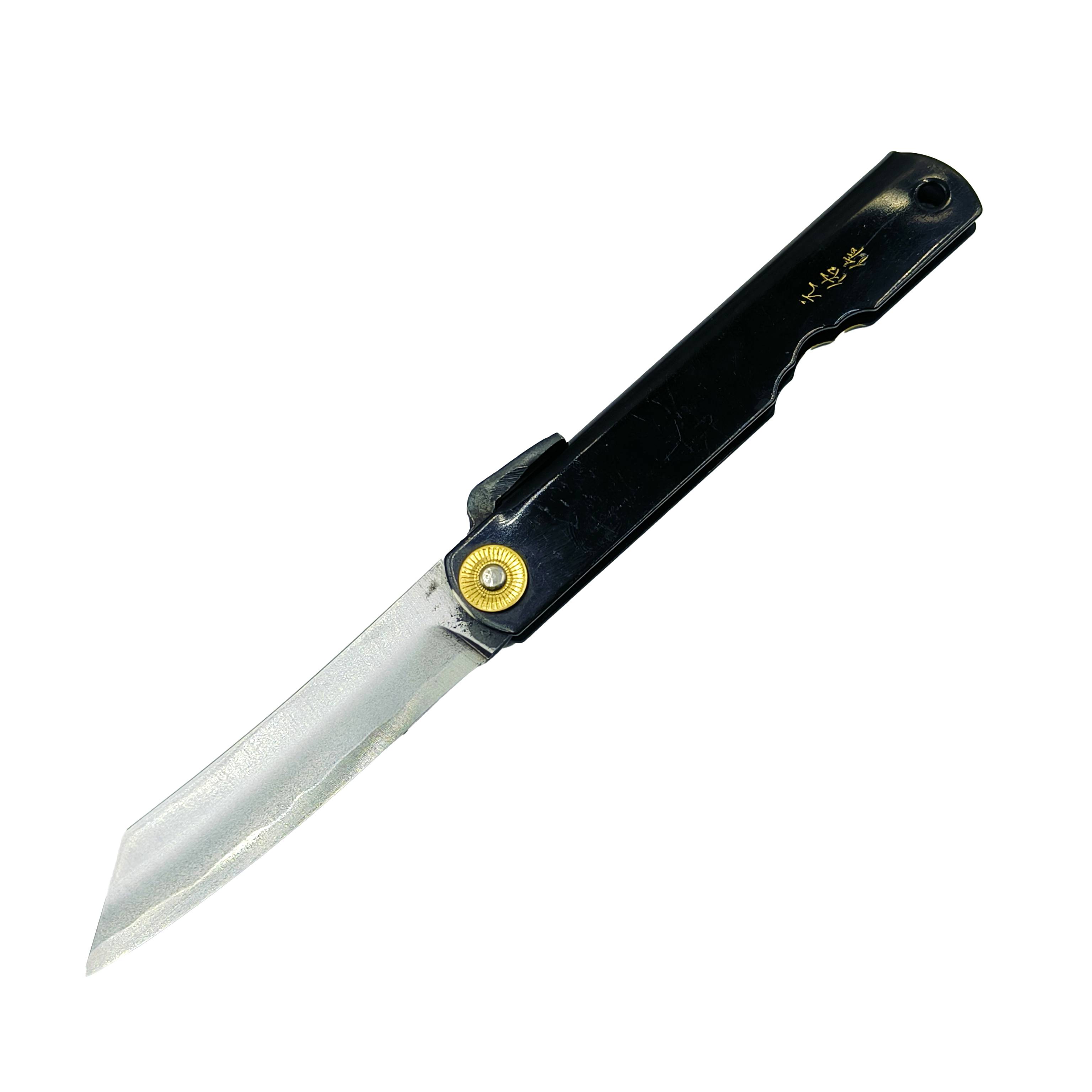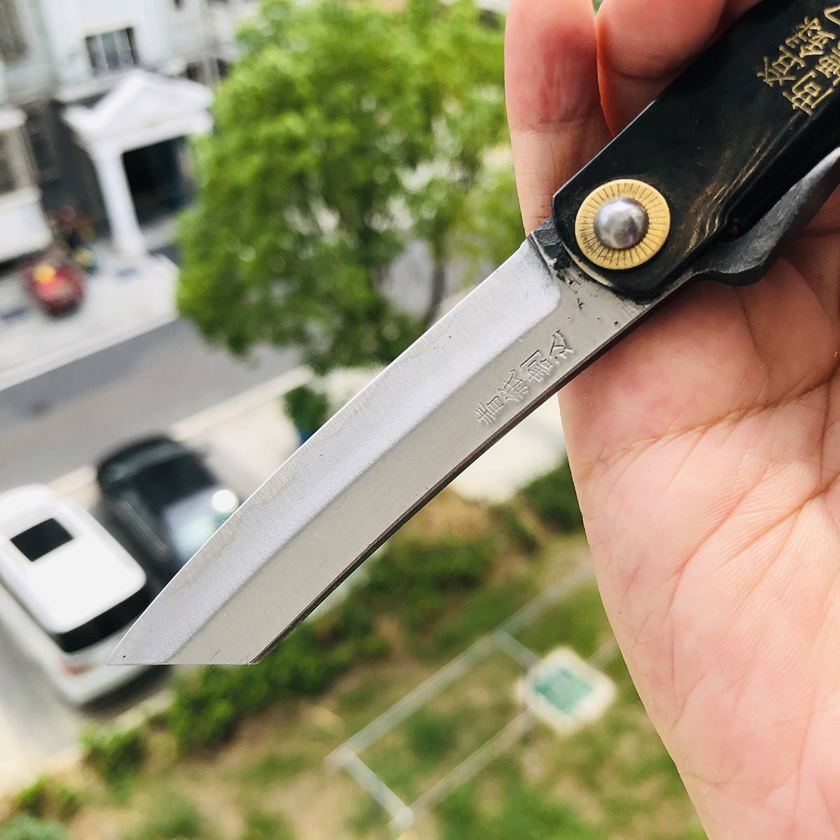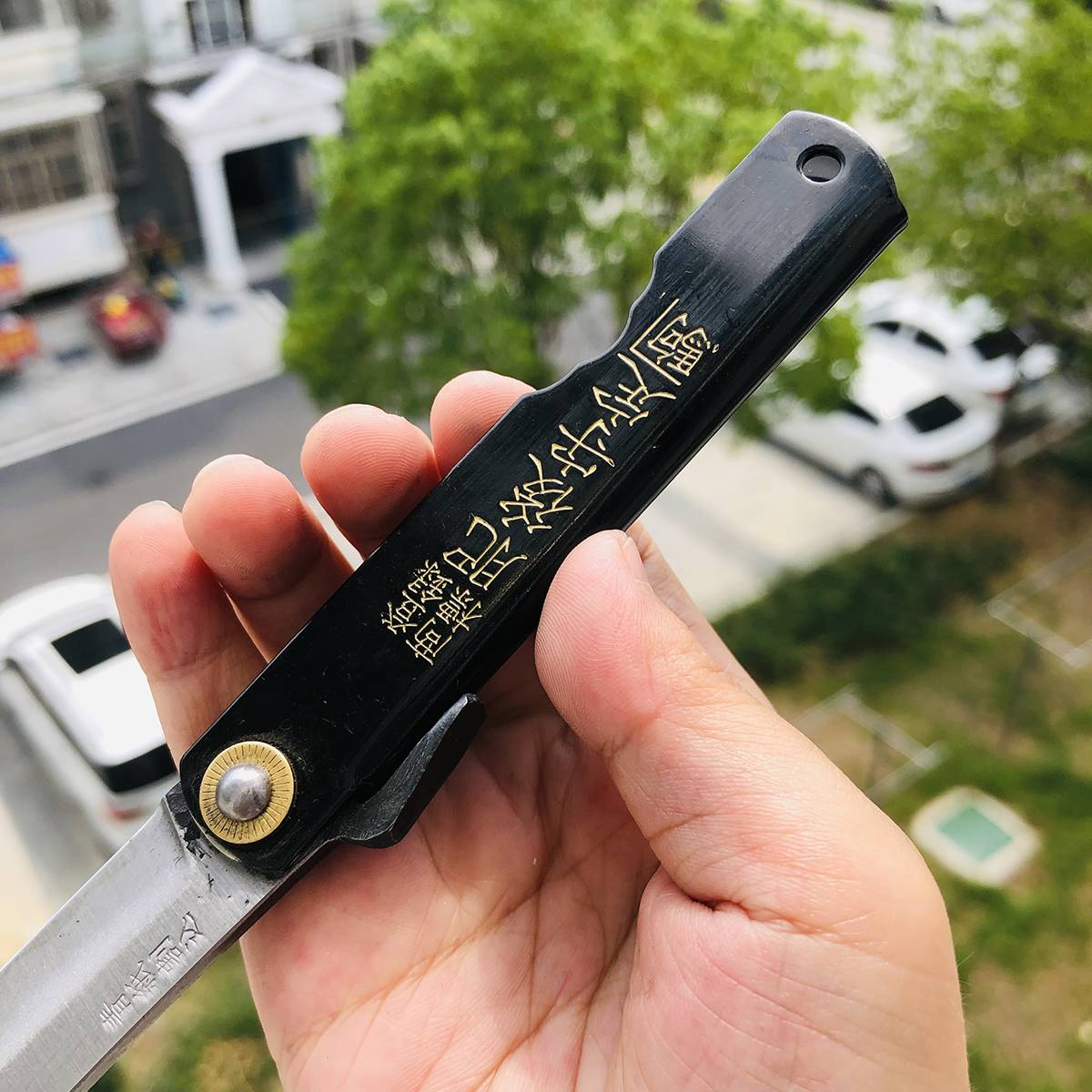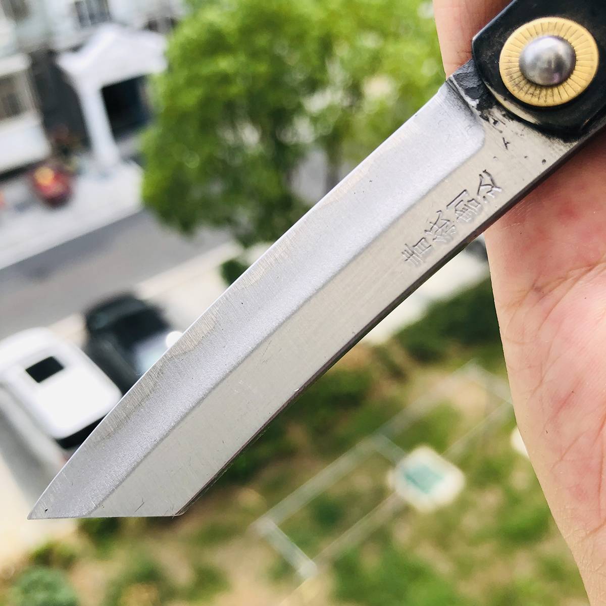 大尺寸青纸夹层肥后守:折合时长度约10公分(不含突出部分),展开时约17公分,刀刃约7.5公分。