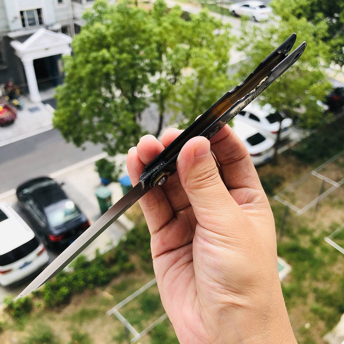 中尺寸青纸夹层肥后守:折合时长度约9公分(不含突出部分),展开时约16.5公分,刀刃约7公分。