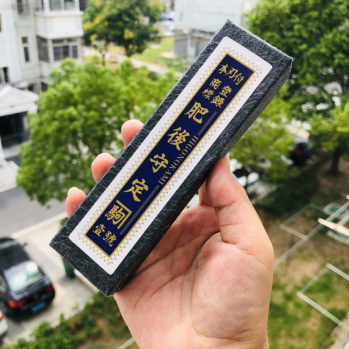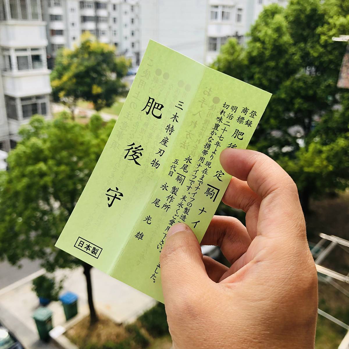 中尺寸青纸夹层肥后守:折合时长度约9公分(不含突出部分),展开时约16.5公分,刀刃约7公分。