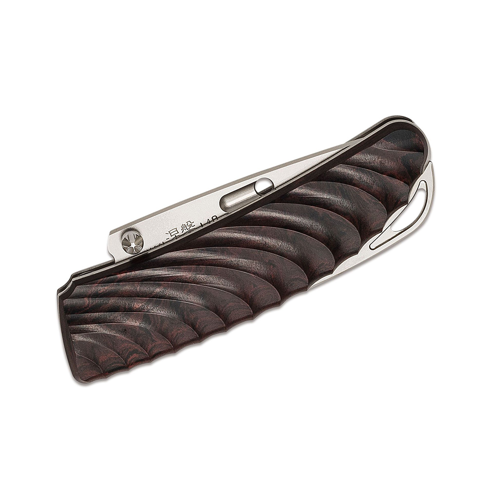 将这些材料与钛板粘合在一起,然后进行制造。该设计以日本和服的褶皱为主题,而拇指钉则设计为花朵形状。这些异质材料同步精密加工是钝DON手柄制造工艺中积累的技术。
