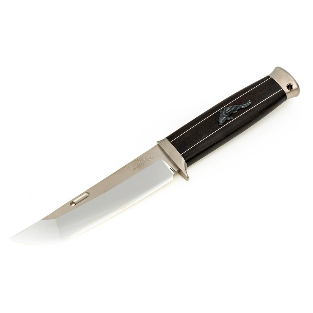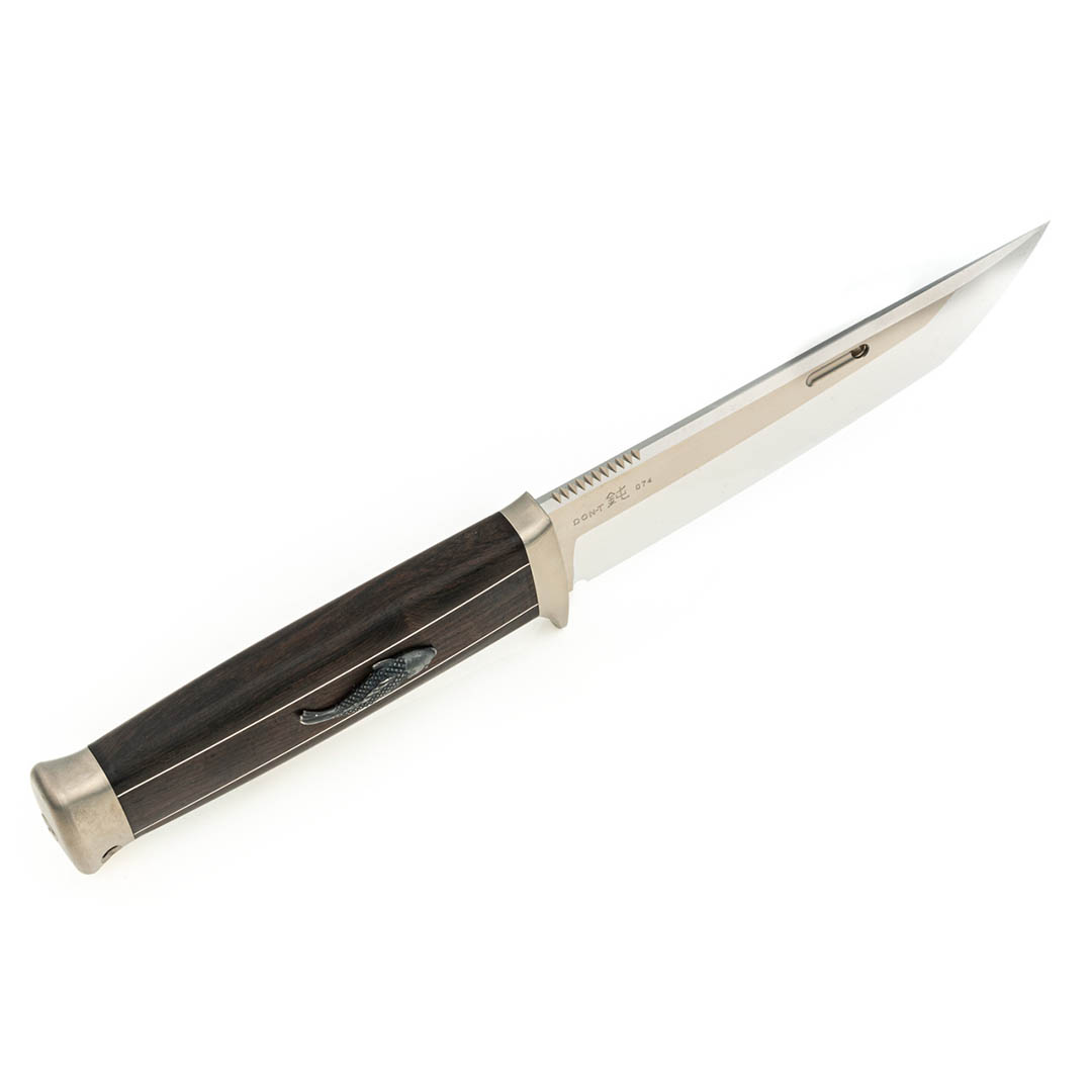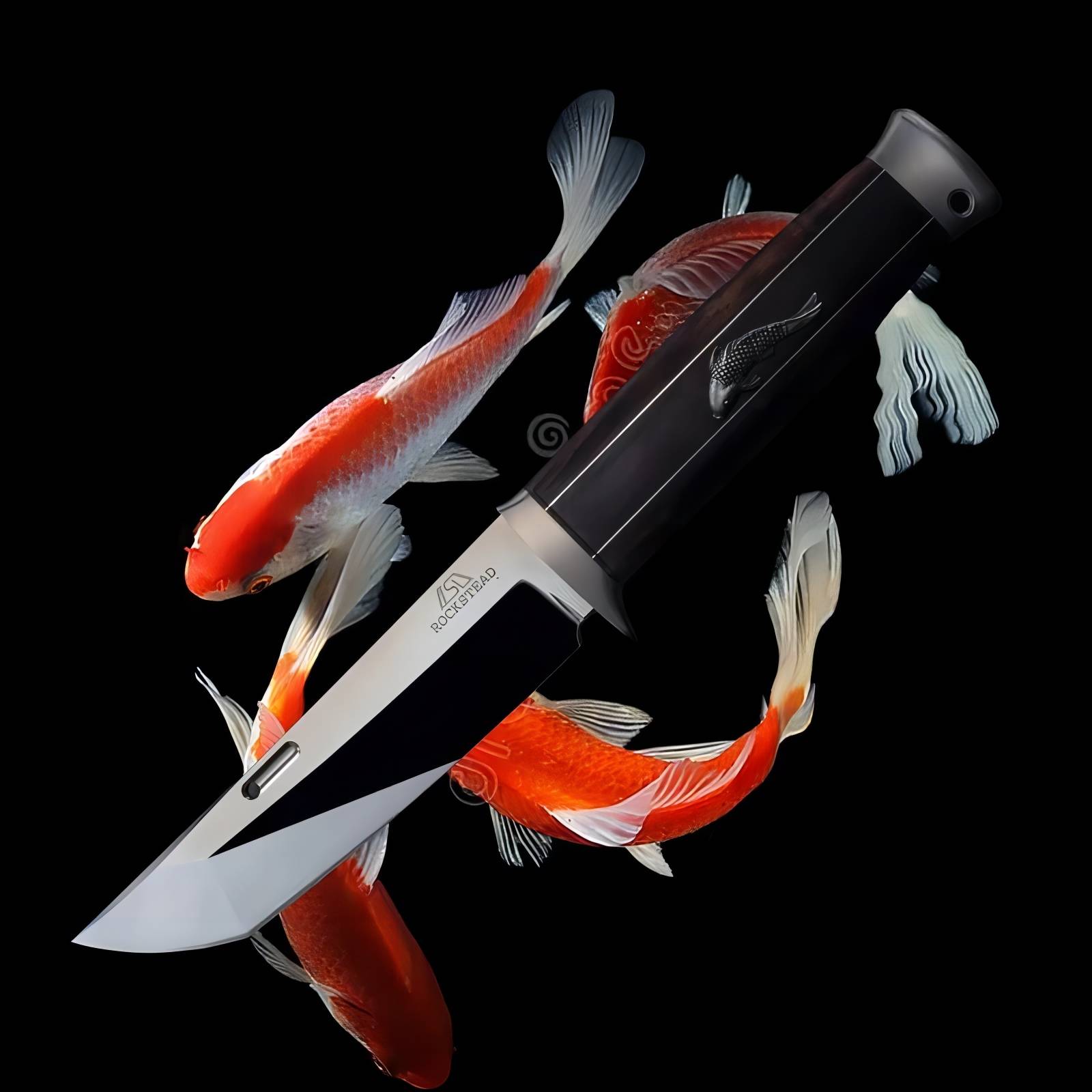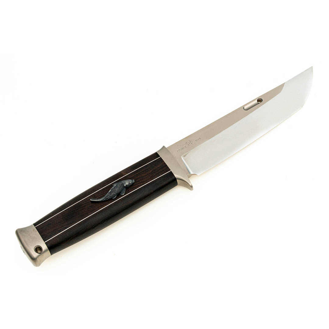 另一个独特之处在于刀柄设计。这款刀柄的灵感来自于传统日本短剑(脇差)。刀柄采用乌木材质,配有银贴花和鲤鱼纹饰。花纹由银制成,通过铸造工艺制作而成。