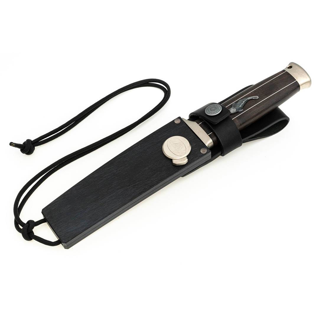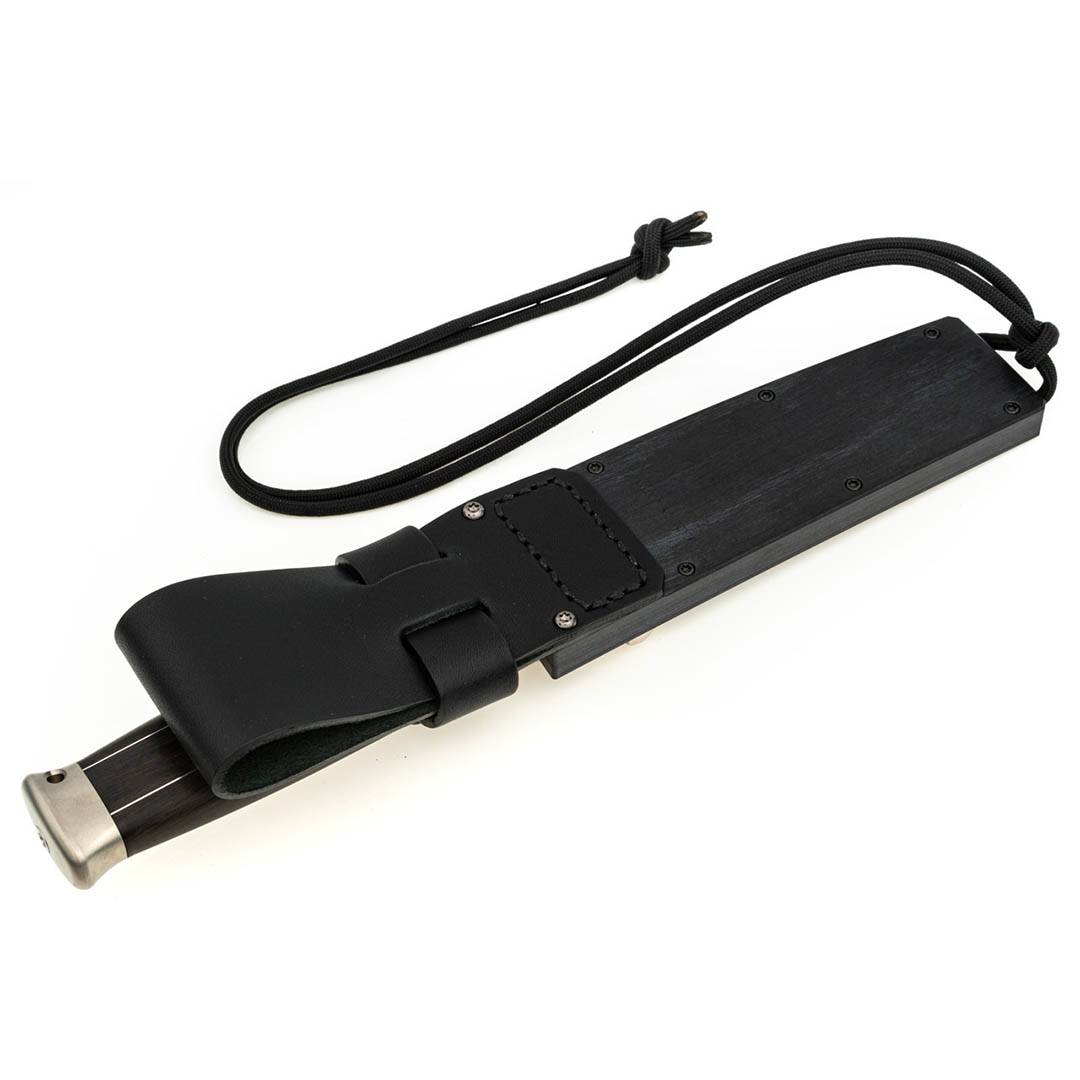 刀柄配套的鞘套采用木质马卡塔材质,并带有皮革腰带,方便携带。