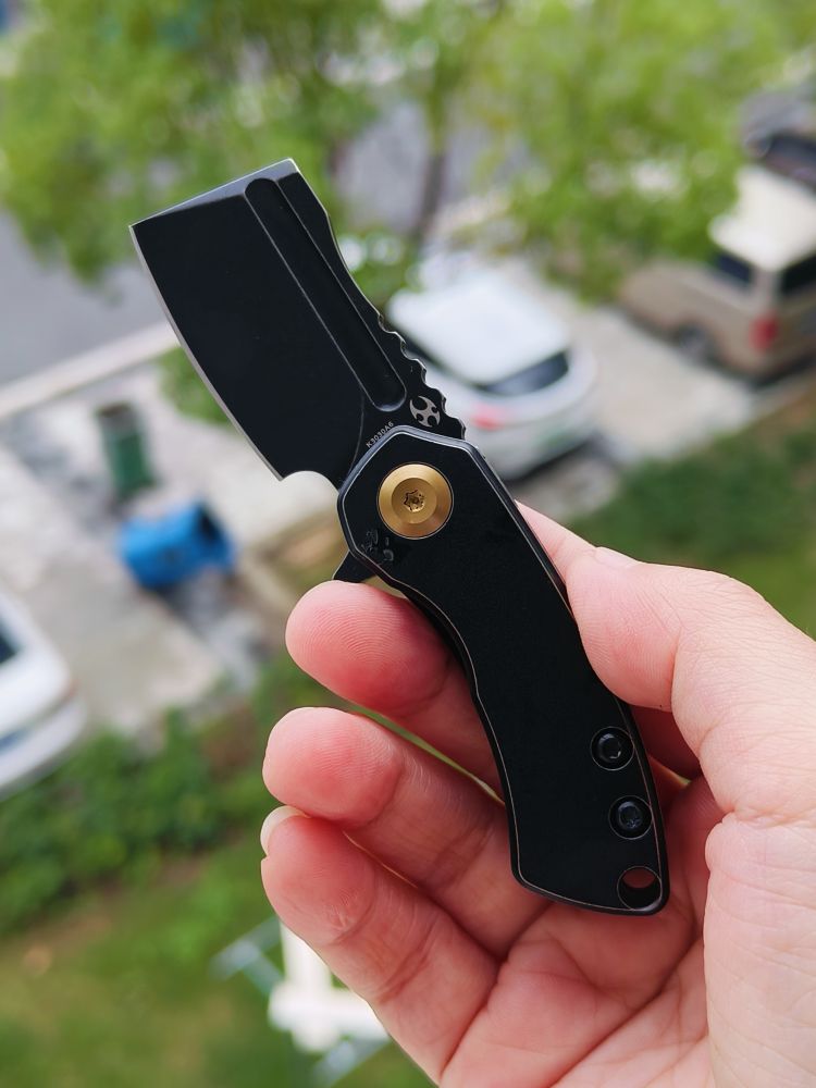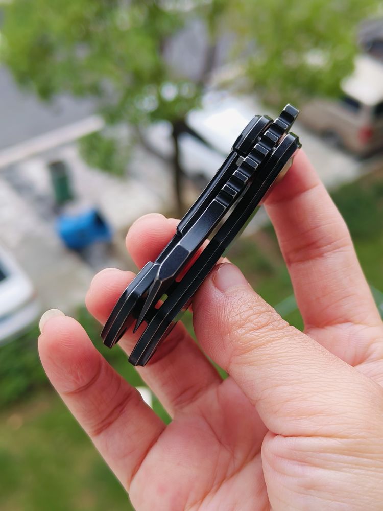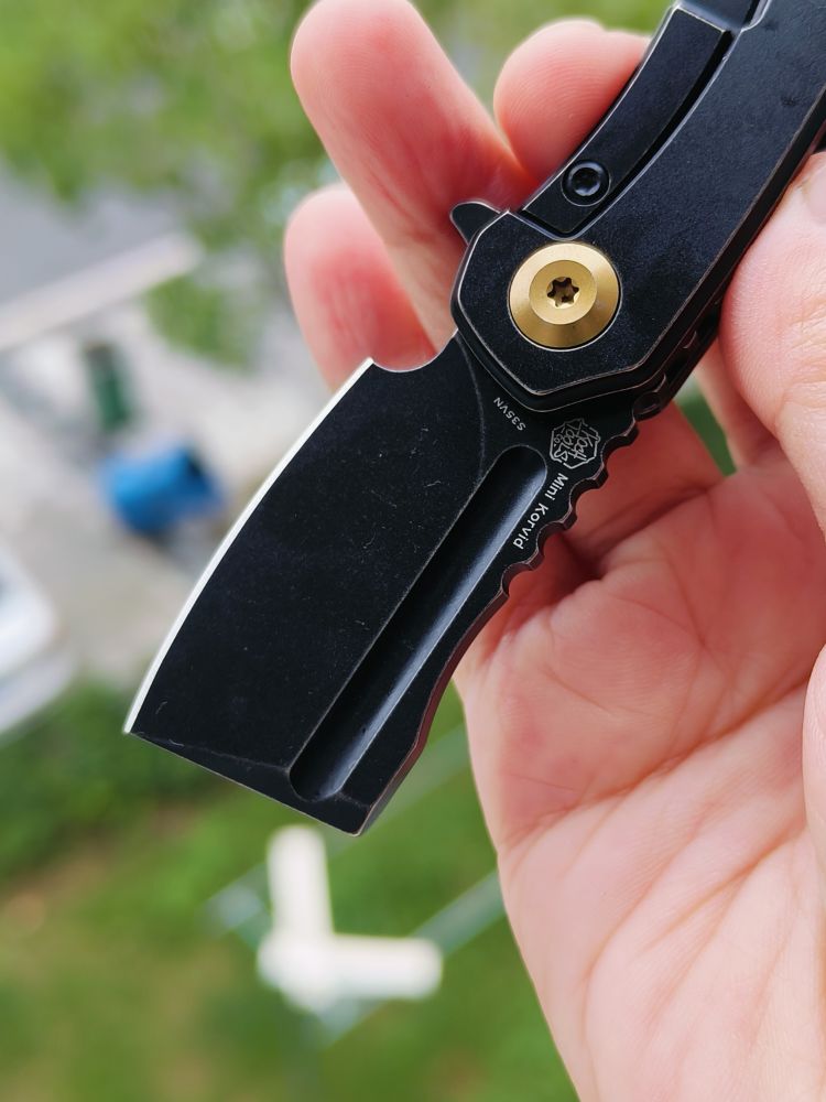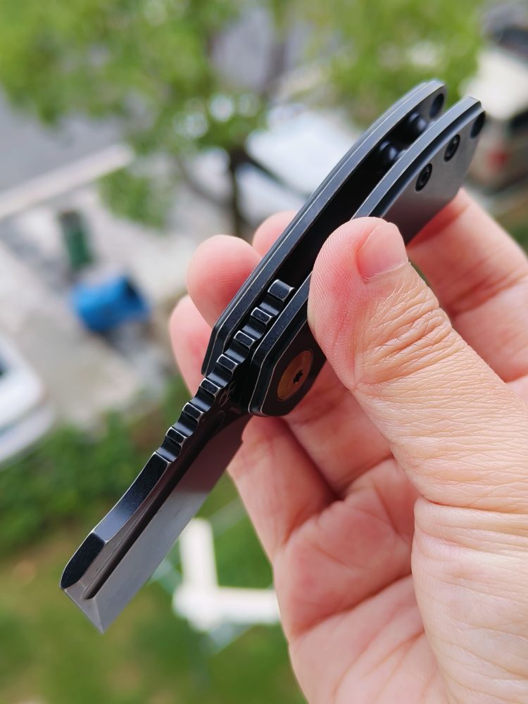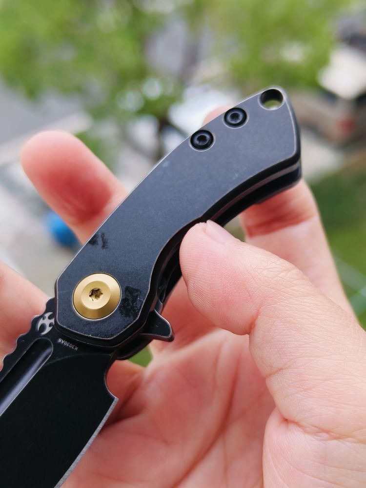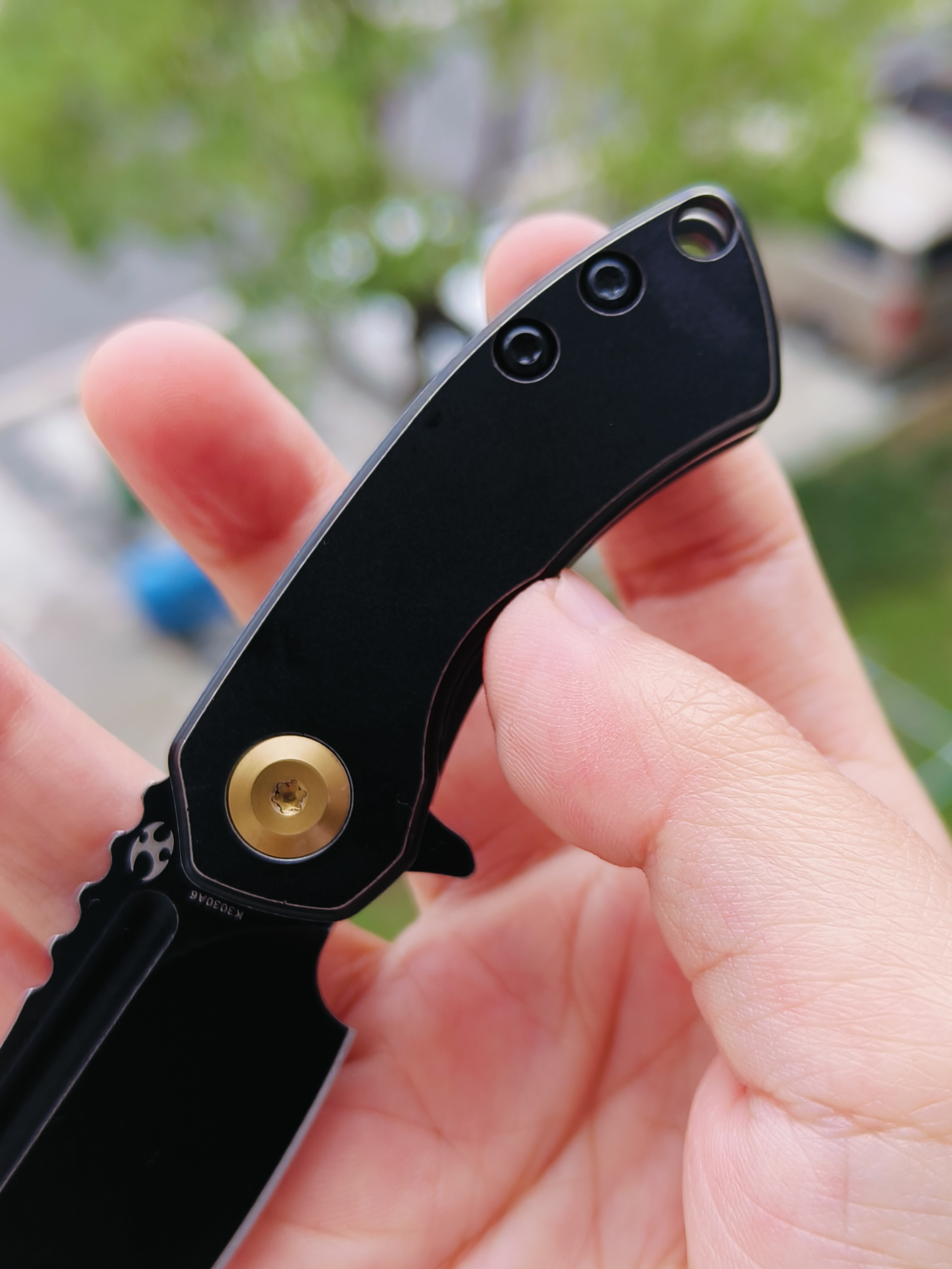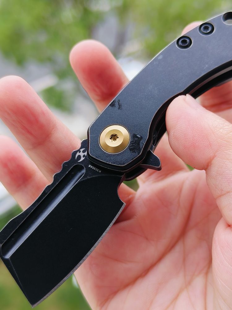产品描述: KANSEPT Mini Korvid Flipper Knife是一款精美的折刀,设计独特,具有出色的实用性和美学价值。该折刀采用黑色阳极氧化钛柄和黑色TiCn涂层的S35VN钢刀片,为用户提供卓越的性能和耐用性。