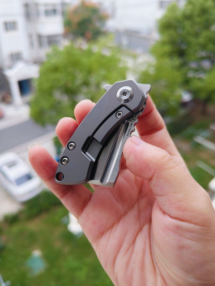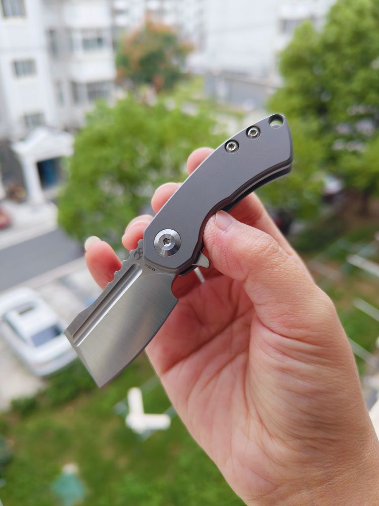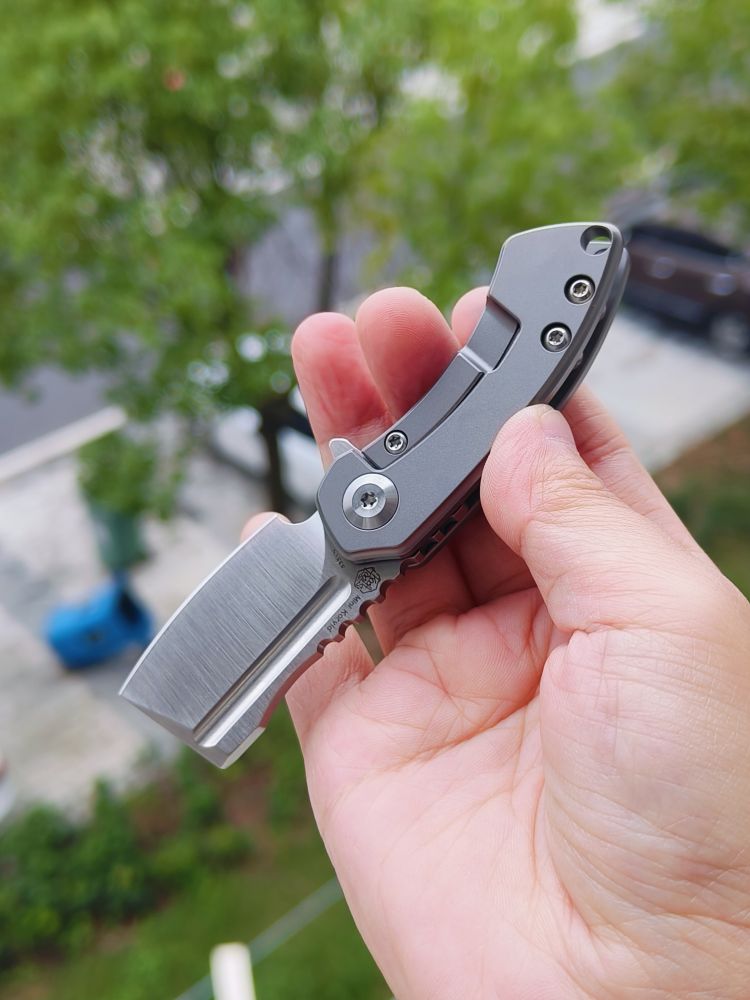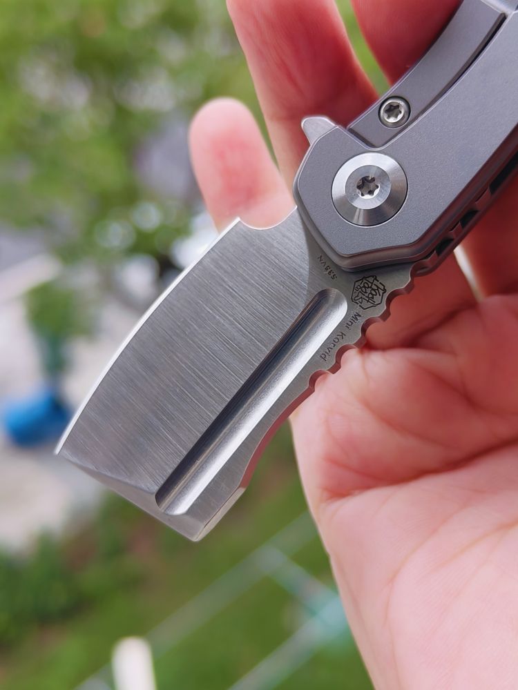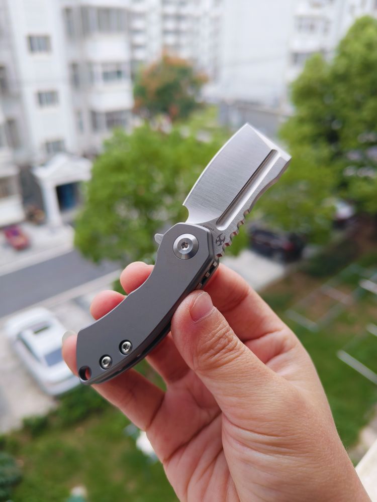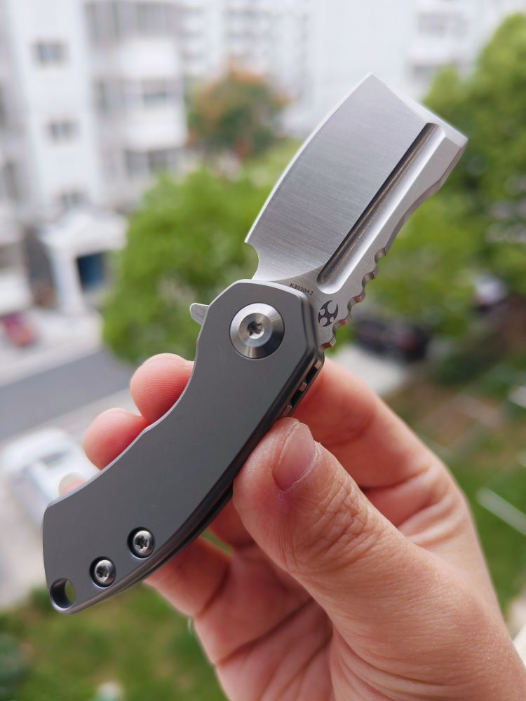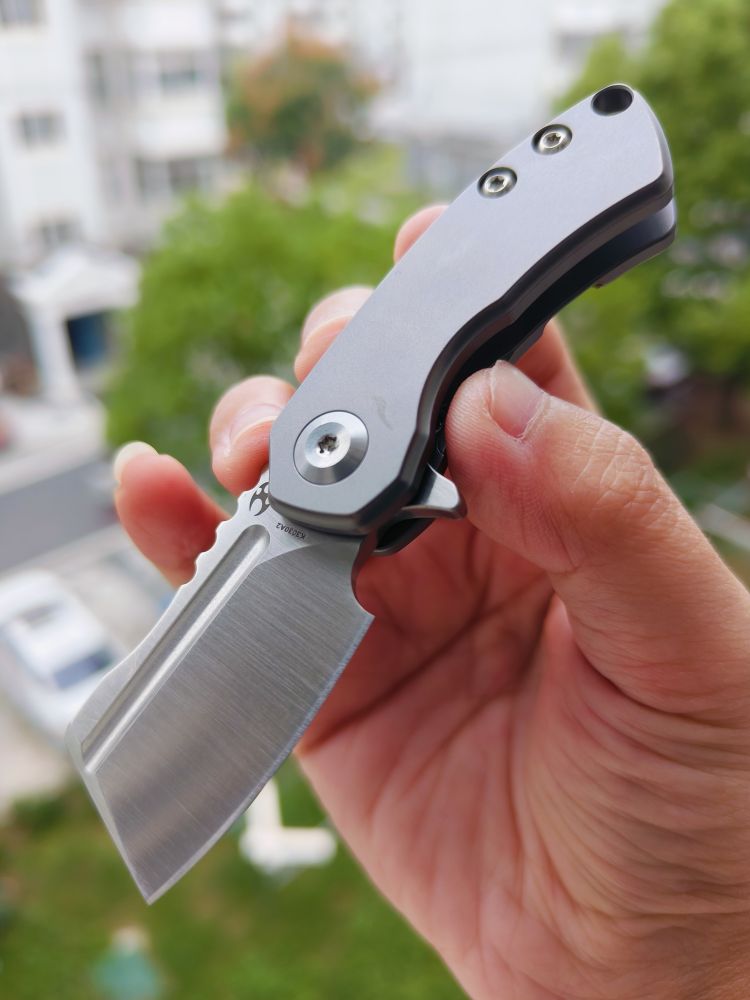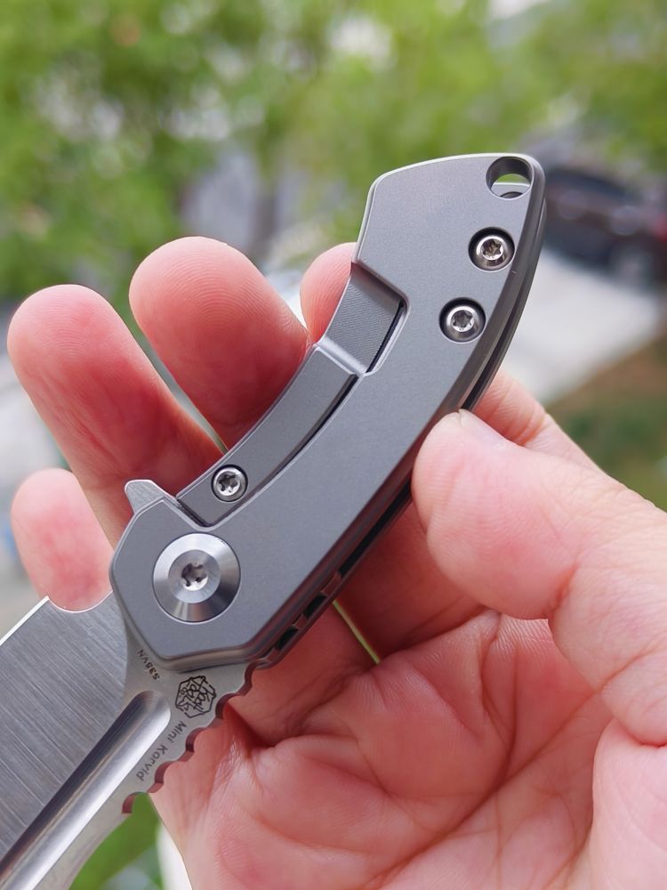 Mini Korvid是Kansep Knives的一款迷你折刀,具有独特的Cleaver(菜刀)形状刀片。它的喷砂钛柄提供了舒适的握持表面,并增加了防滑性能。刀具的操作非常流畅,可以轻松展开。刀片采用优质的CPM-S35VN刀钢制成,具有出色的切割性能和耐久性。