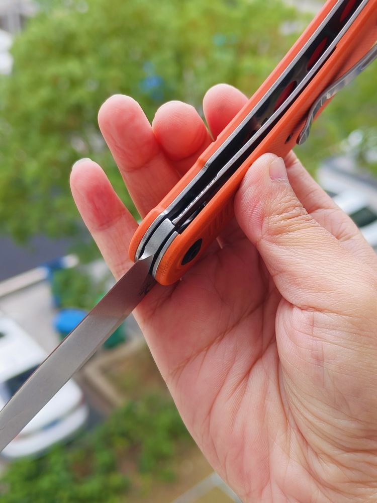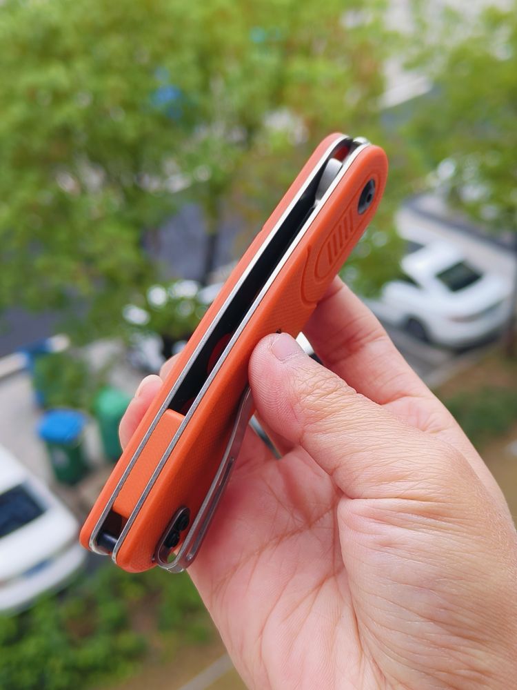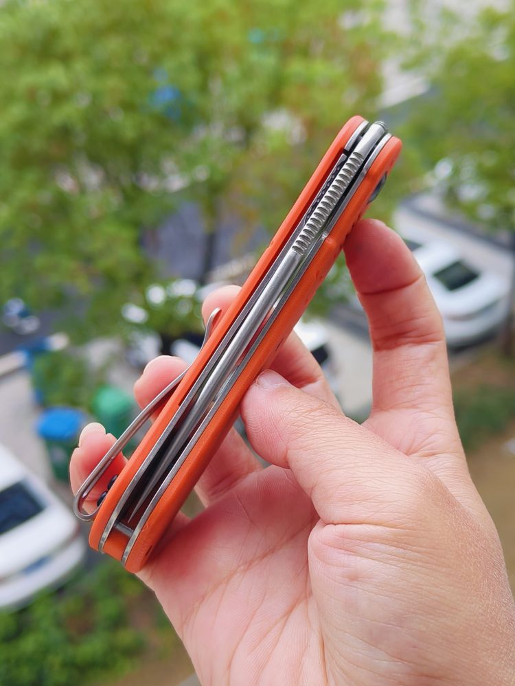 Reverie是Justin喜欢将经典和现代元素结合的一个很好的例子。Reverie的线条有些经典,但也加入了更多现代的元素,如对称的前翻转折叠片、托架锁、5槽图案和材料选择。这也是他第一次设计托架锁或使用隐藏的吊绳销。这两个设计元素都非常出色。托架锁不仅在视觉上很棒,而且还作为过度行程限制器,防止过度伸展。隐藏式吊绳销使喜欢使用吊绳的人可以使用吊绳,而那些不喜欢吊绳的人则不必看到刀上的大吊绳孔。