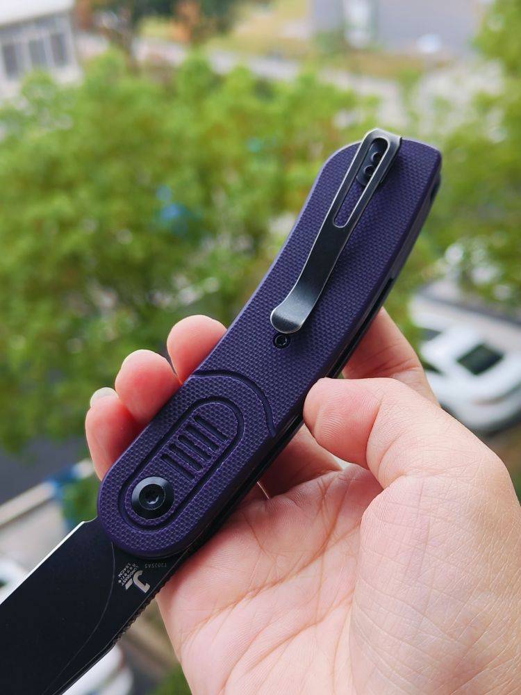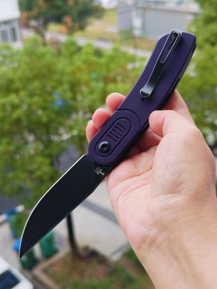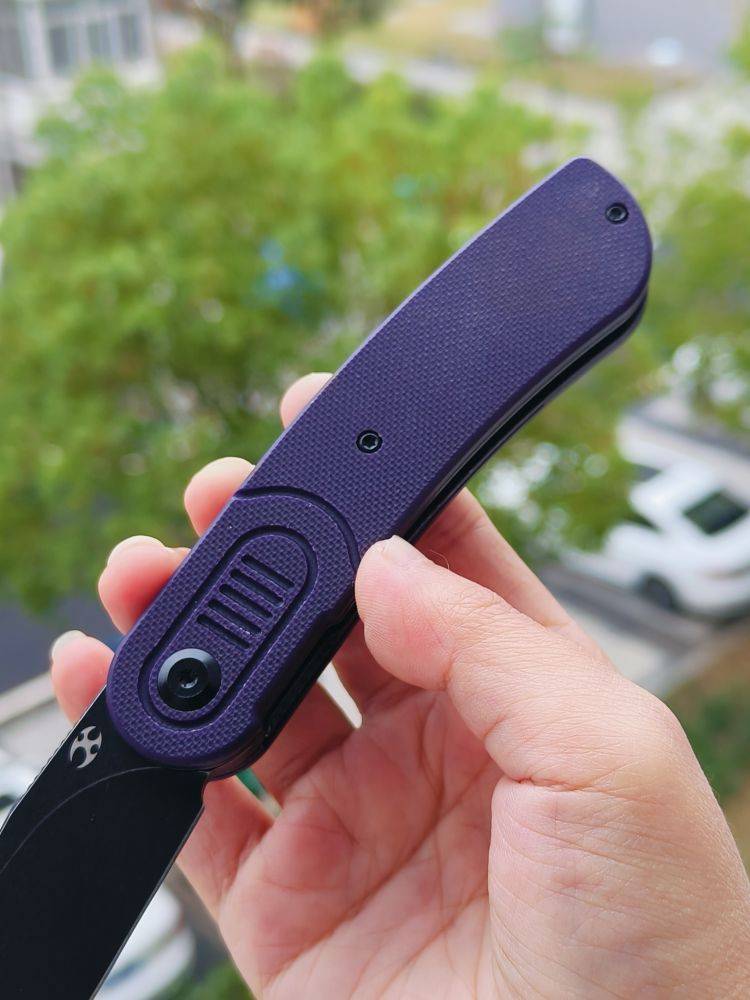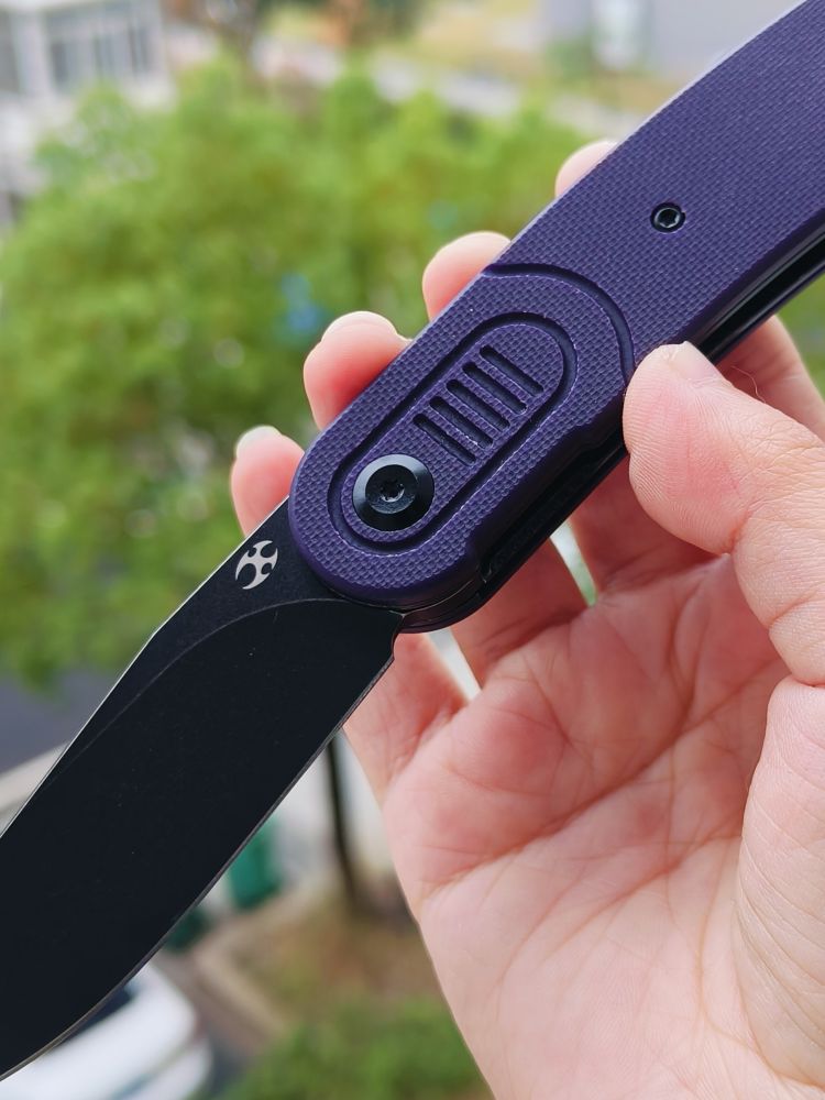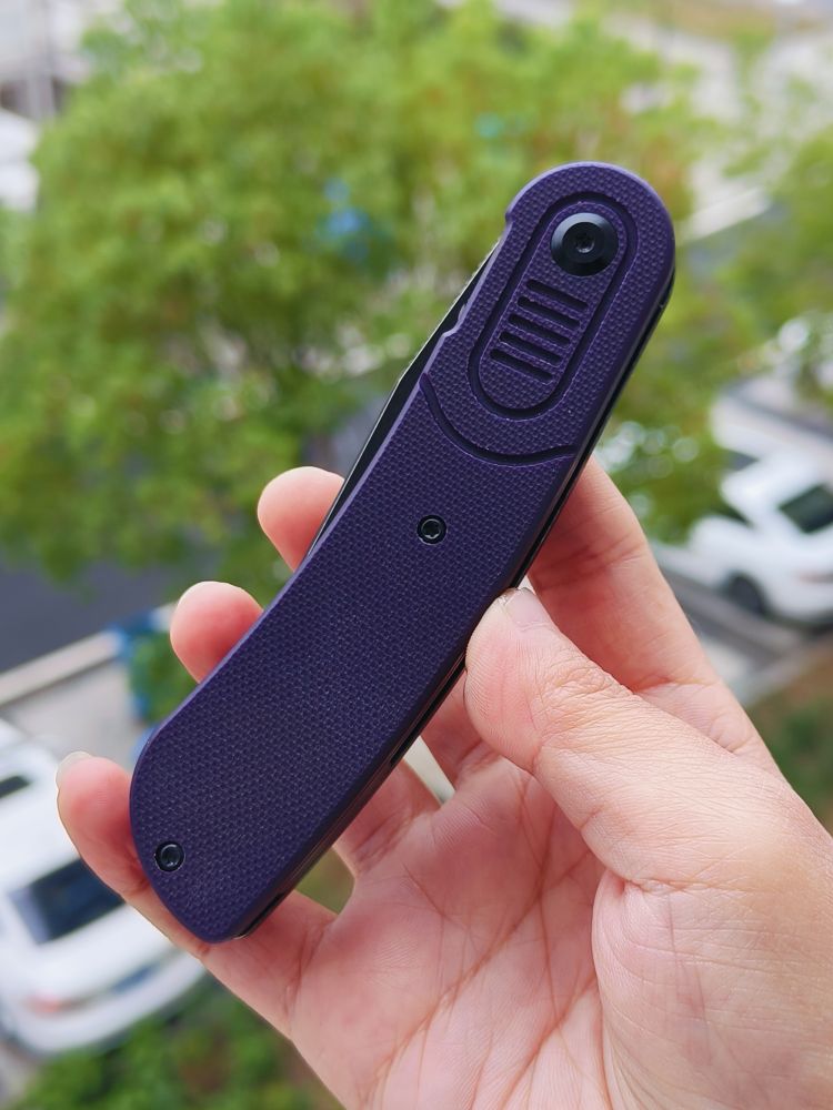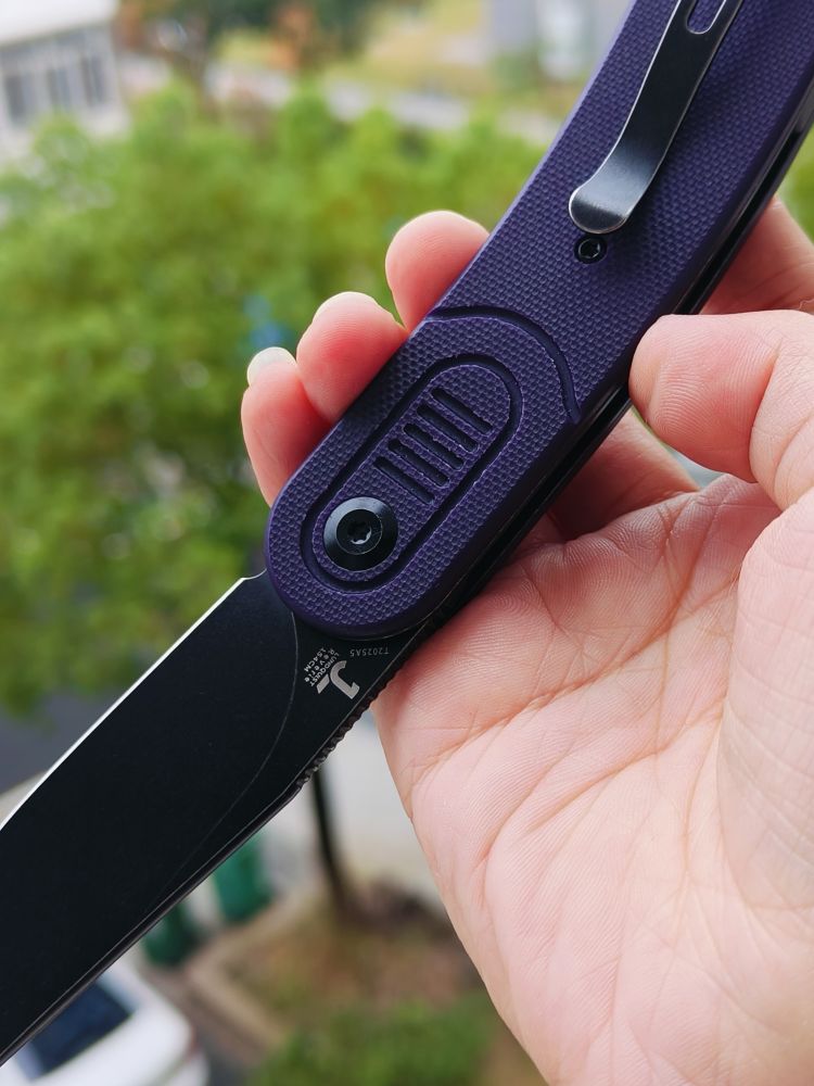 Reverie T2025B5是一款出色的折叠口袋刀,采用黑色石洗处理的154CM钢刀片和黑紫色G10手柄。该刀的设计灵感源自Justin Lundquist,他的设计融合了经典和现代元素。 Reverie刀的外观线条相对经典,但又加入了一些现代元素,如对称的前翻刀柄、托架锁、五槽图案和特殊材料。这是他首次设计托架锁,并使用隐藏的绳孔。托架锁不仅在视觉上非常出色,还可作为锁杆的过度限制,以防止过度伸展。隐藏的绳孔允许喜欢使用绳子的人使用,而不喜欢绳子的人则不必看到一个大的绳孔穿过刀身。