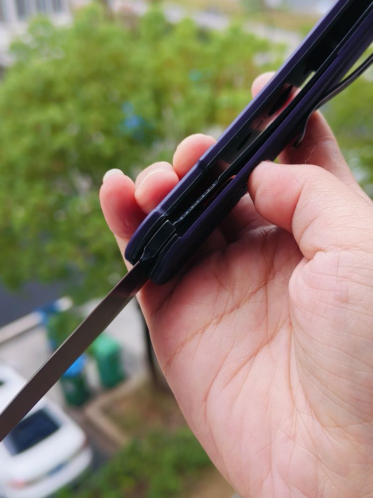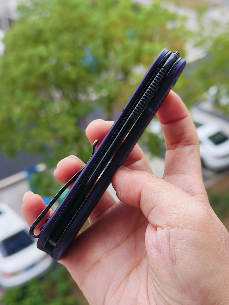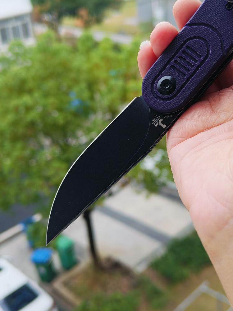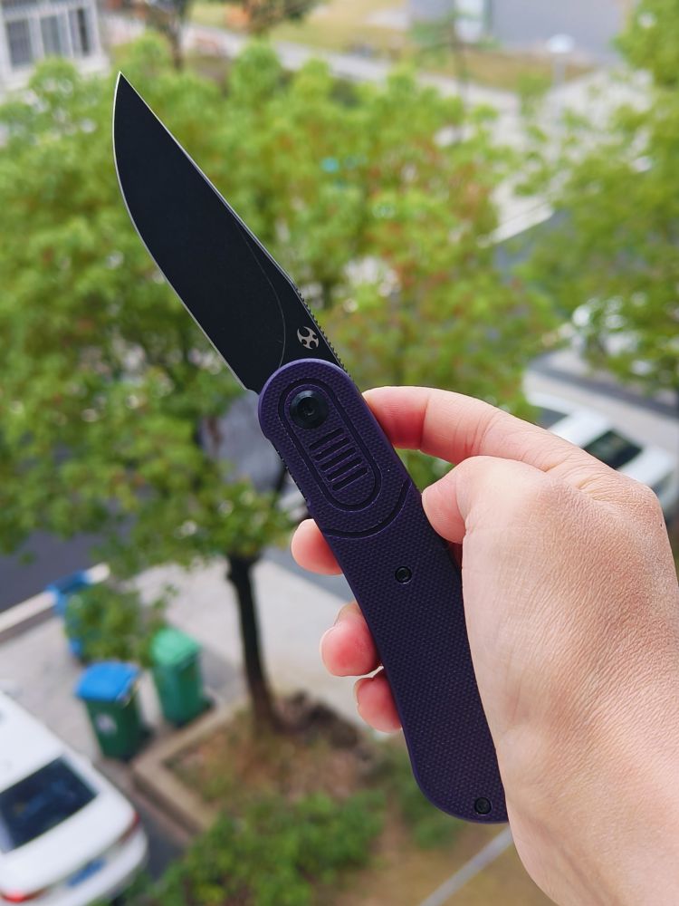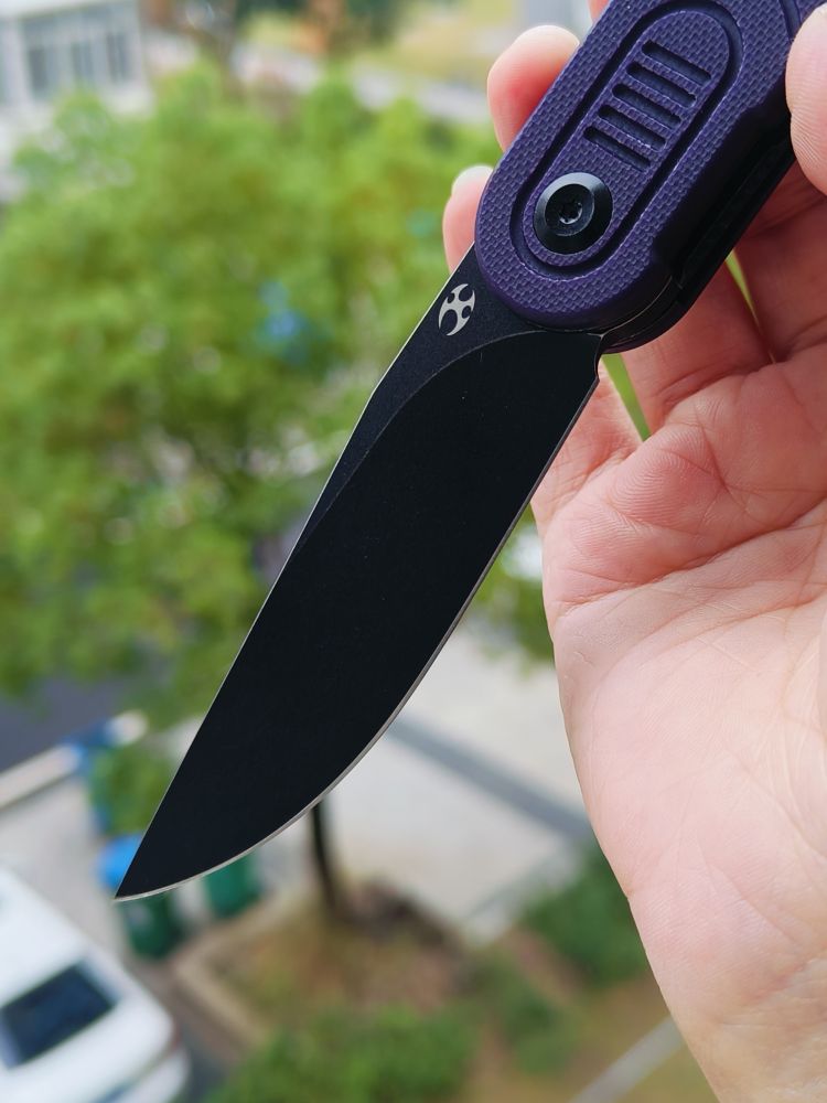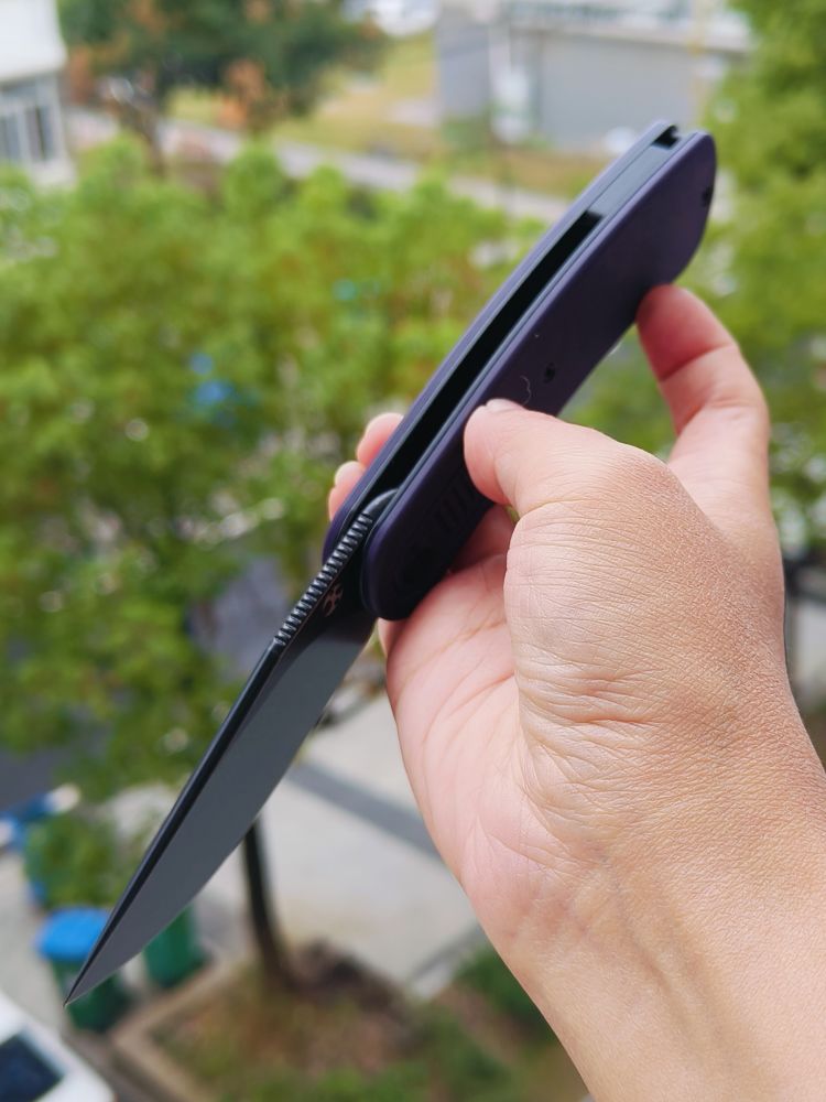 Reverie T2025B5是一款出色的折叠口袋刀,采用黑色石洗处理的154CM钢刀片和黑紫色G10手柄。该刀的设计灵感源自Justin Lundquist,他的设计融合了经典和现代元素。 Reverie刀的外观线条相对经典,但又加入了一些现代元素,如对称的前翻刀柄、托架锁、五槽图案和特殊材料。这是他首次设计托架锁,并使用隐藏的绳孔。托架锁不仅在视觉上非常出色,还可作为锁杆的过度限制,以防止过度伸展。隐藏的绳孔允许喜欢使用绳子的人使用,而不喜欢绳子的人则不必看到一个大的绳孔穿过刀身。