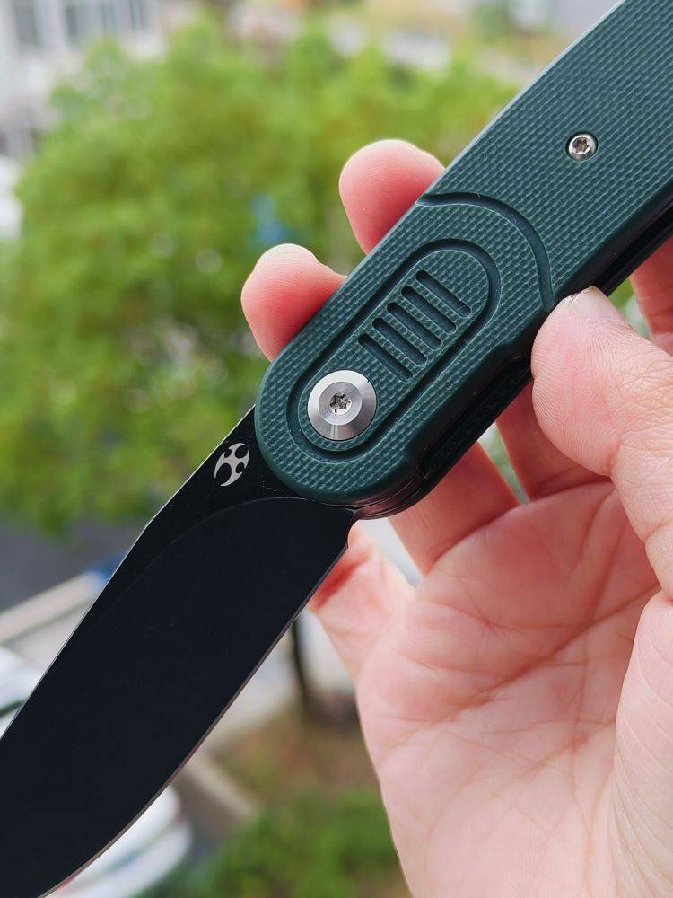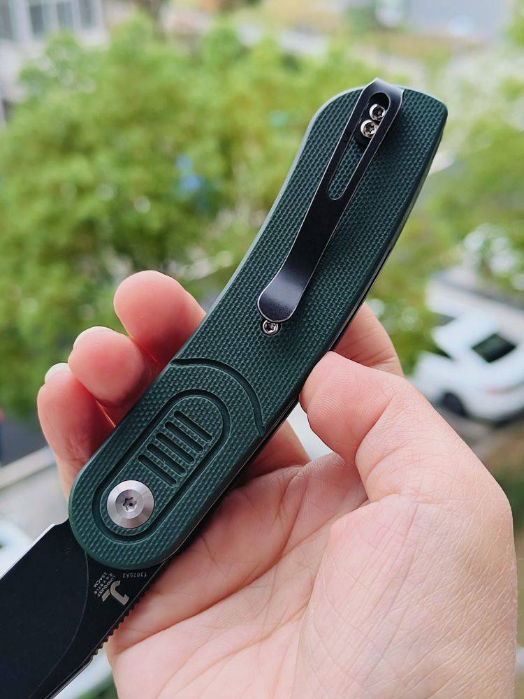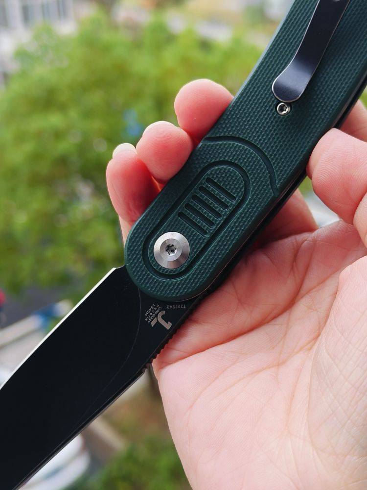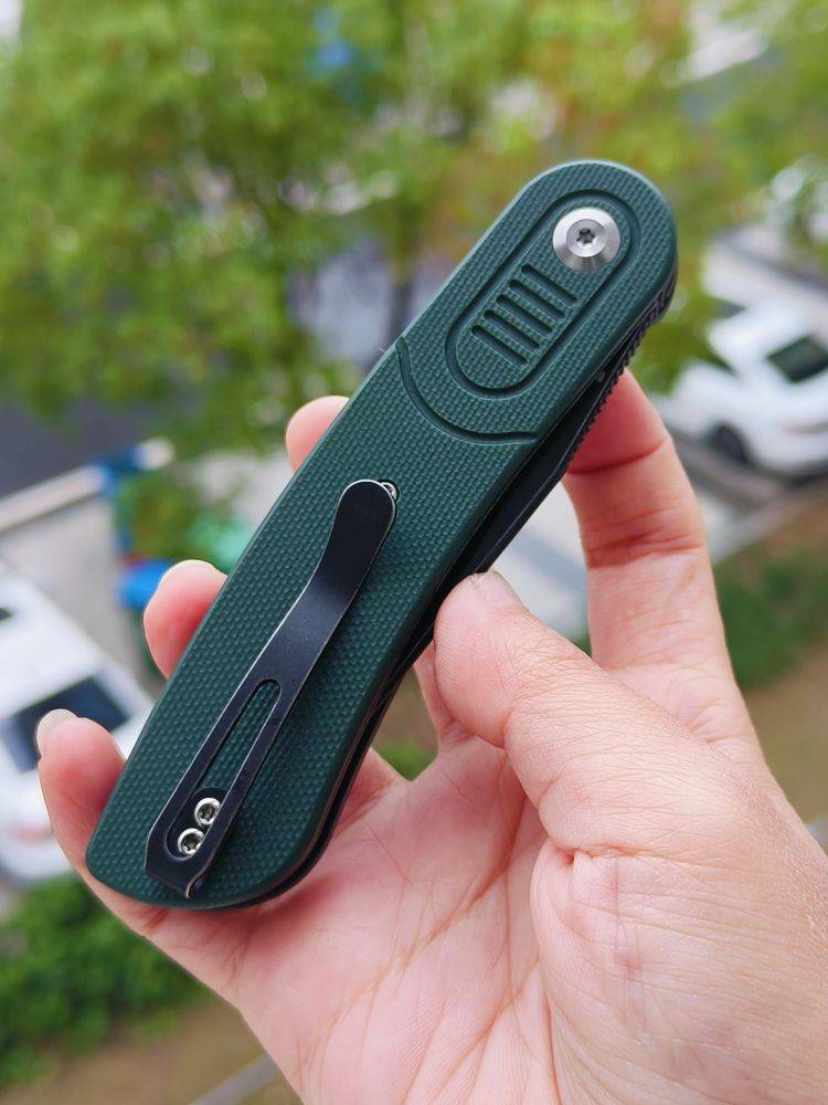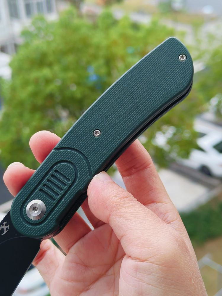- 绿色G10握柄,提供光滑的握持表面,舒适地放入口袋或手中。