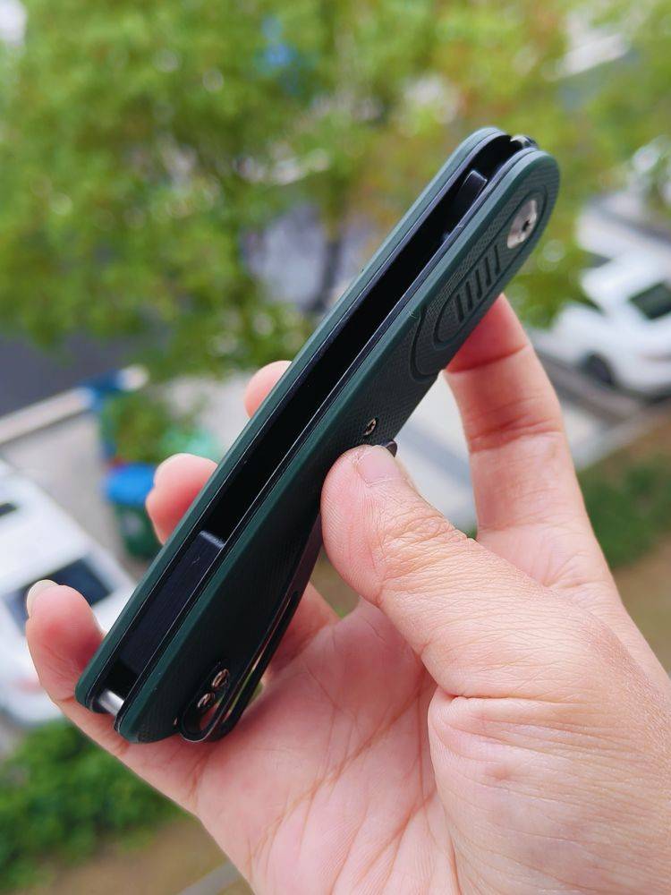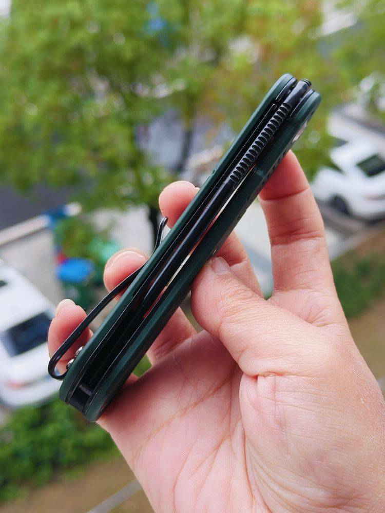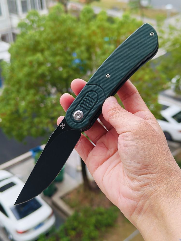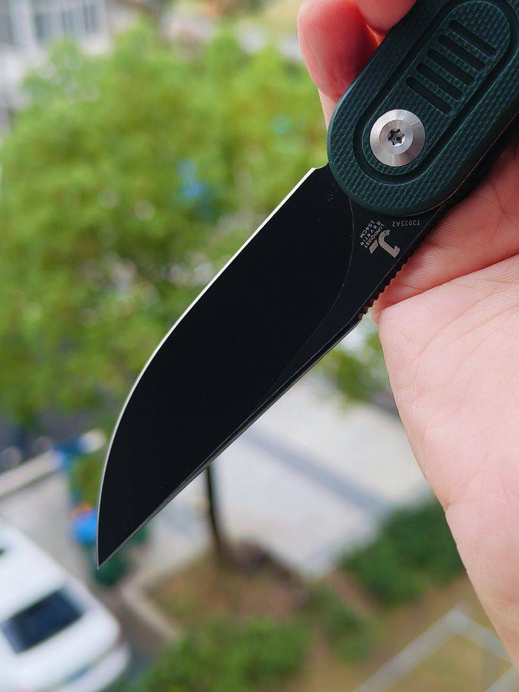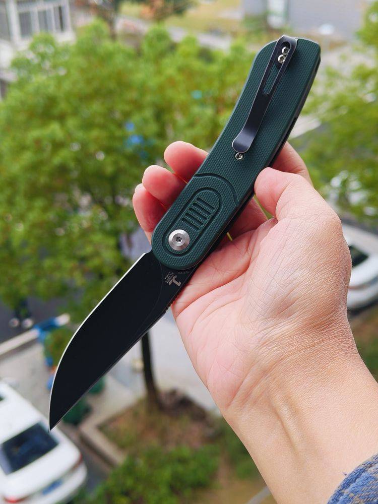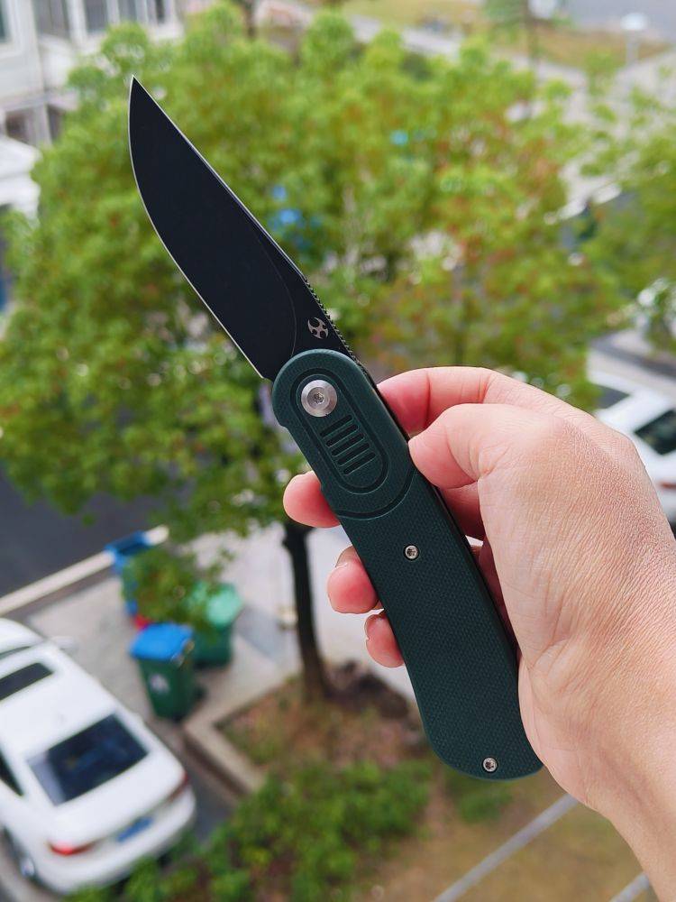 - 绿色G10握柄,提供光滑的握持表面,舒适地放入口袋或手中。