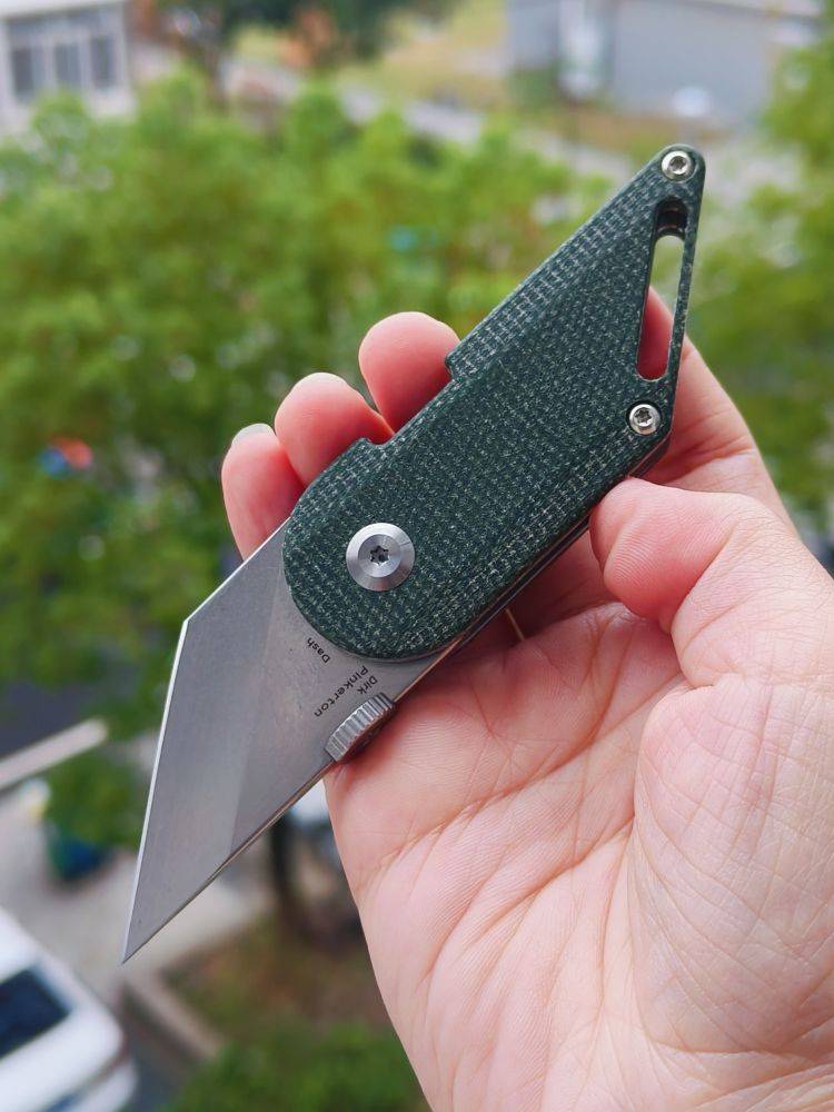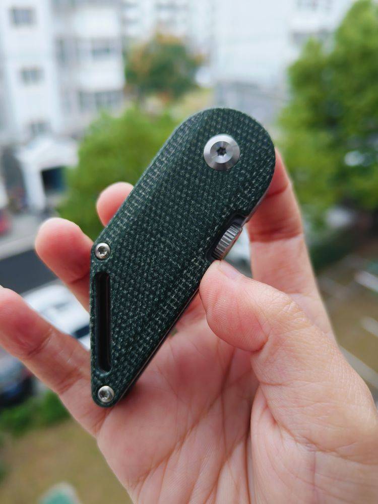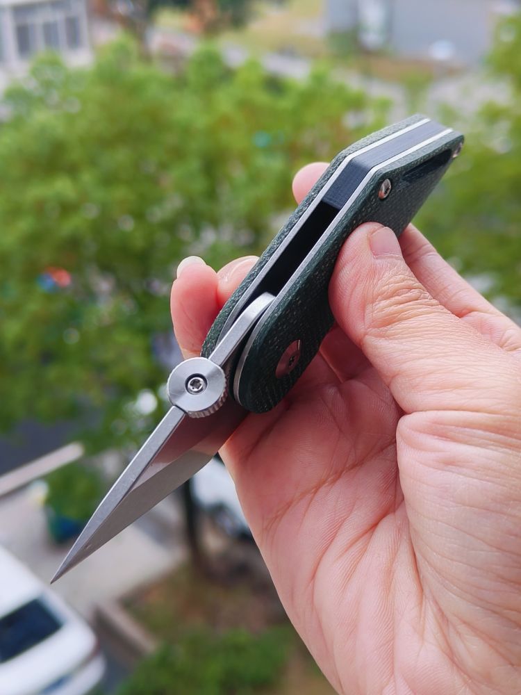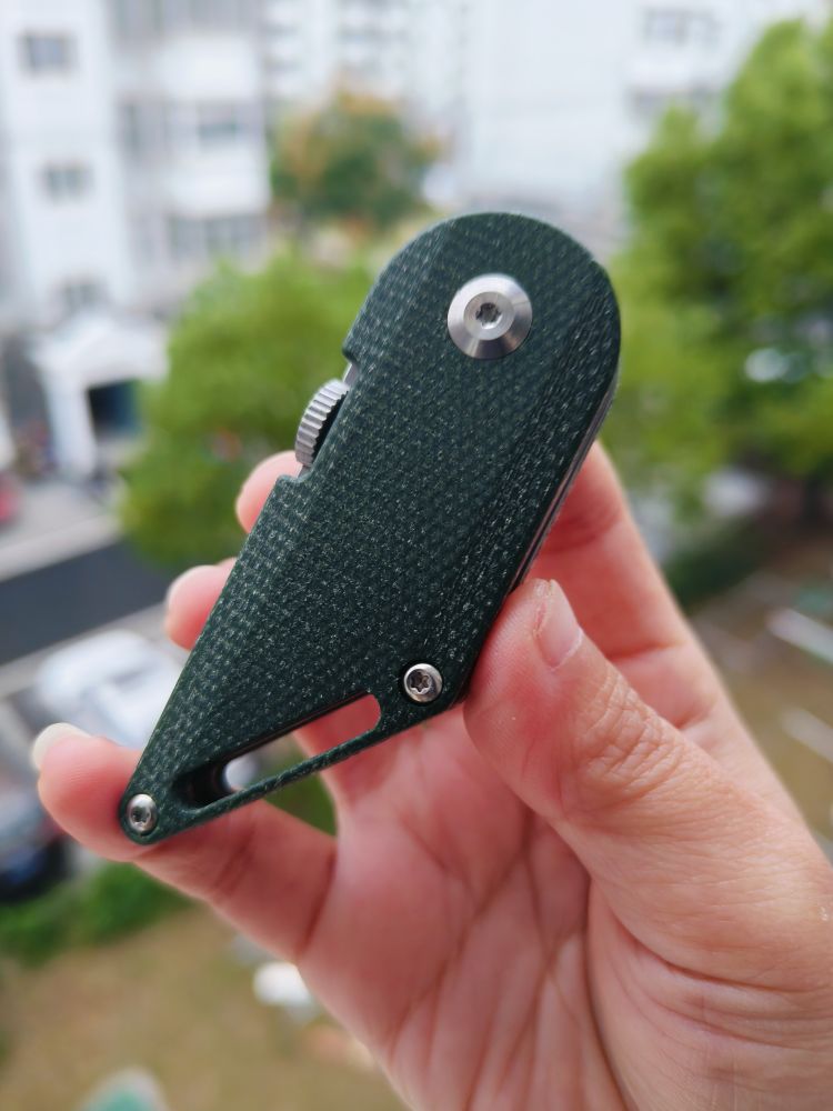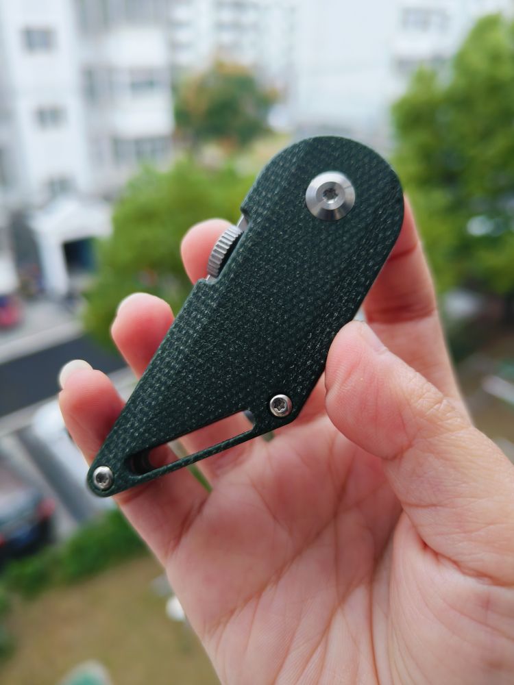 - 手柄材质:该折刀采用绿色米卡塔手柄,具有轻盈且舒适的握感,并提供良好的抓握力和防滑性能。手柄设计精美,使您能够轻松操控刀具。