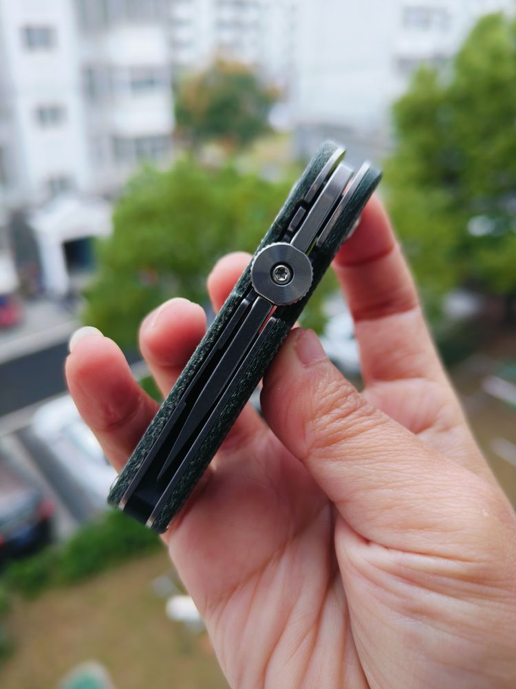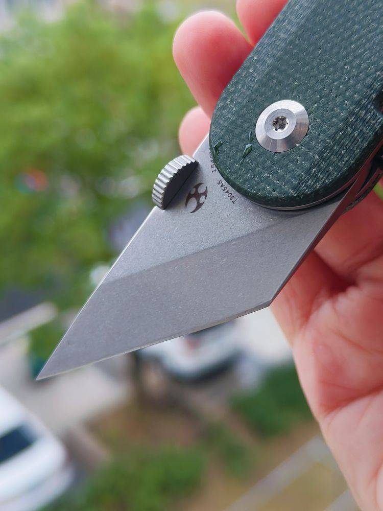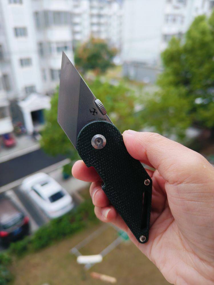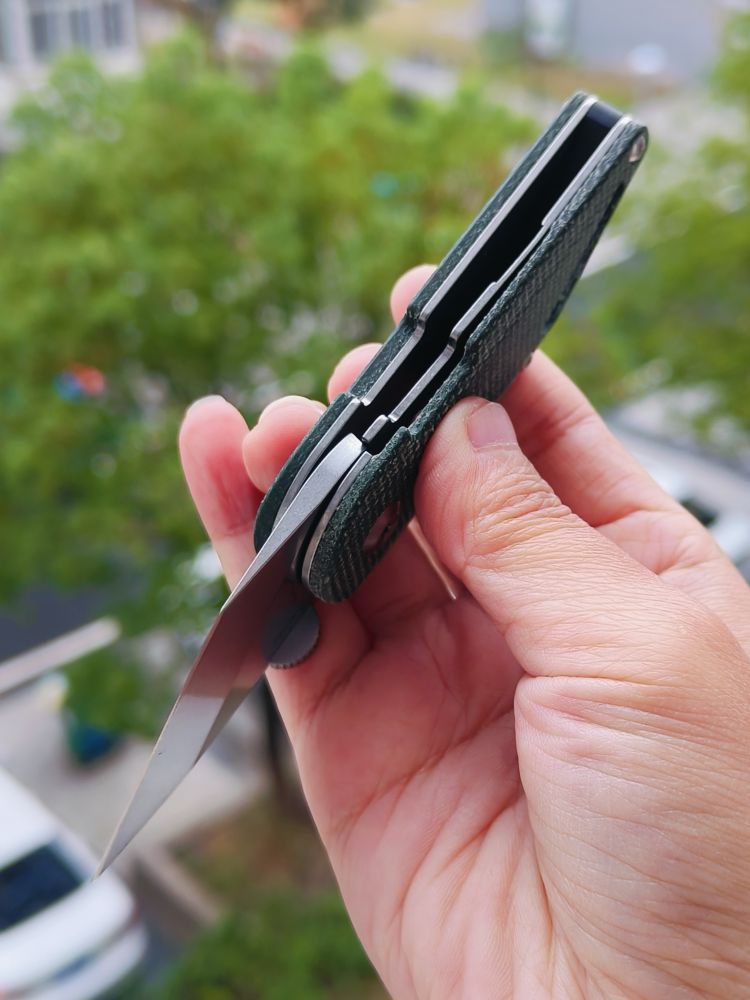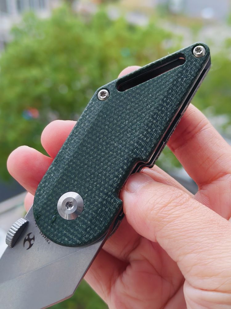 - 手柄材质:该折刀采用绿色米卡塔手柄,具有轻盈且舒适的握感,并提供良好的抓握力和防滑性能。手柄设计精美,使您能够轻松操控刀具。