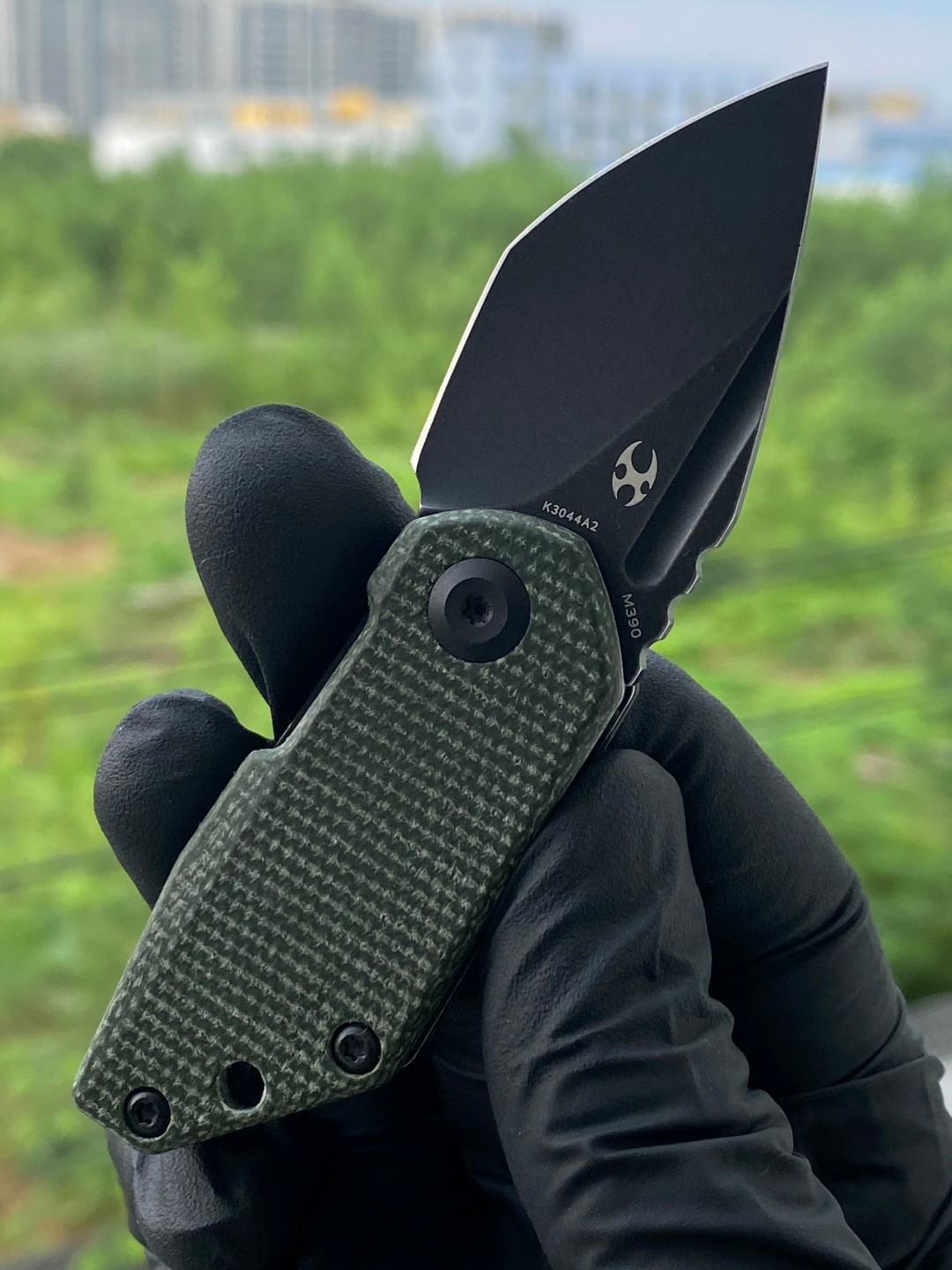 KANSEPT RIO Flipper Knife是一把高品质的折刀,采用独特而精美的设计。它配备了一把1.56英寸的M390黑色石洗刀片和绿色Micarta手柄。这款刀具采用4T5 Design的设计,展现了其独特而富有侵略性的线条,同时保持了简洁和美观的外观。它是一把小巧的微型折刀,便于携带。