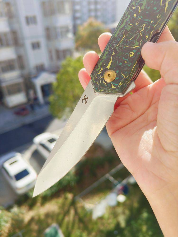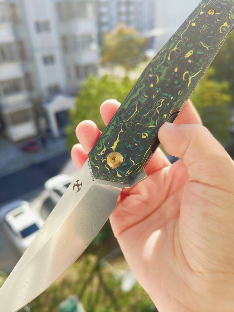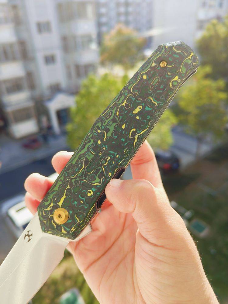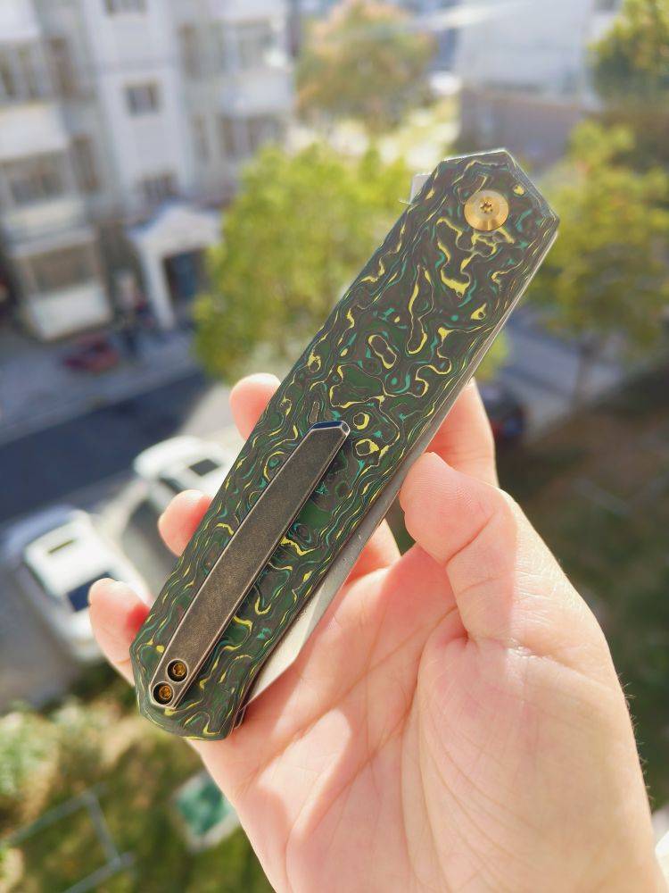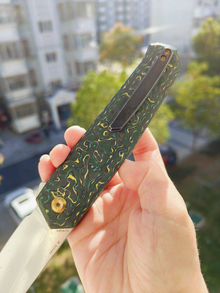 KANSEPT Integra 是一把设计精美的折刀。它采用绿色和黄色碳纤维手柄,配备3.63英寸的CPM S35VN刀片。这款折刀由JK Knives设计,以其坚固的结构、纤薄的外观和城市设计而闻名。