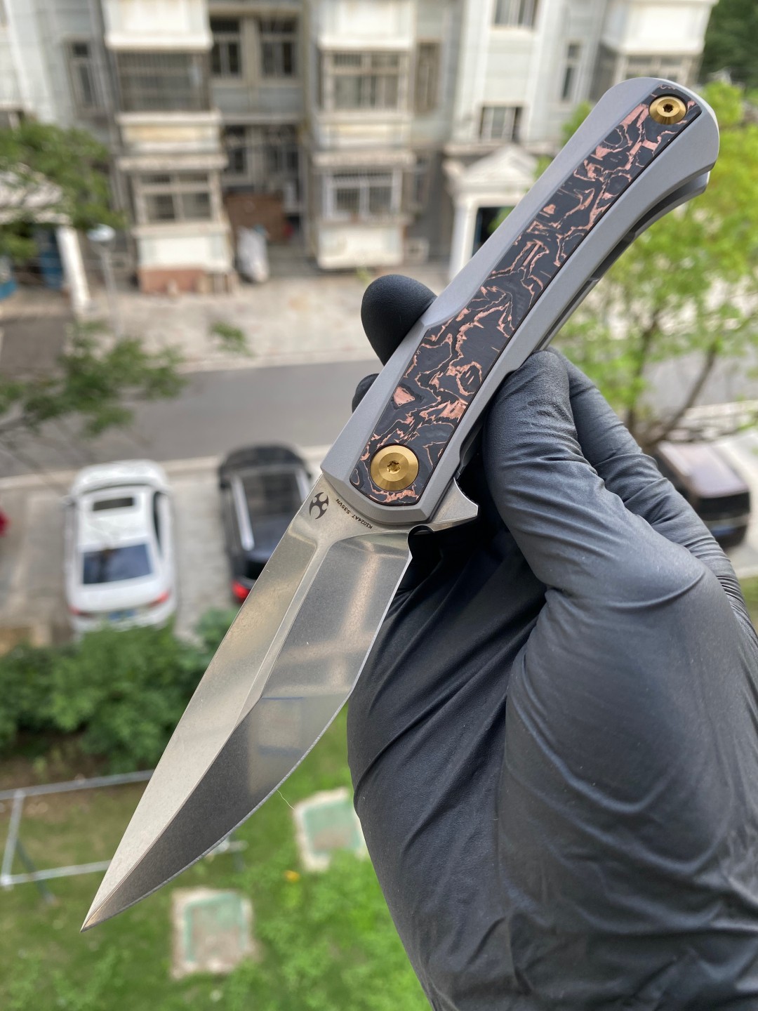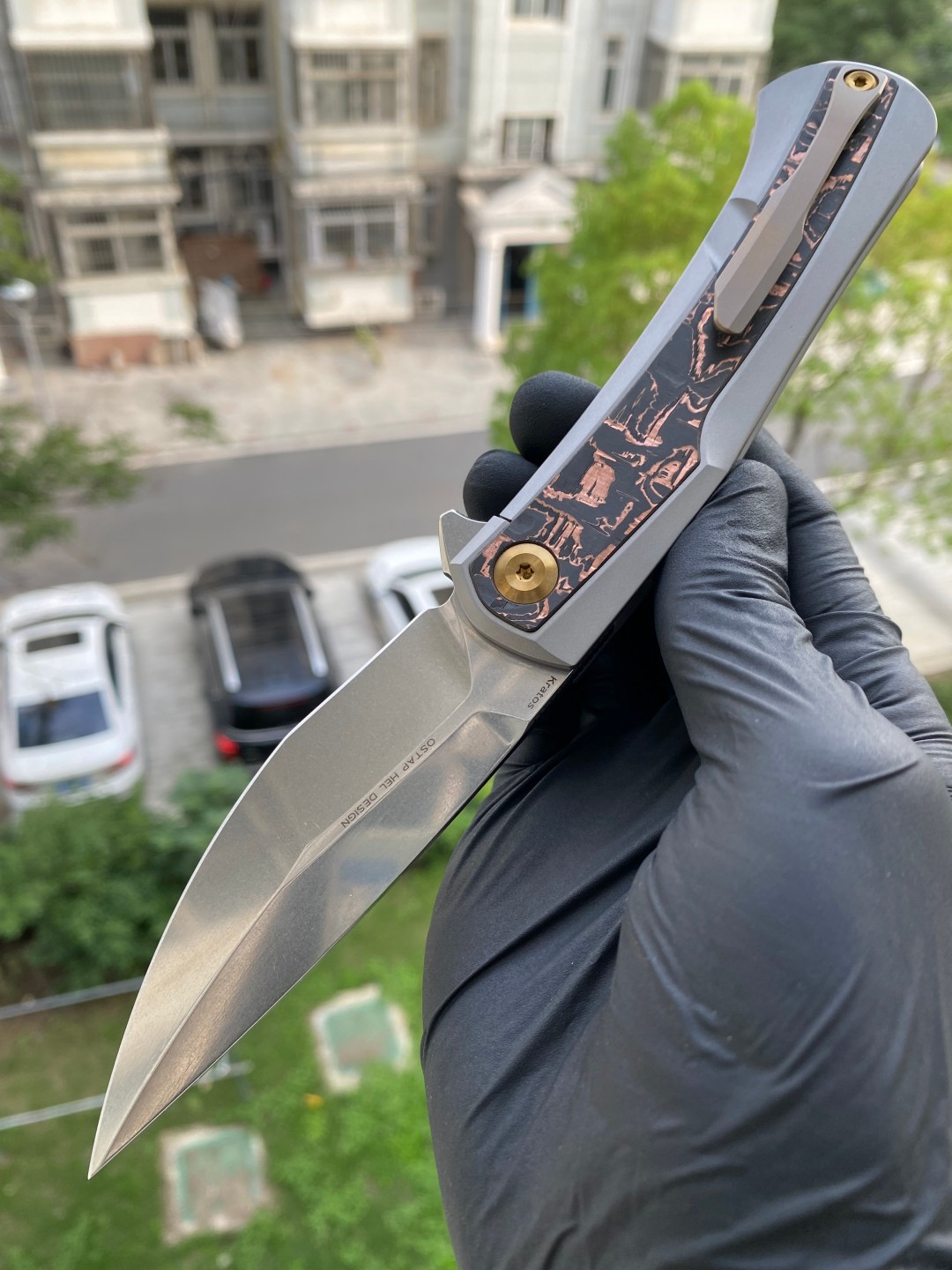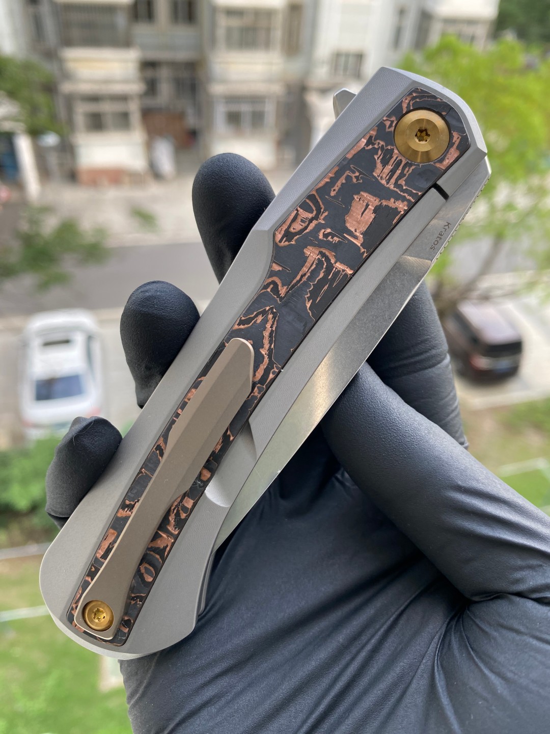 该刀具的手柄由钛金属和铜碳纤维镶嵌制成,提供了舒适的握持表面,无论是在口袋中还是在手中都能提供良好的手感。刀片采用磨砂处理的CPM S35VN钢材质,具有出色的刀刃保持性和耐用性。