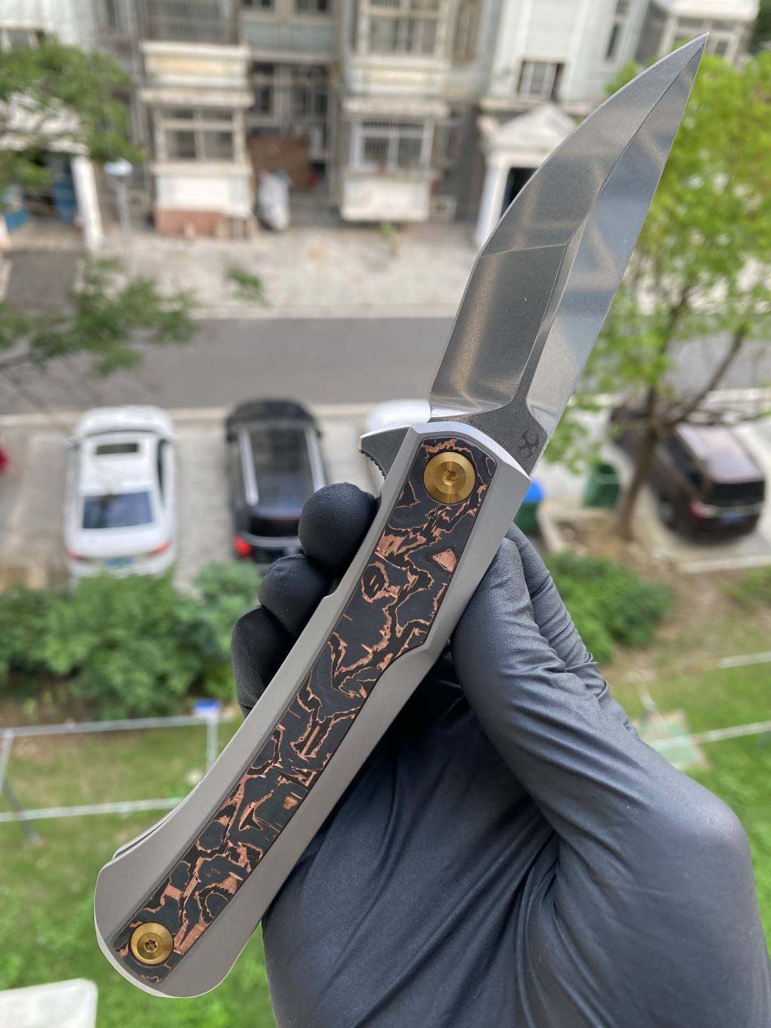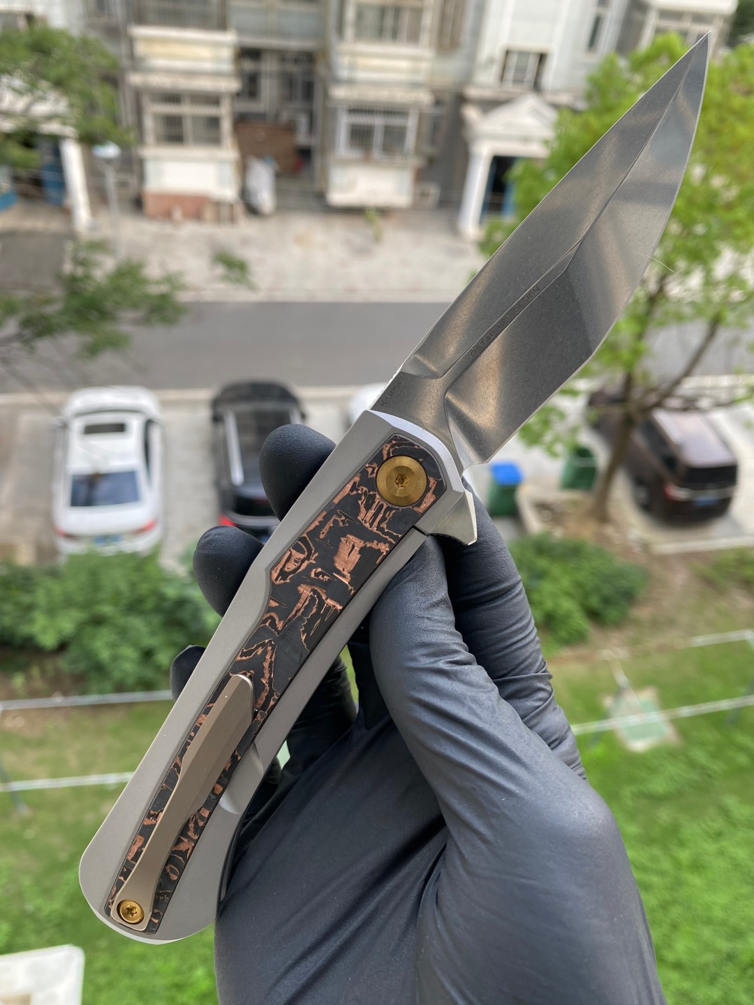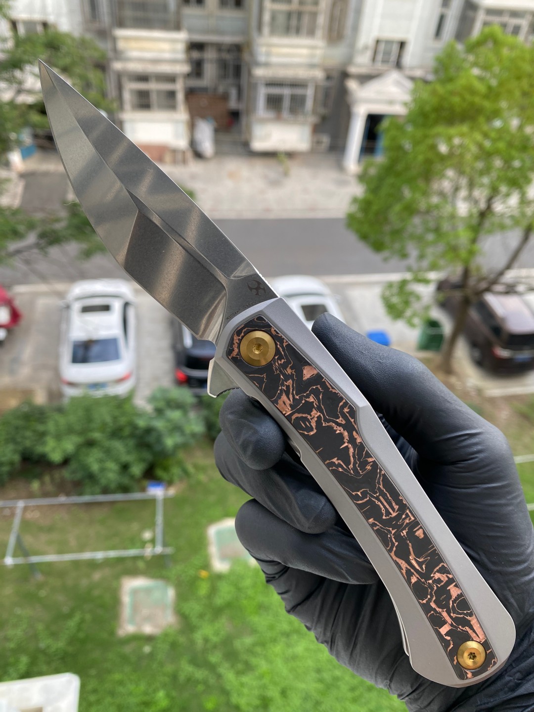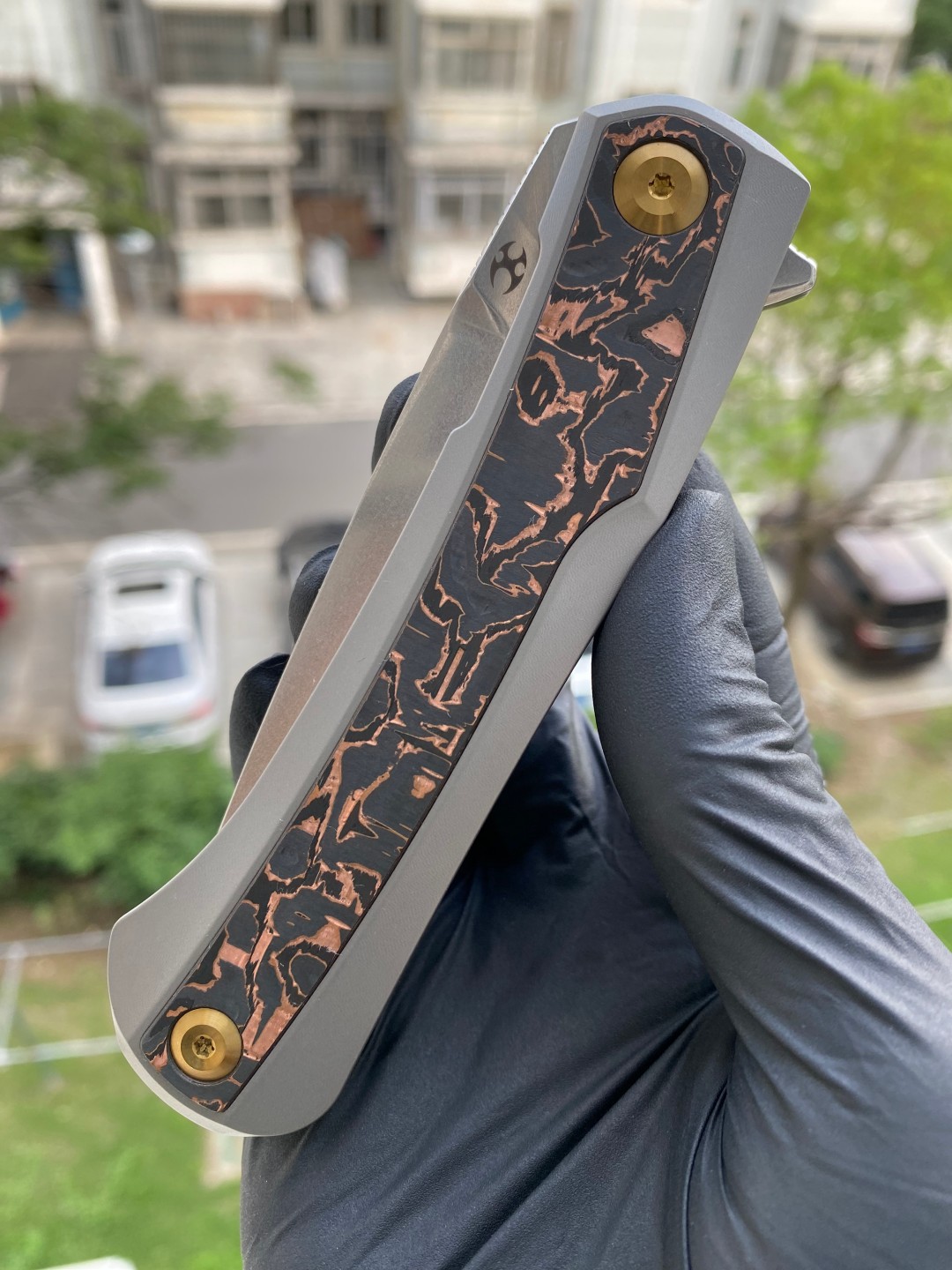该刀具的手柄由钛金属和铜碳纤维镶嵌制成,提供了舒适的握持表面,无论是在口袋中还是在手中都能提供良好的手感。刀片采用磨砂处理的CPM S35VN钢材质,具有出色的刀刃保持性和耐用性。