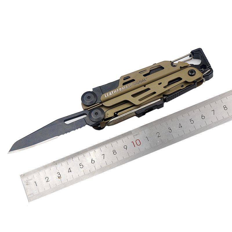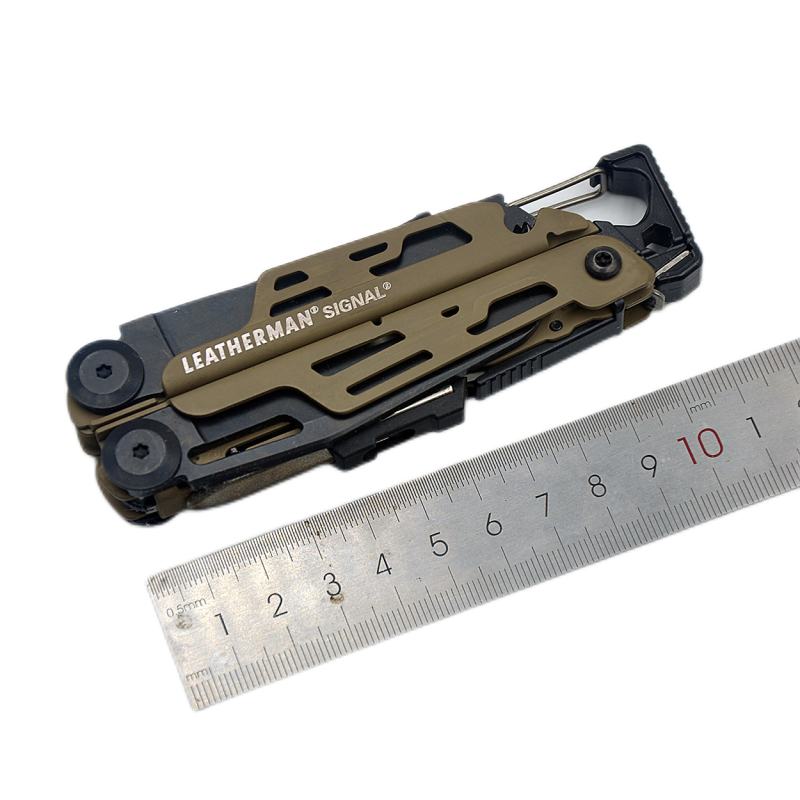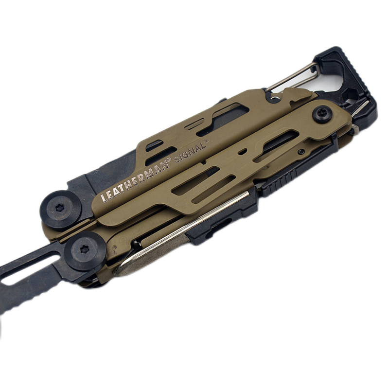 - 多功能设计: Leatherman Signal 是一把集成了多种工具的多功能刀具。除了传统的多工具功能(刀片、锯齿刃、螺丝刀、开瓶器等),它还包括一些专为户外使用设计的功能,如火种棒和紧急哨子。