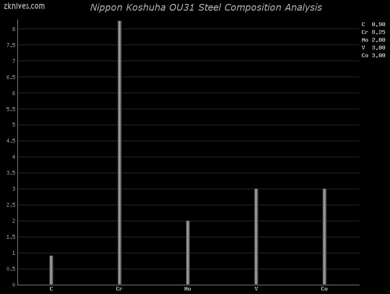 OU31(Nippon Koshuha) - PM 工具钢,可达到的工作硬度 ~64HRC。有几家公司为他们的刀具制造或测试了这种钢材,包括 Spyderco 和 SOG。此外,很少有定制刀具制造商报告测试或使用过它。日本手工刀品牌松田菊男广泛采用OU31钢材,也是此品牌将OU31钢材推进了刀友爱好者的视野。
