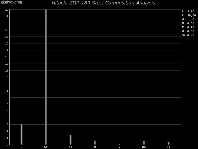 ZDP-189(日立) ,超级粉末钢。极高的碳和铬含量。C - 3% 和 Cr - 20%。硬度非常高,几家厂商将其硬化到65甚至67HRC。你也可以猜到非常昂贵。ZDP-189钢和 Cowry-X 钢非常相似,因为这两者具有相同的 C 和 CR 含量。2009 年,Henckels 在东京的代表确实确认 MC66 是其 ZDP-189 的代号,目标中值硬度为 66HRC。后来,2010 年 Henckels 日本业务负责人联系了我,我从消息来源获得了第一手确认,即 MC66 是 ZDP-189。确切的元素构成未知,无论我在刀钢图表中有什么,日立都没有确认。与 Cowry-X 不同,ZDP-189 含有钼、钨和钒。目前,基于 Spyderco Data 的合成更加精确。总的来说,非常好的边缘保持力和韧性。