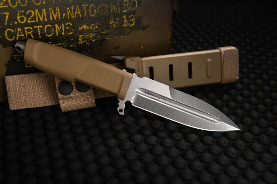 CONTACT C 是 CONTACT 的紧凑型版本,配备 Böhler N690 钢矛尖刀片,经过 58 HRC 硬化处理,配有单分支护木和全长加长器,轻便。Forprene 握把由螺纹柄脚固定,使刀坚固且平衡。注塑成型、冲击级尼龙、MOLLE 兼容刀鞘具有避免刀片发出嘎嘎声的阻尼系统、双按钮安全环和通过简单按压扳机式杠杆即可脱离的固定安全装置。