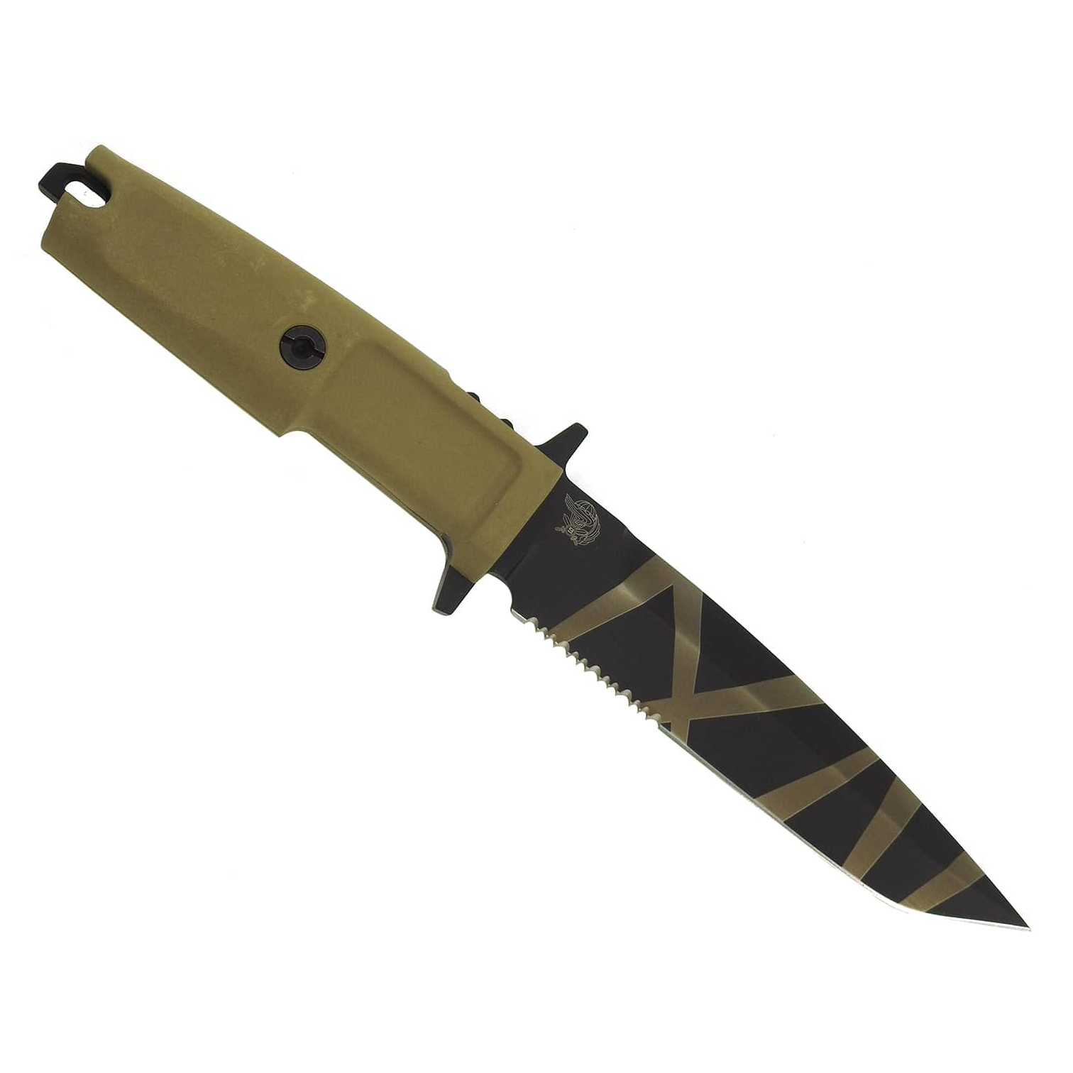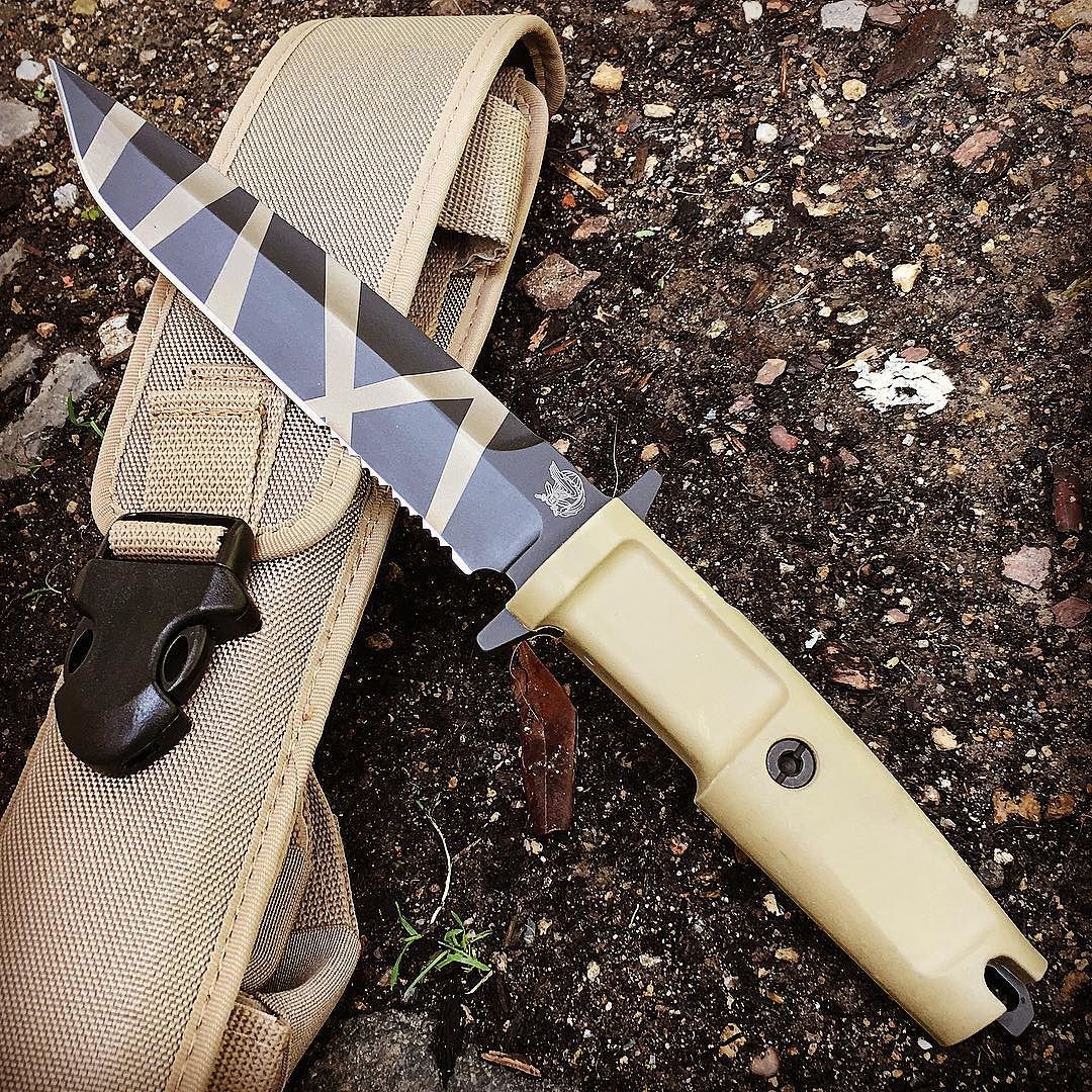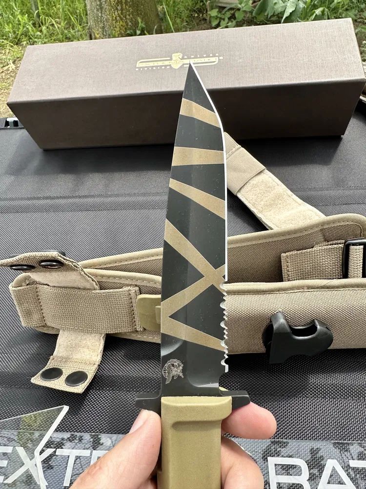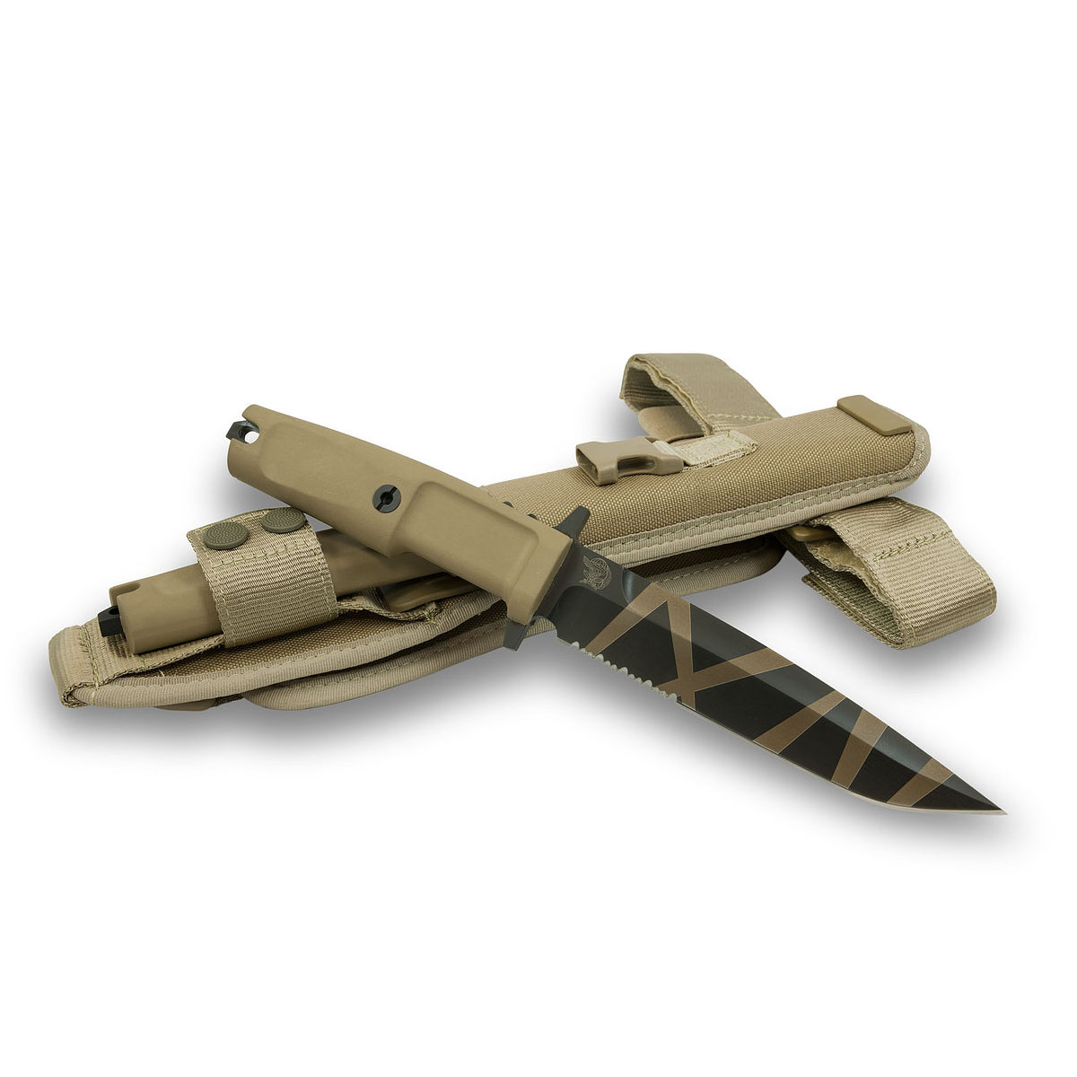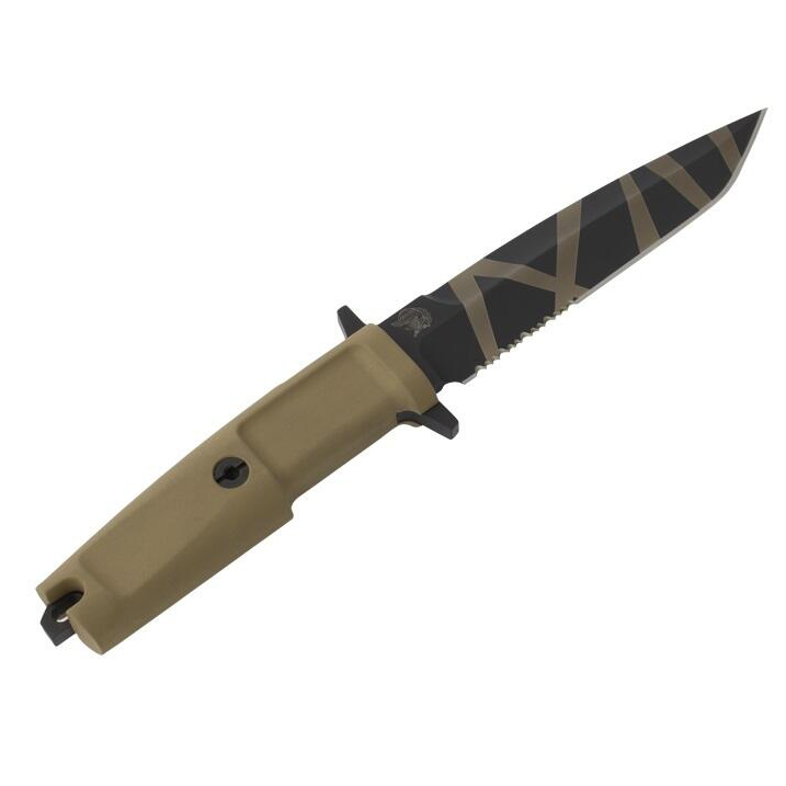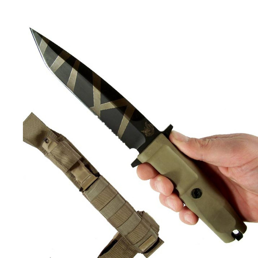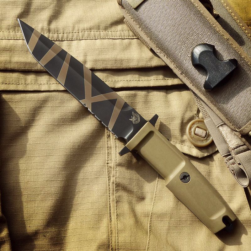 这是一把典型的战斗刀,为著名的意大利特种部队第 9 伞兵突击团“Col Moschin”定制,并于 2002 年正式采用。它代表了对阿尔迪蒂(Arditi)的当代改造——这支历史力量追随了第九步行者的脚步——它具有不对称的刀片和笔直但方向敏感的刀柄。设计轻巧、方便,刀柄处保持平衡,刀尖具有高穿孔能力。每个新的“Incursore”(突击伞兵)都会配发一把这样的刀,并接受训练以充分利用它。