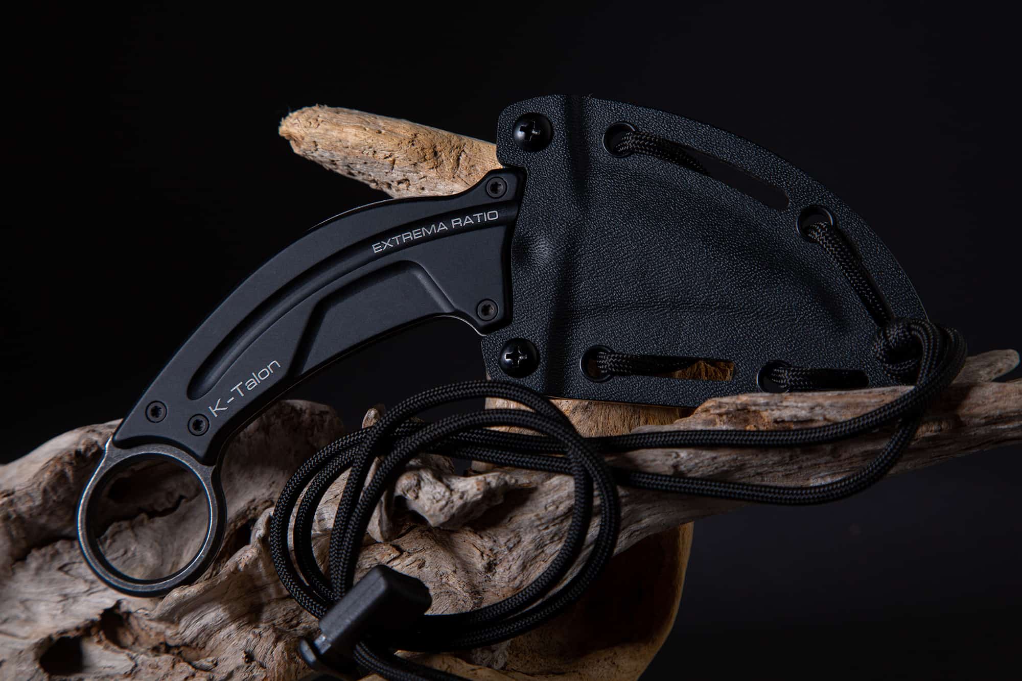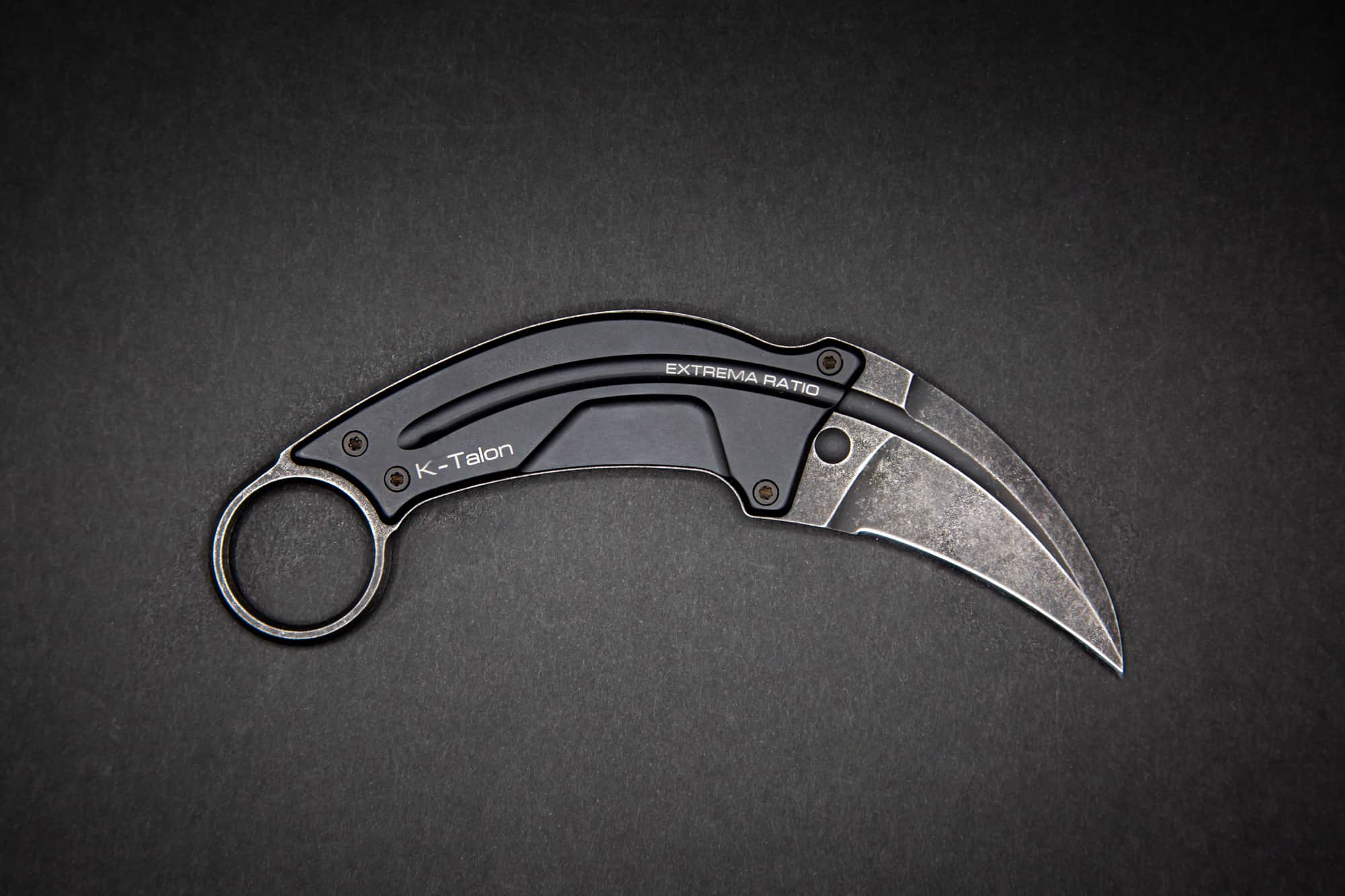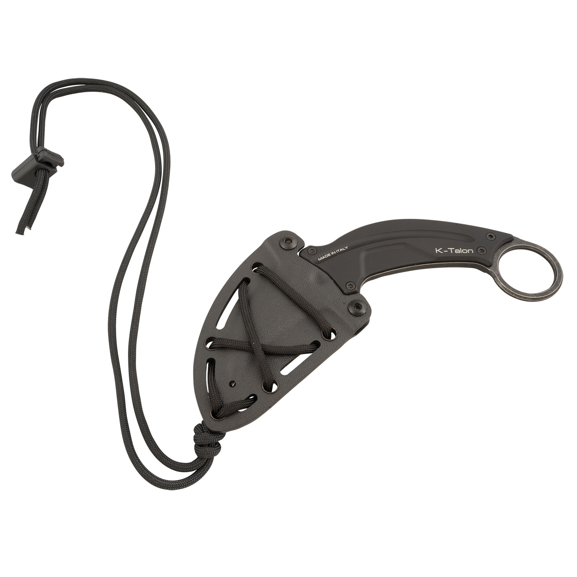 K-Talon是一种具有全柄脚结构的固定刀片卡姆比特。它的形状特别薄,包括鞘和鳞片在内的厚度仅为10毫米。弯曲的钩状刀片的灵感来自于爪子的形状。它的设计目的是进行清晰而深的切割以及钩住、抓住和/或撕裂。背面的环设计用于在任何情况下都能安全牢固地抓握。这样刀就不会打滑,并且很难解除武装并指向使用者。