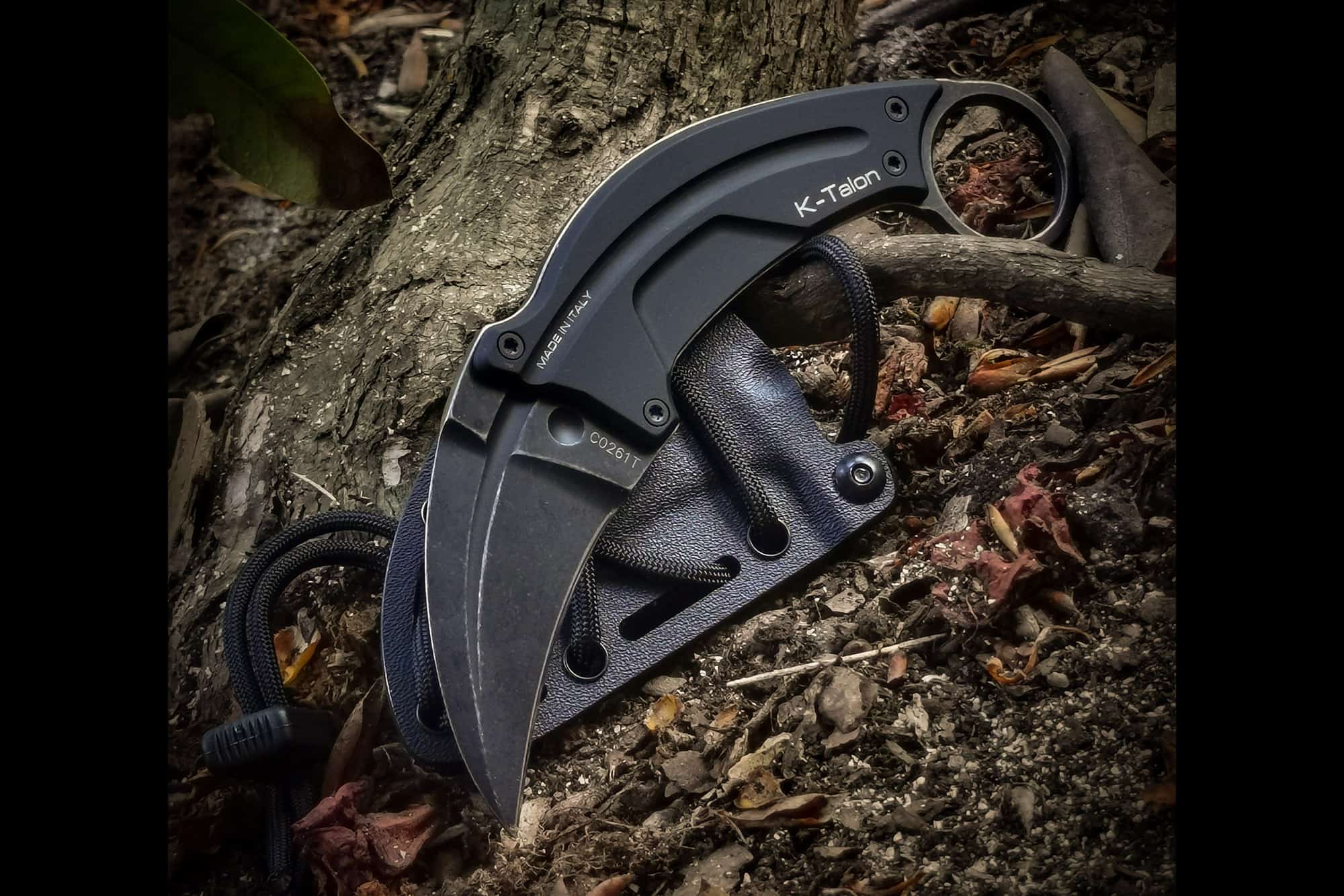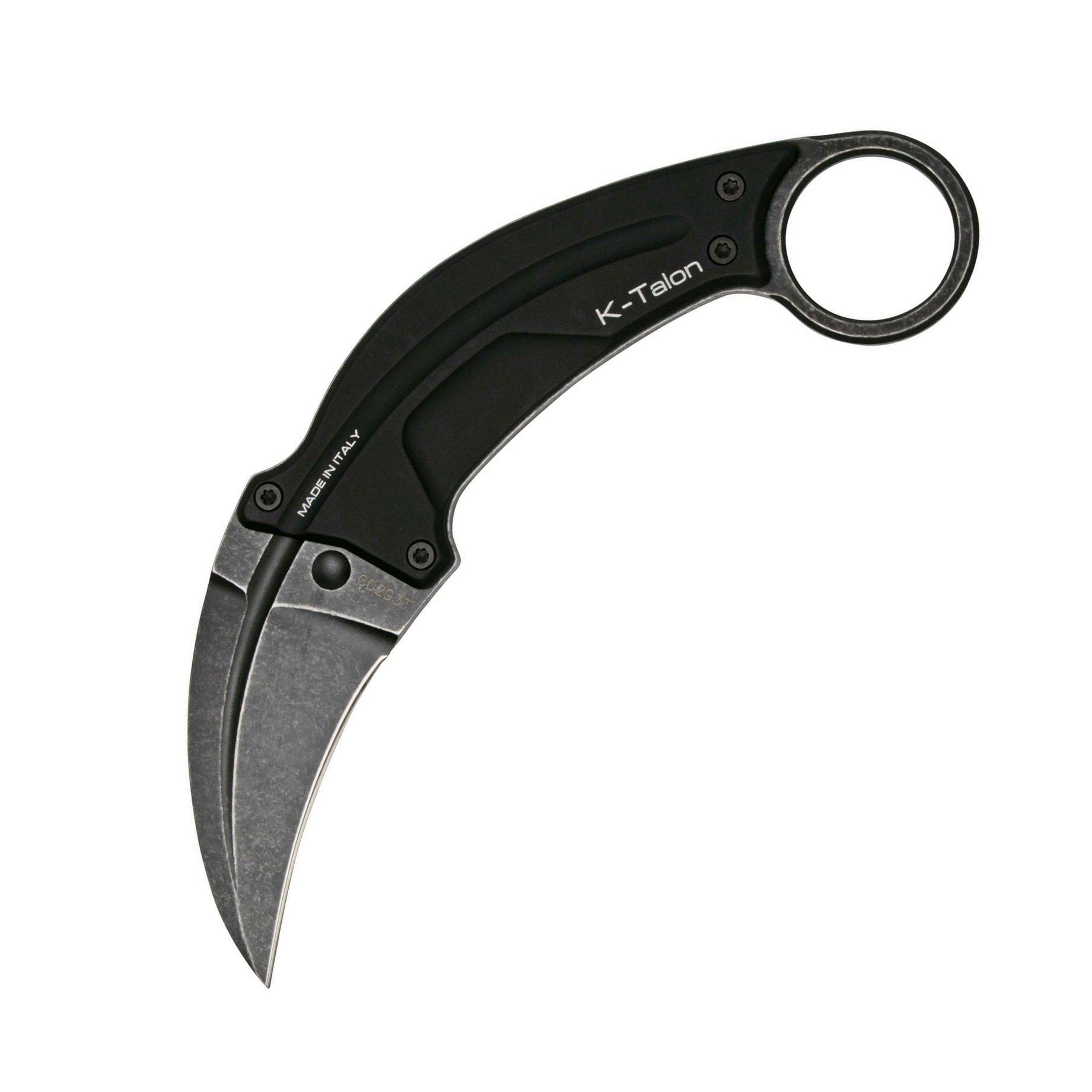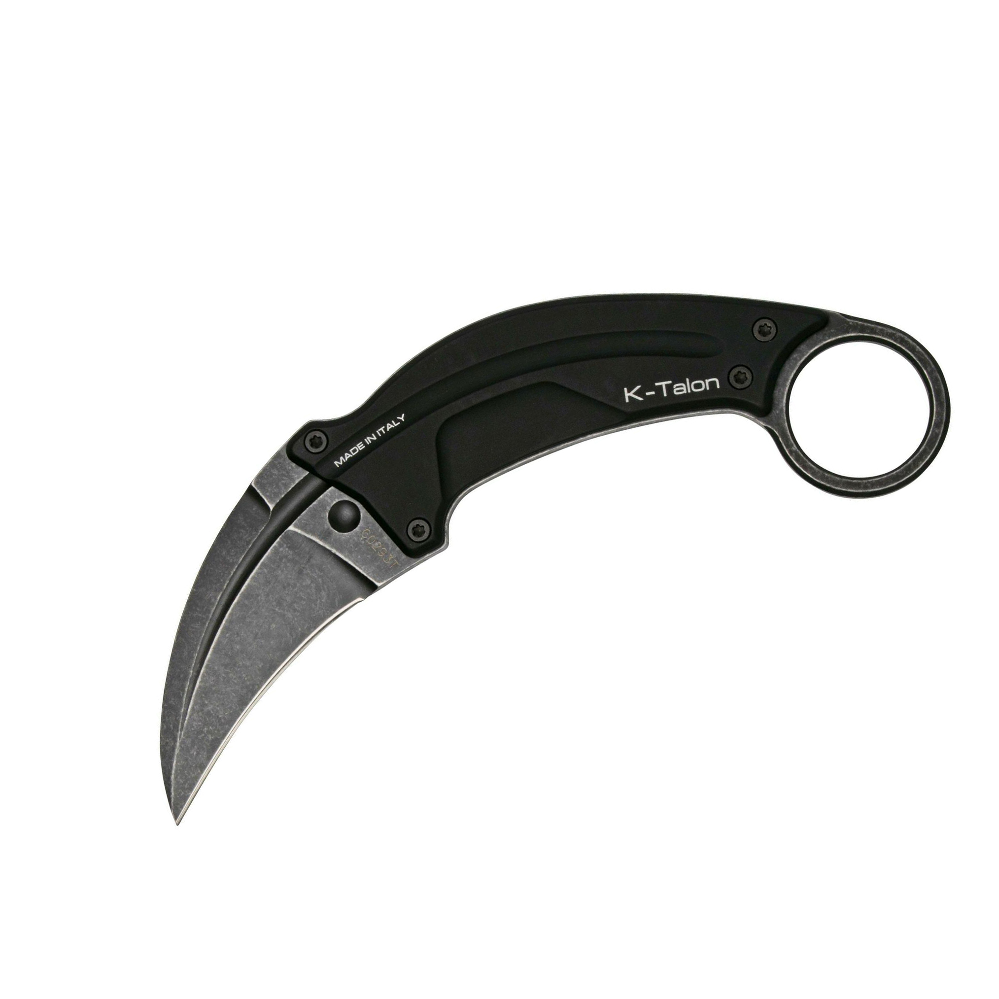 K-Talon是一种具有全柄脚结构的固定刀片卡姆比特。它的形状特别薄,包括鞘和鳞片在内的厚度仅为10毫米。弯曲的钩状刀片的灵感来自于爪子的形状。它的设计目的是进行清晰而深的切割以及钩住、抓住和/或撕裂。背面的环设计用于在任何情况下都能安全牢固地抓握。这样刀就不会打滑,并且很难解除武装并指向使用者。