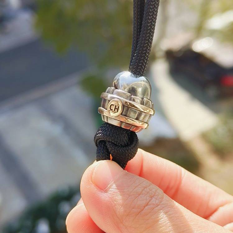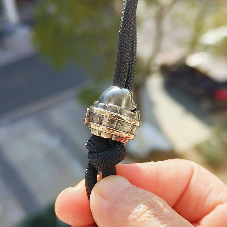 设计与工艺: Cpprhd以木桶为创意灵感,倾心打造了这款伞绳刀坠。刀坠的外层采用了铜质的木桶设计,呈现出古朴而别致的外观。而内部,一枚银质可爱骷髅被巧妙地置于其中,为整体设计注入了一份俏皮和独特。