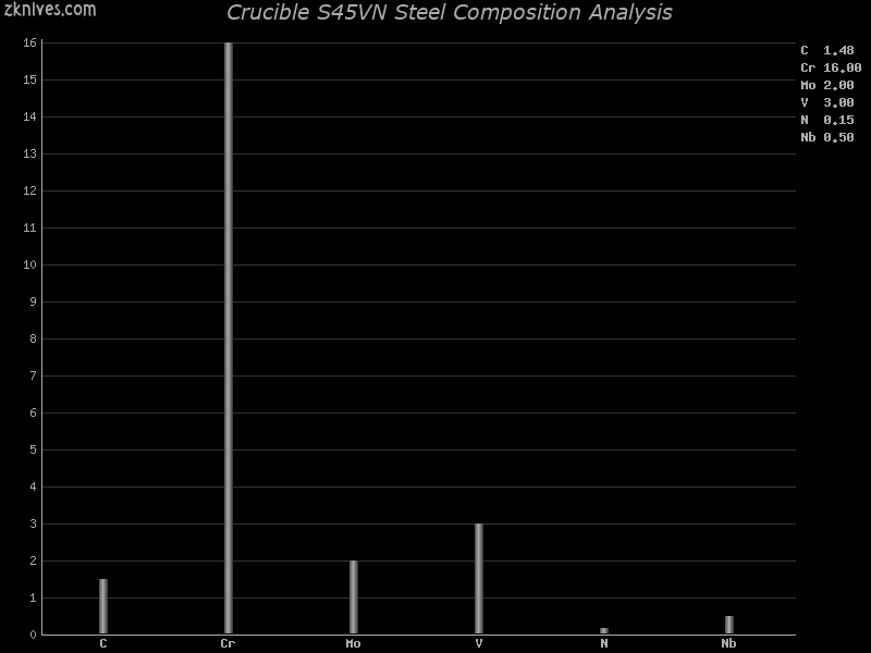 S45VN(Crucible) - Crucible 于 2019 年 11 月推出的最新刀具钢。CPM S45VN 是 Crucible 和 Niagara Specialty Metals 之间的合作产品。最初的成分由 Niagara 开发,然后由 Crucible 进行生产和最终成分的精炼。据我了解,主要亮点是新型钢材,在不牺牲任何其他性能(即韧性、边缘保持性)的情况下提高了耐腐蚀性。我猜测,是与早期的Crucible CPM S35VN 钢进行比较。根据规格,韧性略有下降,CPM S45VN 在 C 槽口上的重量为 11 磅,而CPM S35VN 钢为 12 磅,但比早期CPM S30V 钢的 10 磅更好。同样,与 CPM S35VN 钢相比,CPM S45VN 在 CATRA 测试结果中的边缘保持力(所有百分比数字均相对于AISI 440C 钢)略好,分别为 143% 和 140%,略差于CPM S30V 钢- 145% 。因此,纯粹根据技术规格,它的韧性和刀刃保持力介于两者之间,但差异足够小,因此刀刃几何形状和热处理将更加重要。尽管如此,在 Larrin 的测试中,与CPM S30V 钢相比,CPM S45VN 在更高的硬度下表现出更好的韧性。我认为这要归功于 CPM S45VN 更精细的微观结构,除其他因素外,这可归因于以其非常精细、坚硬的碳化物而闻名的铌的存在。目前,还没有 CPM S45VN 制成的刀具,但这种情况很快就会改变。我猜测 CPM S45VN 将被定位为CPM S35VN 钢和CPM S30V 钢的替代品。