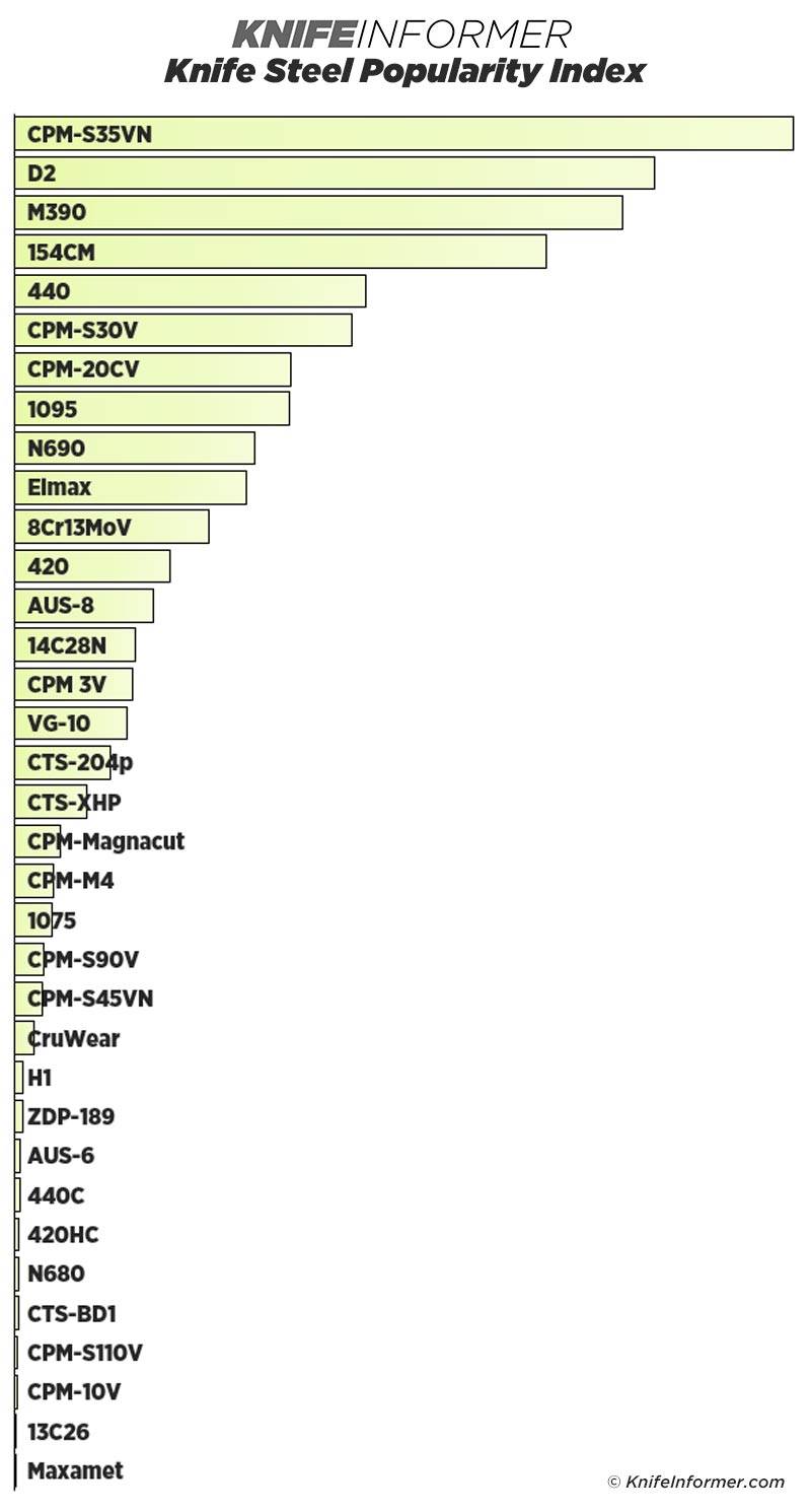 我们的刀具钢材受欢迎程度指数向您展示了目前主要制造商在折叠刀生产中使用的不同钢材的相对受欢迎程度。该指数很大程度上受到消费者偏好和生产成本等因素的影响。