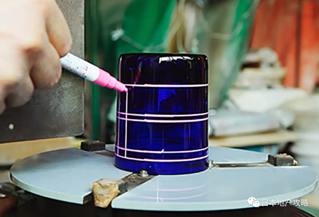 因为制作切子的花纹时,是不打草稿,全靠匠人的匠心独运和临时反应能力的,所以需要在玻璃杯上画出基本的分度装置,简单来说就是画几条横竖线条,让匠人在制作花纹的时候对花纹的大小、尺寸有个把握。