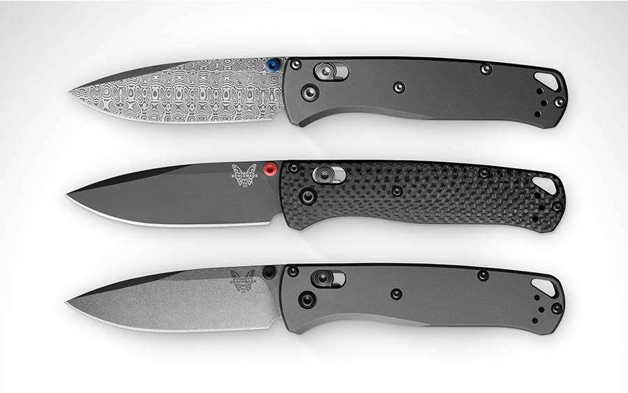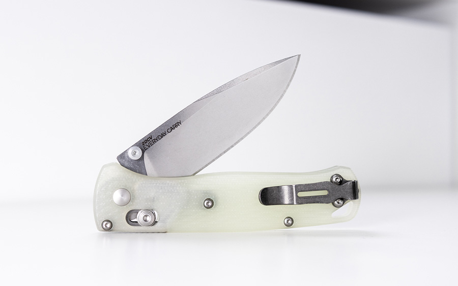 Bugout 的所有版本均采用优质不锈钢。原始 Bugout 采用 CPM-S30V 不锈钢。较新版本的刀采用超优质不锈钢,如 CPM-S90V 和 Böhler M390。这些刀片钢具有卓越的硬度、锋利度和边缘保持力。至于手柄,标准 Bugout 采用 Benchmade 所称的 Grivory 材料,类似于玻璃纤维增强尼龙,但具有触感和抓握感。一些高端 Benchmade Bugout 具有碳纤维鳞片,这使得这款轻质刀变得更轻,同时在加工过程中赋予它一种优雅的感觉。