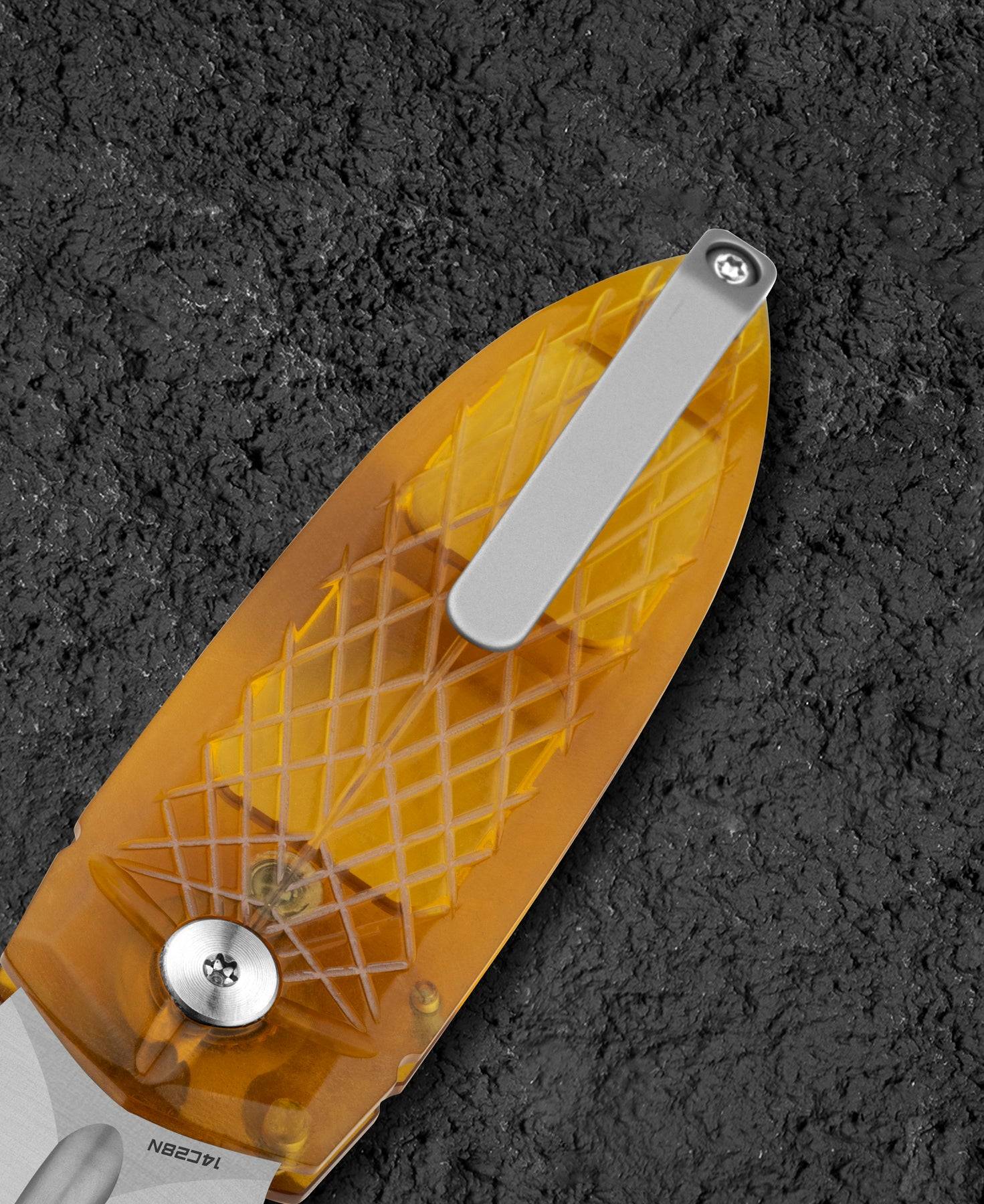 该折刀的刀片采用14C28N钢材,经过黑色DLC处理,提供出色的耐用性和刀刃保持性能。刀片长2.20英寸(56毫米),厚度为0.118英寸(3.0毫米),适合各种日常使用和轻型任务。