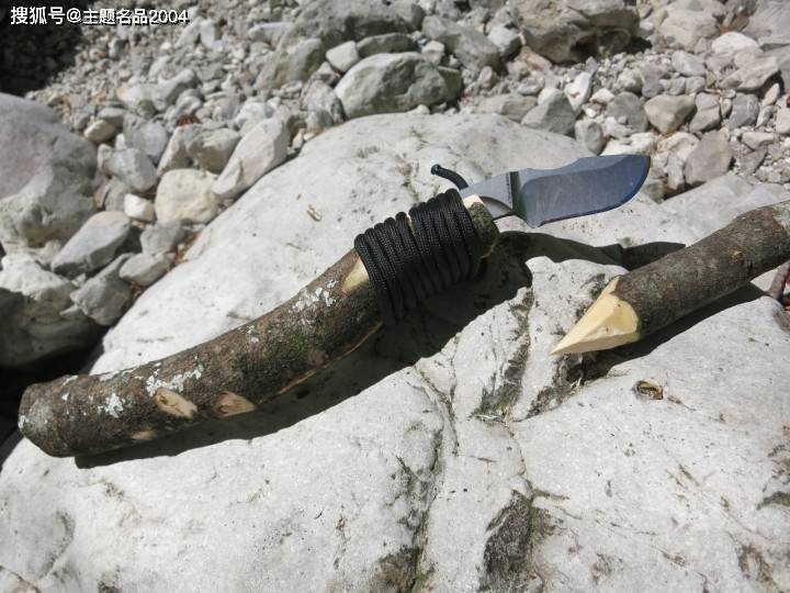 比如说制作一支矛,用刀将棍子的一头分开,然后将刀柄放进去,再用绳子捆扎。