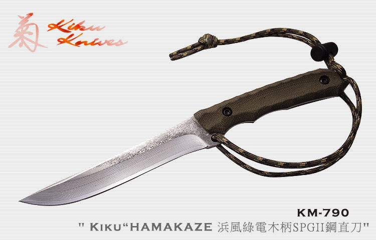Kikumatsuda 松田菊男 KM-790 HAMAKAZE 浜风轻量版狩猎直,亦可作为专业鱼刃。菊男是狂热的钓鱼爱好者,在野外处理鱼肉需要专业的锋利刃具,最不容易生锈,容易打理。于是有了这款浜风,它修长锋利,使用SPG2钢,抗锈性能极佳。