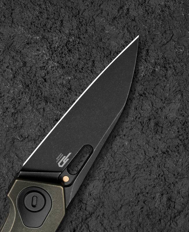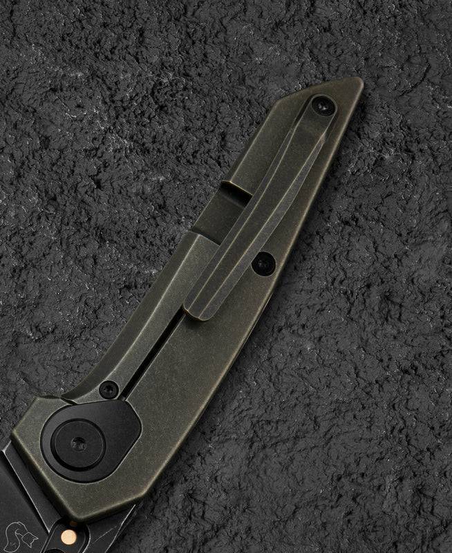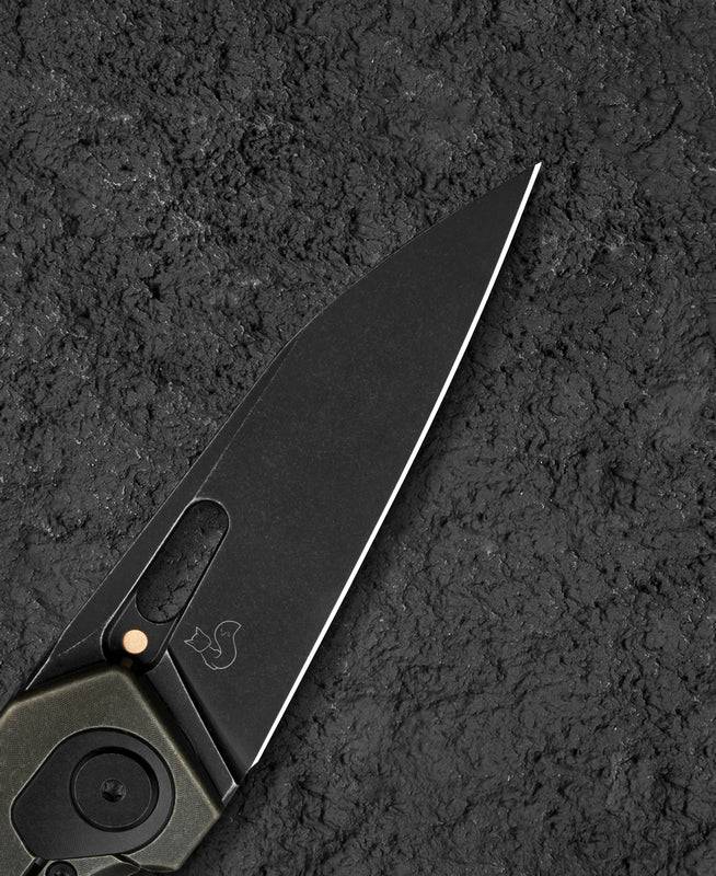 刀片材质:Elmax 刀片表面:黑色石洗 手柄材料:钛 手柄颜色:黑色+古铜色石洗 总长度:180.6 毫米 闭合长度:108.1 毫米 刀片厚度:3.2 毫米 枢轴环:钛,黑色 PVD 螺丝:钢,黑色 PVD 刀片镶嵌:红铜 夹子:钛、黑色+古铜色石洗 后垫片:钛、黑色+古铜色石洗 滚珠轴承:陶瓷