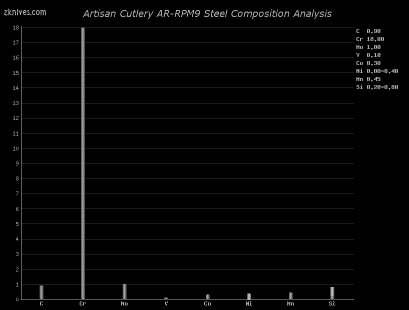 AR-RPM9 是 Artisan Cutlery 品牌的专有合金钢材,于 2020 年中期推出。作为廉价刀具的 PM 钢(粉末钢)进行推广。实际的钢铁生产商目前尚不清楚,据猜测有可能是长江不锈钢金属公司(仅为参考,不可作为事实依据),这个猜测来源于 Artisan Cutlery 采用过长江不锈钢金属公司制造的 8Cr13MoV 不锈钢,从已知的信息来看,应该比440A以及440B传统的廉价不锈钢有所改进。